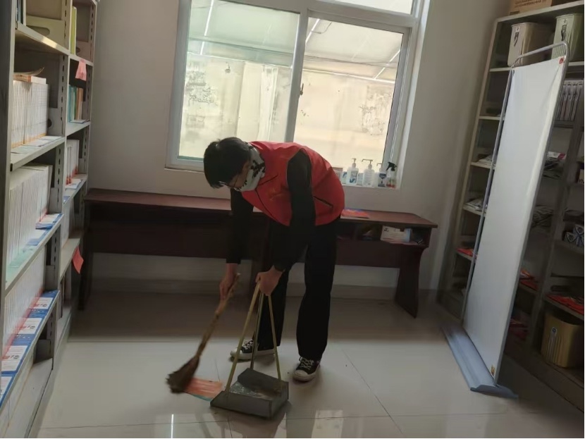 清晨的社区里,暖阳驱散了初春的寒意。实践队的志愿者们早早来到社区服务中心,与社区工作人员对接后,迅速投入工作。首先实践队员来到社区书屋,承担起报刊整理与场地清洁的任务。书屋的报刊架上,各类报纸杂志因长期翻阅略显杂乱。队员们蹲在架前,按日期和类别将报纸逐一整理归位,又仔细擦拭了报刊架的灰尘。随后,他们拿起扫帚和簸箕,对书屋地面进行清扫,不放过任何一个角落。原本散落的纸屑被清理干净,书架与地面焕然一新,为居民营造了整洁舒适的阅读环境。