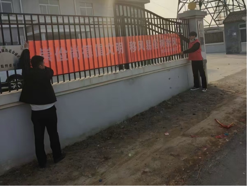 与此同时,队员负责“崇俭尚德倡文明,移风易俗树新风”主题横幅的张贴工作。他们带着工具来到社区入口的围栏旁,细心测量间距、调整角度,确保横幅平整醒目。红色的标语在阳光下格外鲜亮,既为社区增添了文明宣传的氛围,也让过往居民直观感受到移风易俗的号召。
