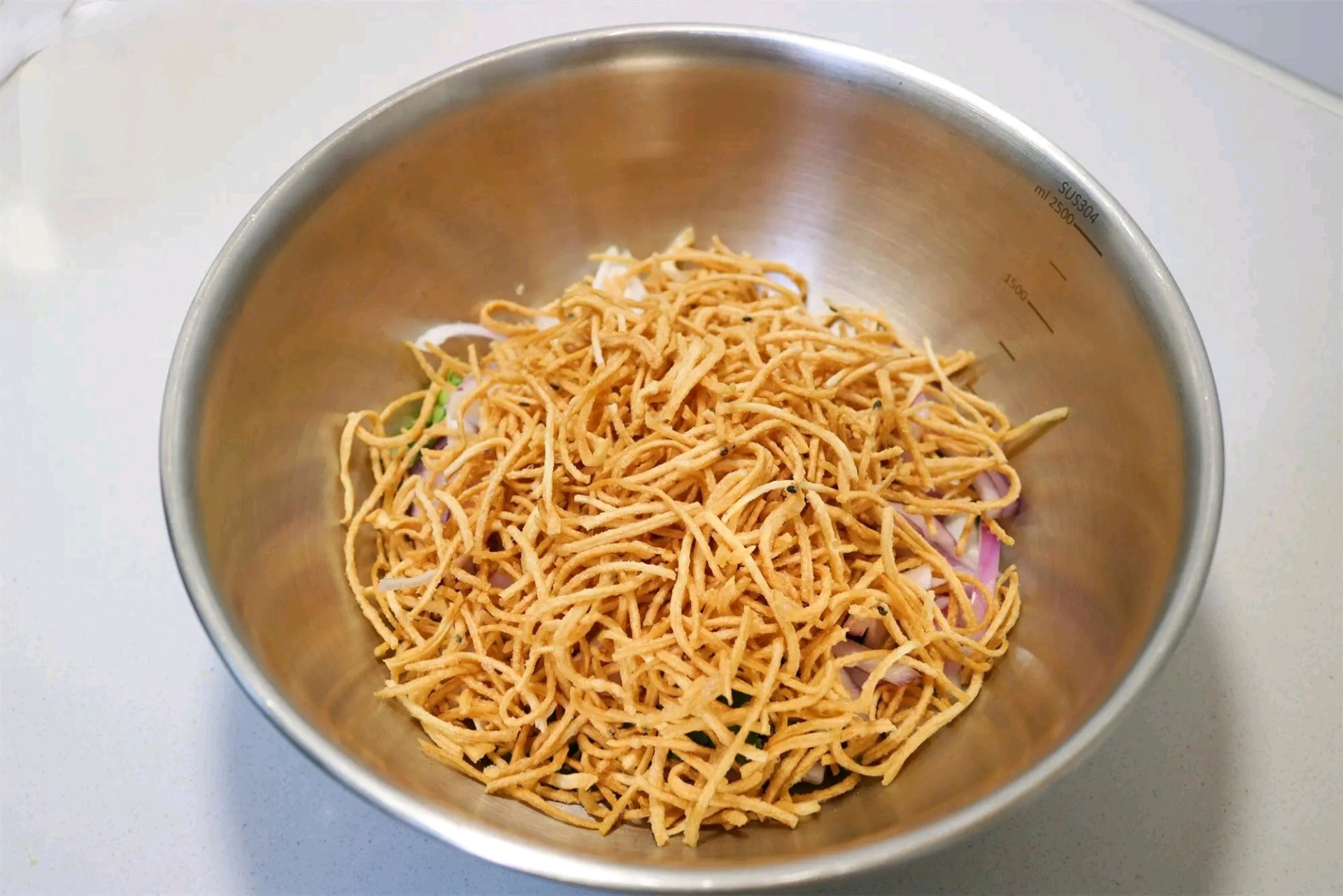 4、把馓子掰碎,和洋葱、香菜放一起。