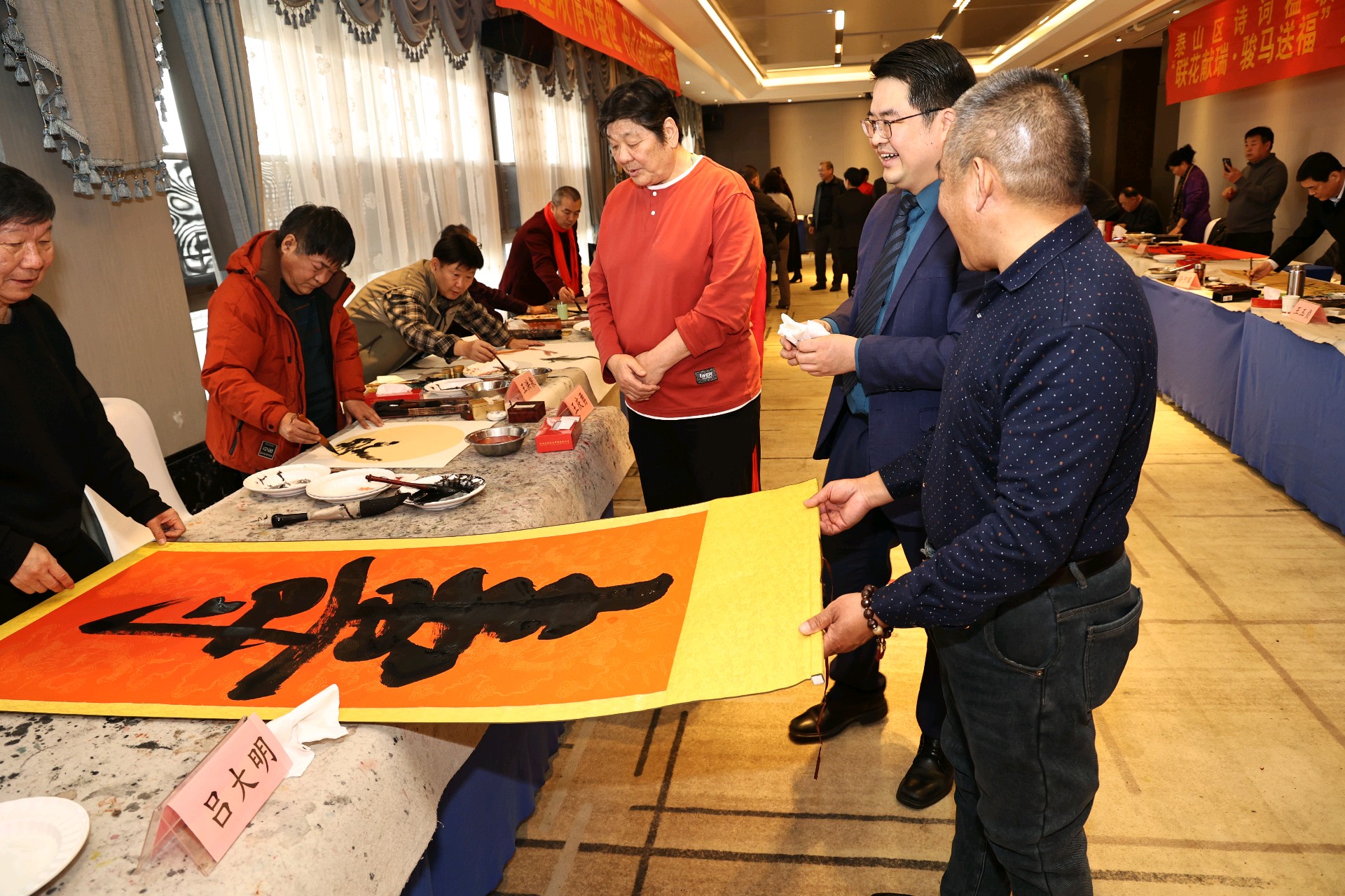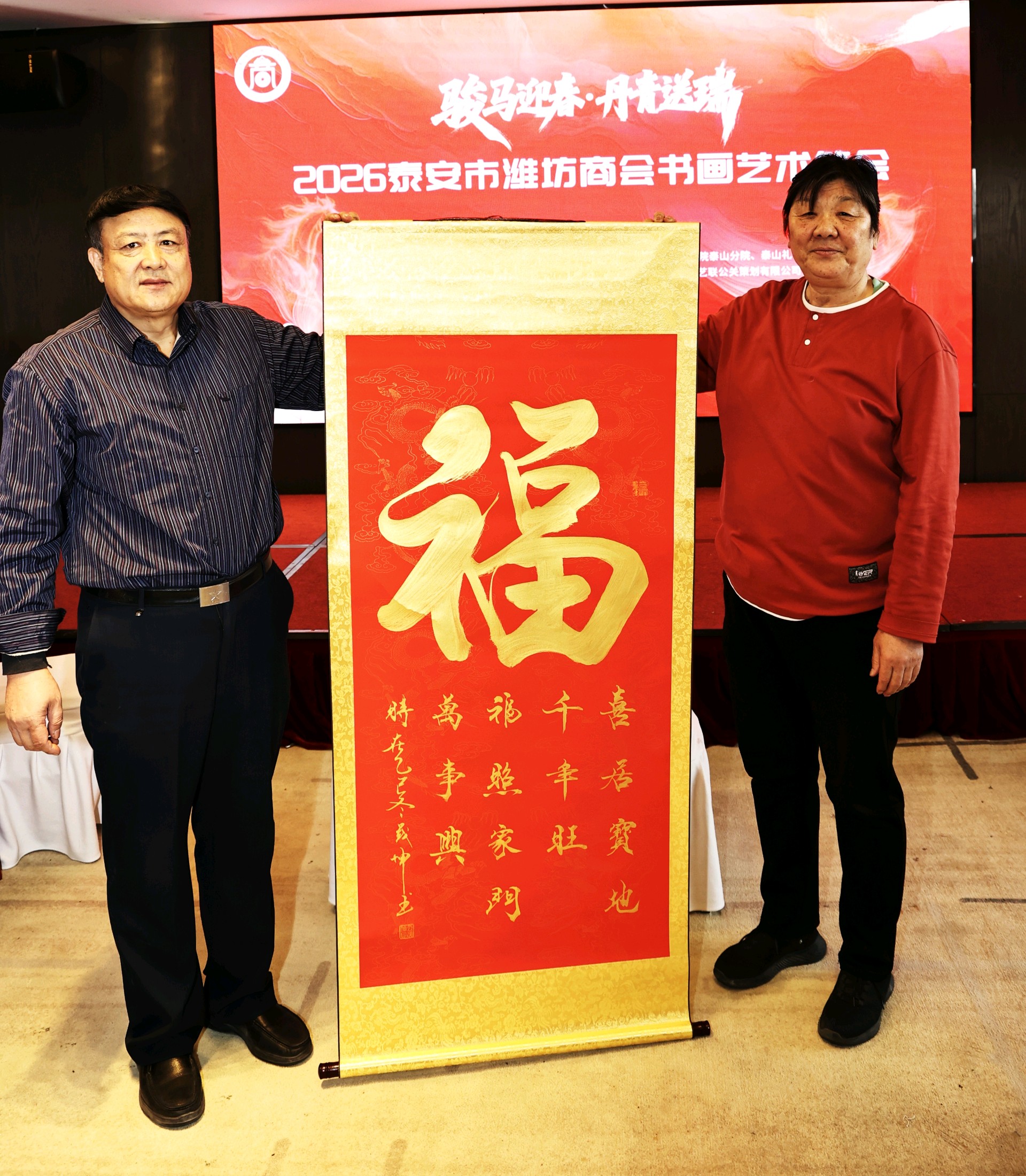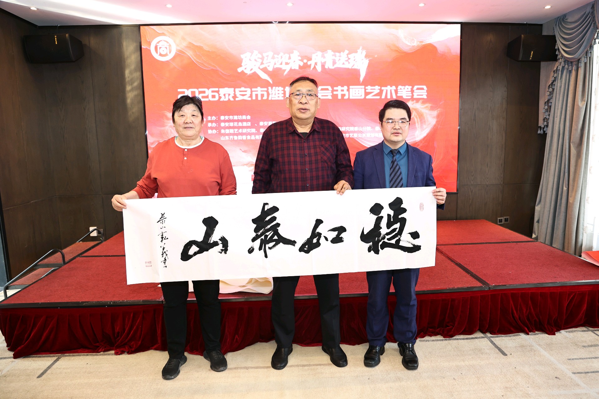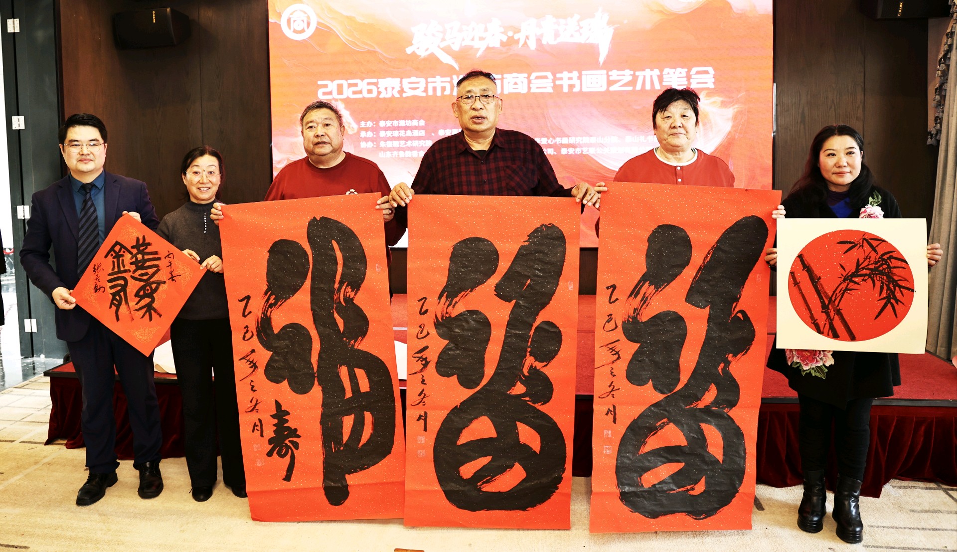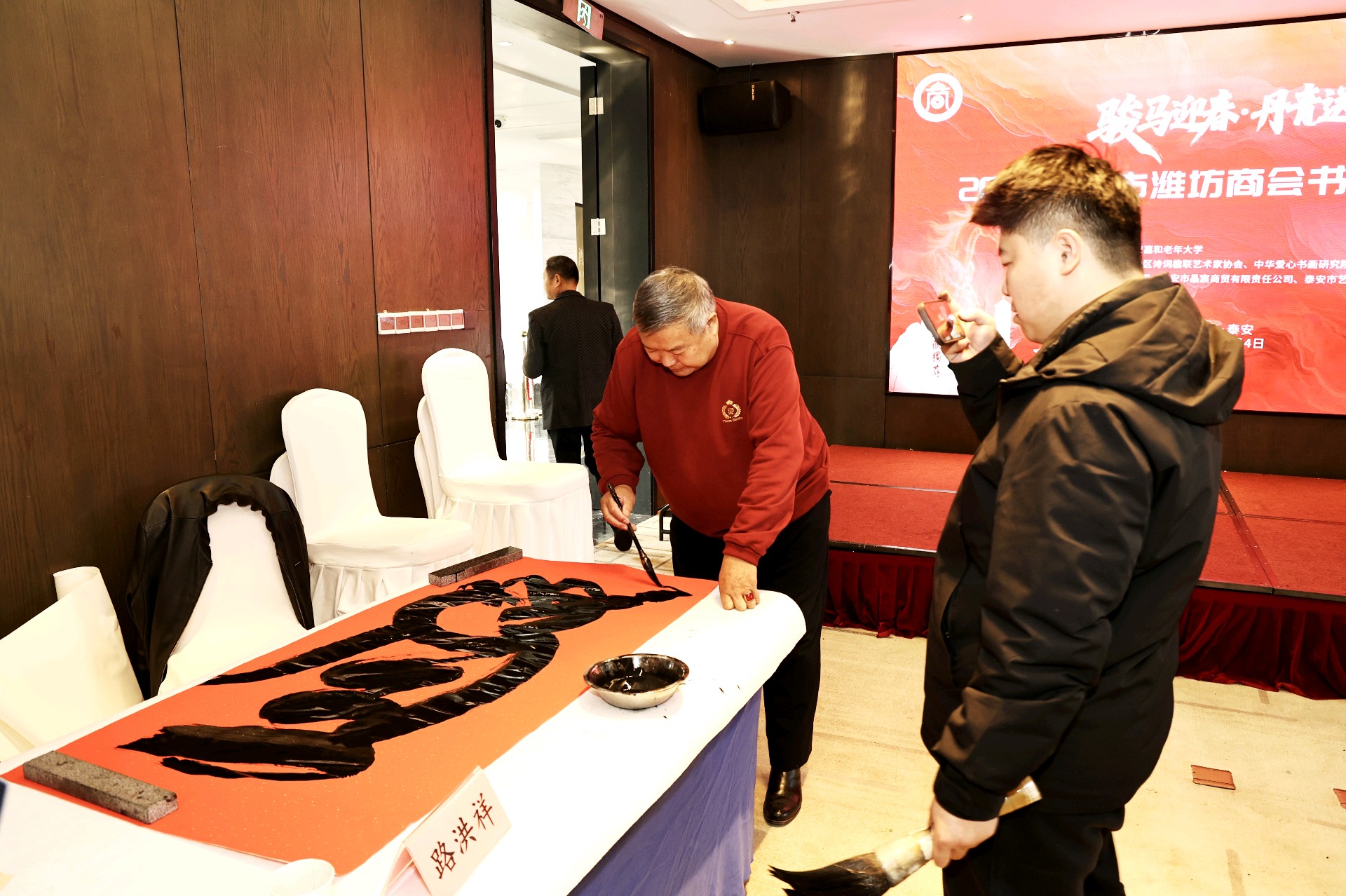 春潮涌动,墨香满庭;乡音未改,情谊绵长。甲辰马年新春前夕,2月4日,泰安市潍坊商会2026年“骏马迎春·丹青送瑞”迎新春送祝福书画艺术笔会在琼花岛酒店圆满落幕。这场商会换届后的重磅文化活动,以书画为媒、以新春为契,汇聚原市级老同志张庆明、孙士杰先生,孔祥湖先生、赵中梅女士以及何树华、路洪祥、吕大明、张范义、李光富、公茂坤等一众书画名家,商会各位会长、同仁及主办方工作人员宗建、李振亭、景春梅,在笔墨流转间传递美好祈愿,在文化交融中凝聚发展共识,既为泰安与潍坊两地情谊添上浓墨重彩的一笔,更为商会新征程注入了蓬勃的文化活力与奋进力量。