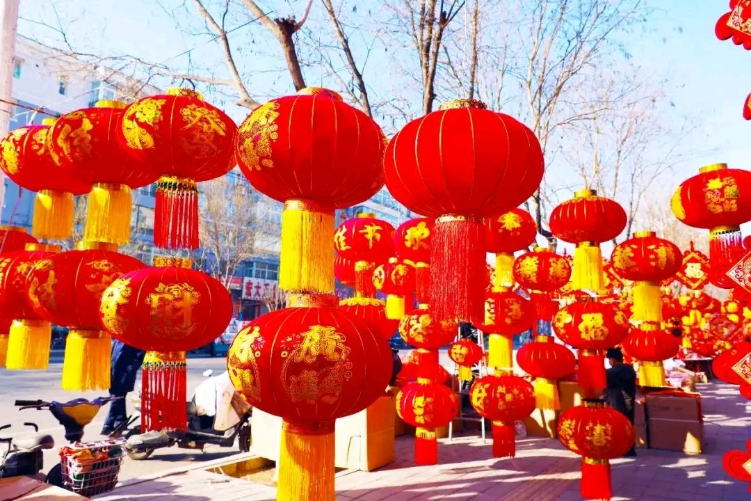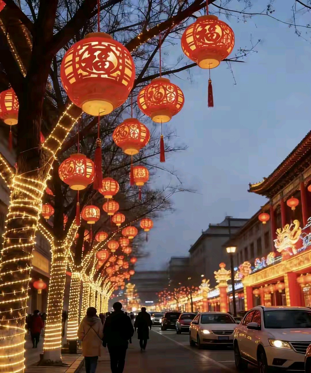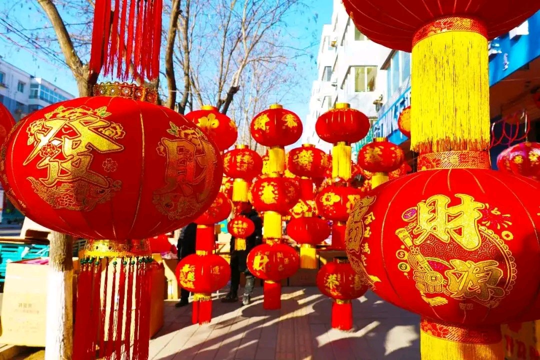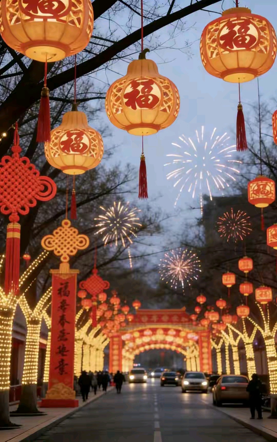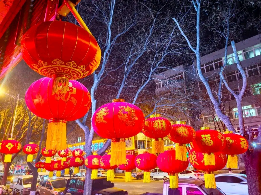 迎新春红红灯笼挂满街道树木亮化风景真漂亮!