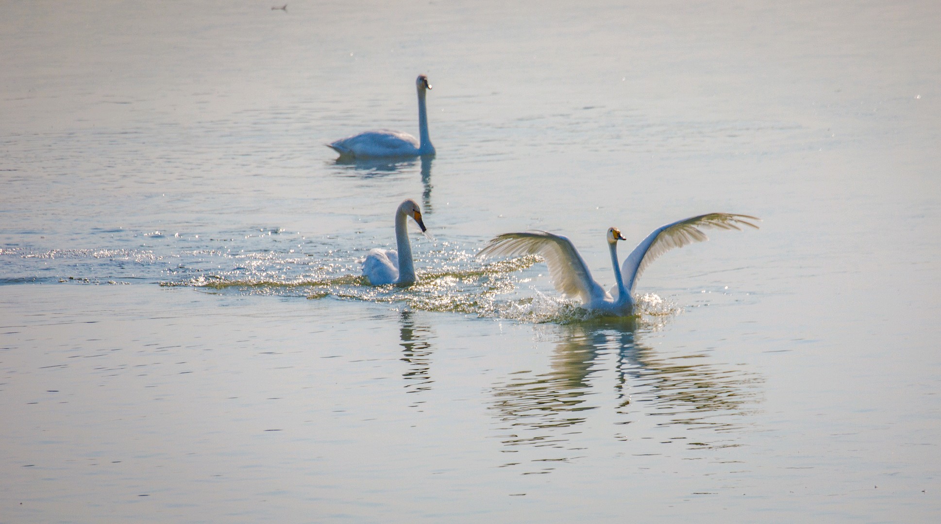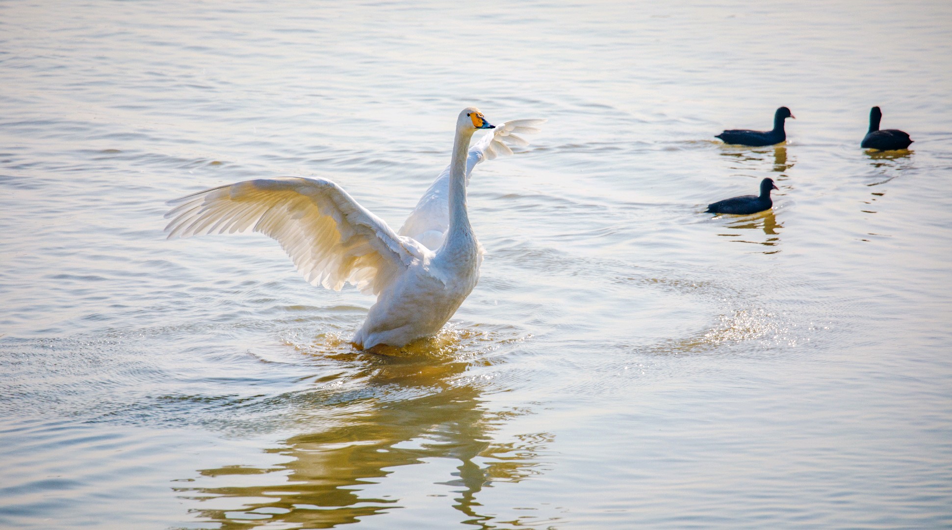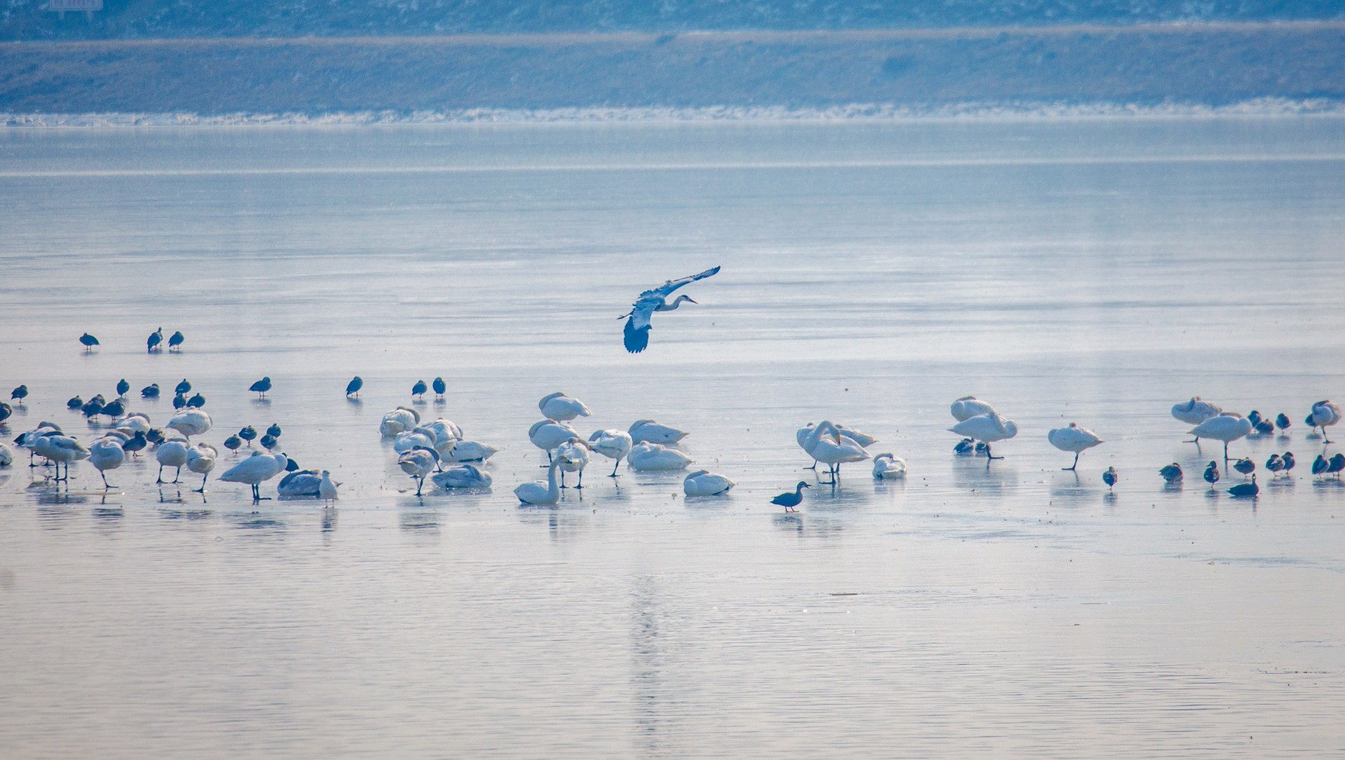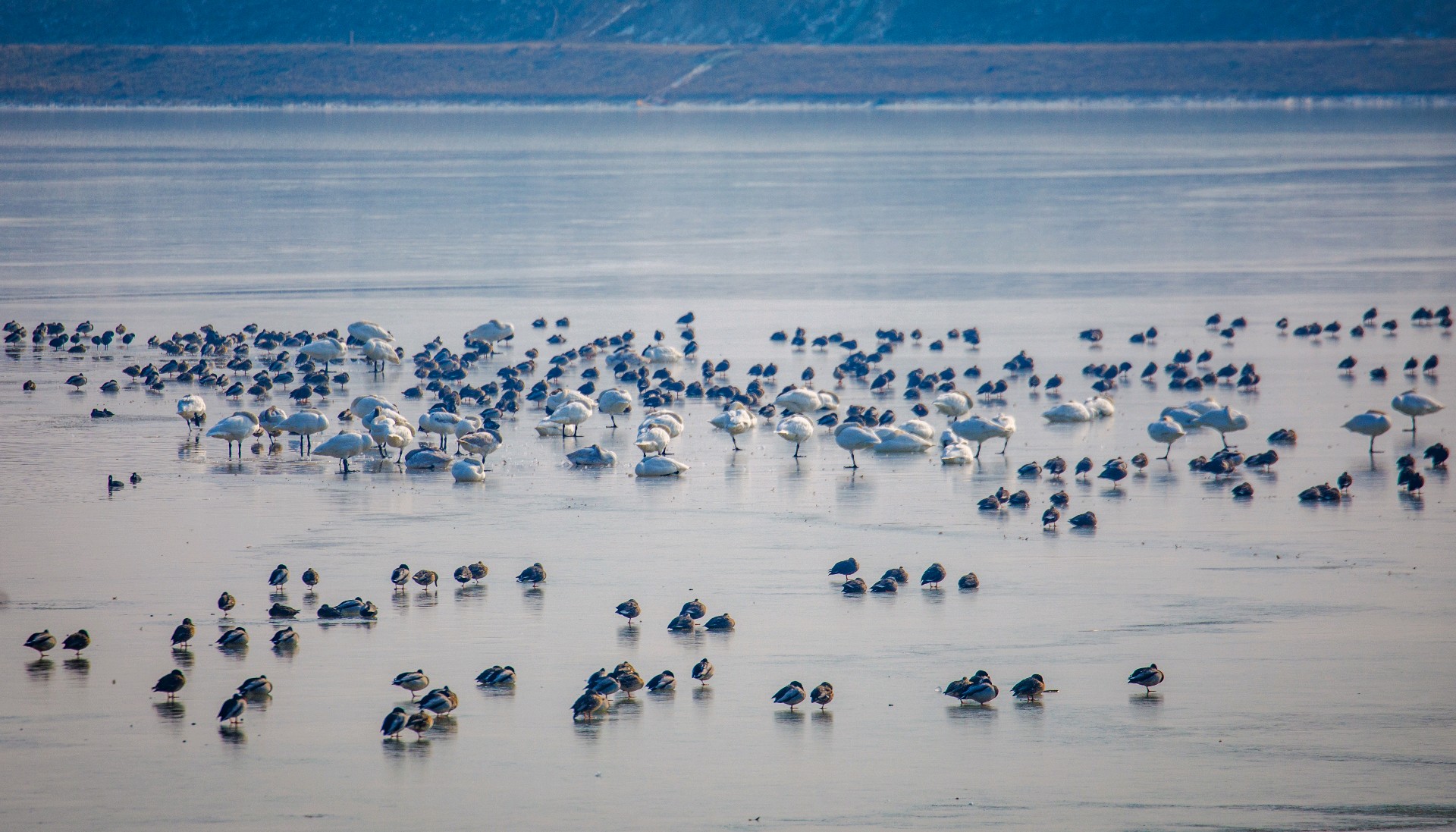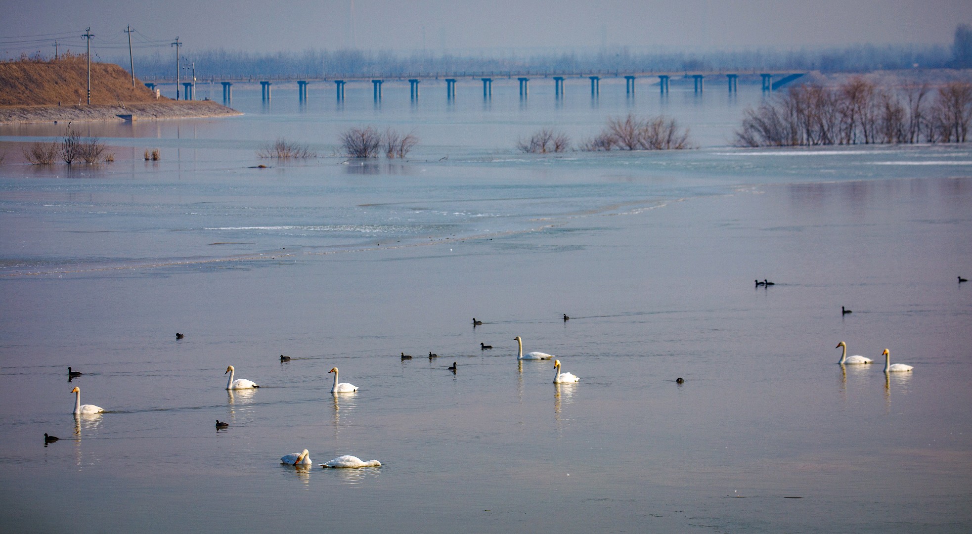 黄河北岸南范村鹊山水库沉沙池,已成济南城郊“天鹅湖”。40余只天鹅在此越冬,或卧冰休憩,或游弋觅食,姿态优雅。野鸭、白鹭等候鸟也来栖息,身影灵动。市民慕名而来,用镜头定格冬日里人与自然和谐共生的生态美景。
