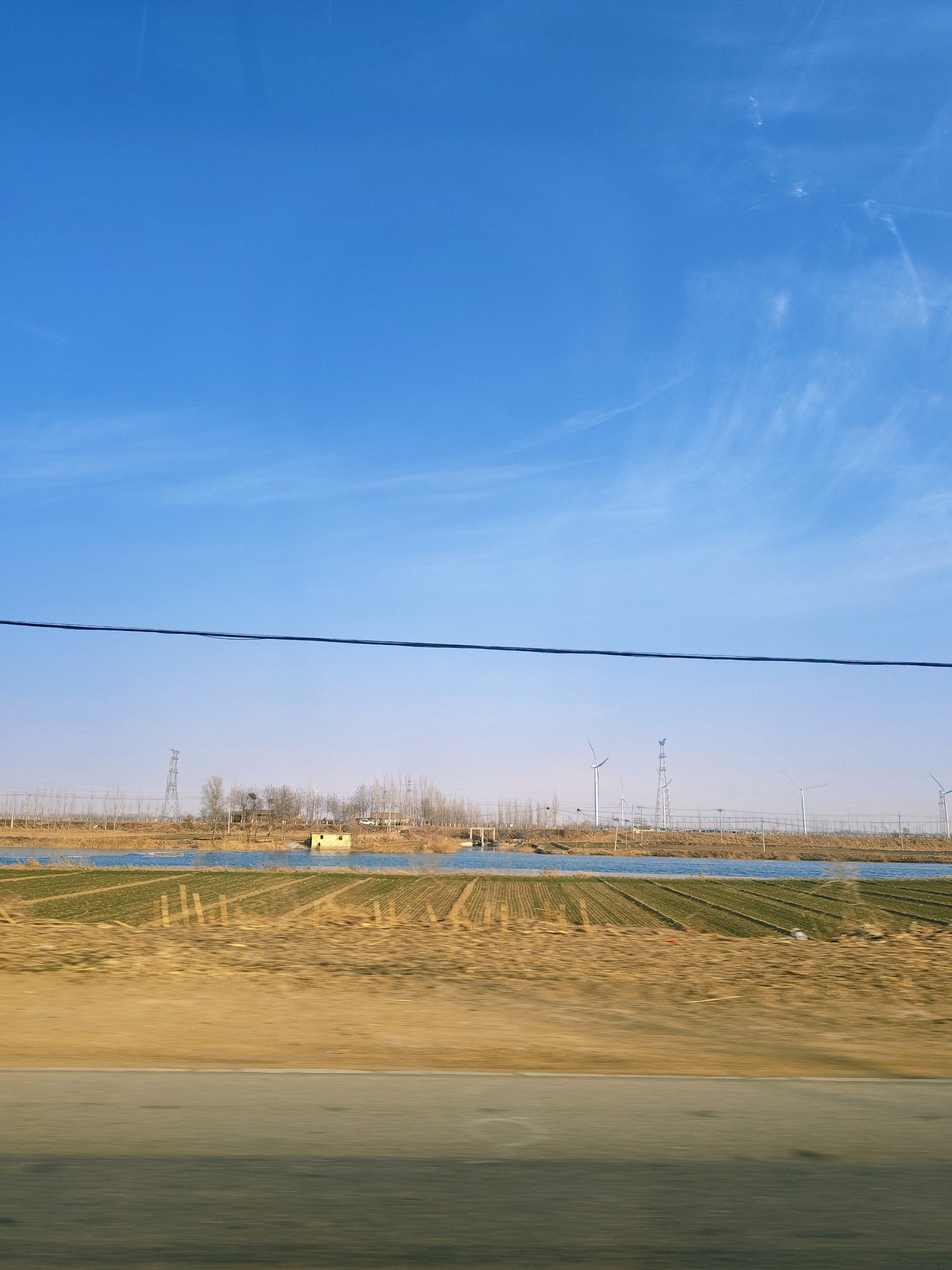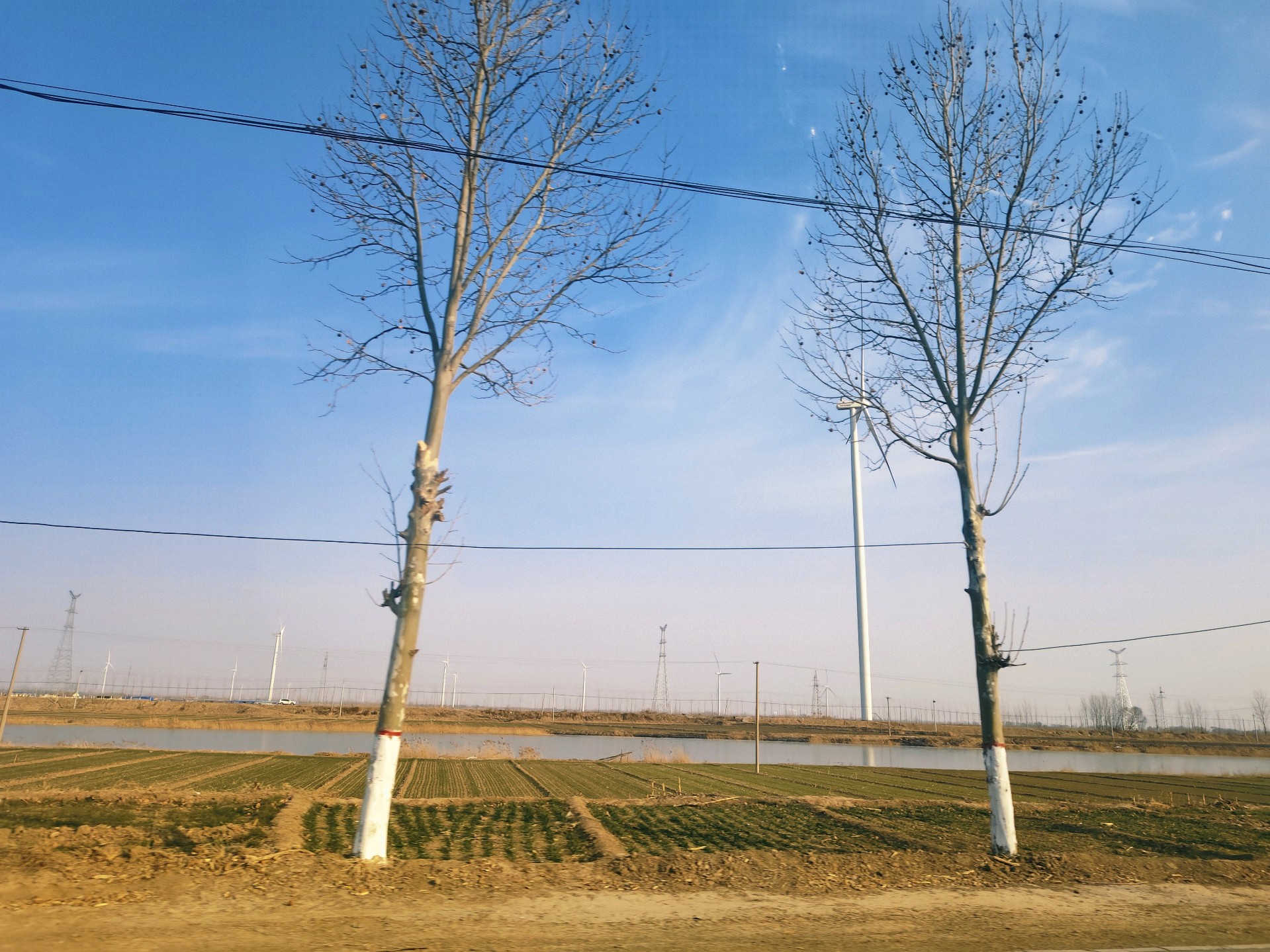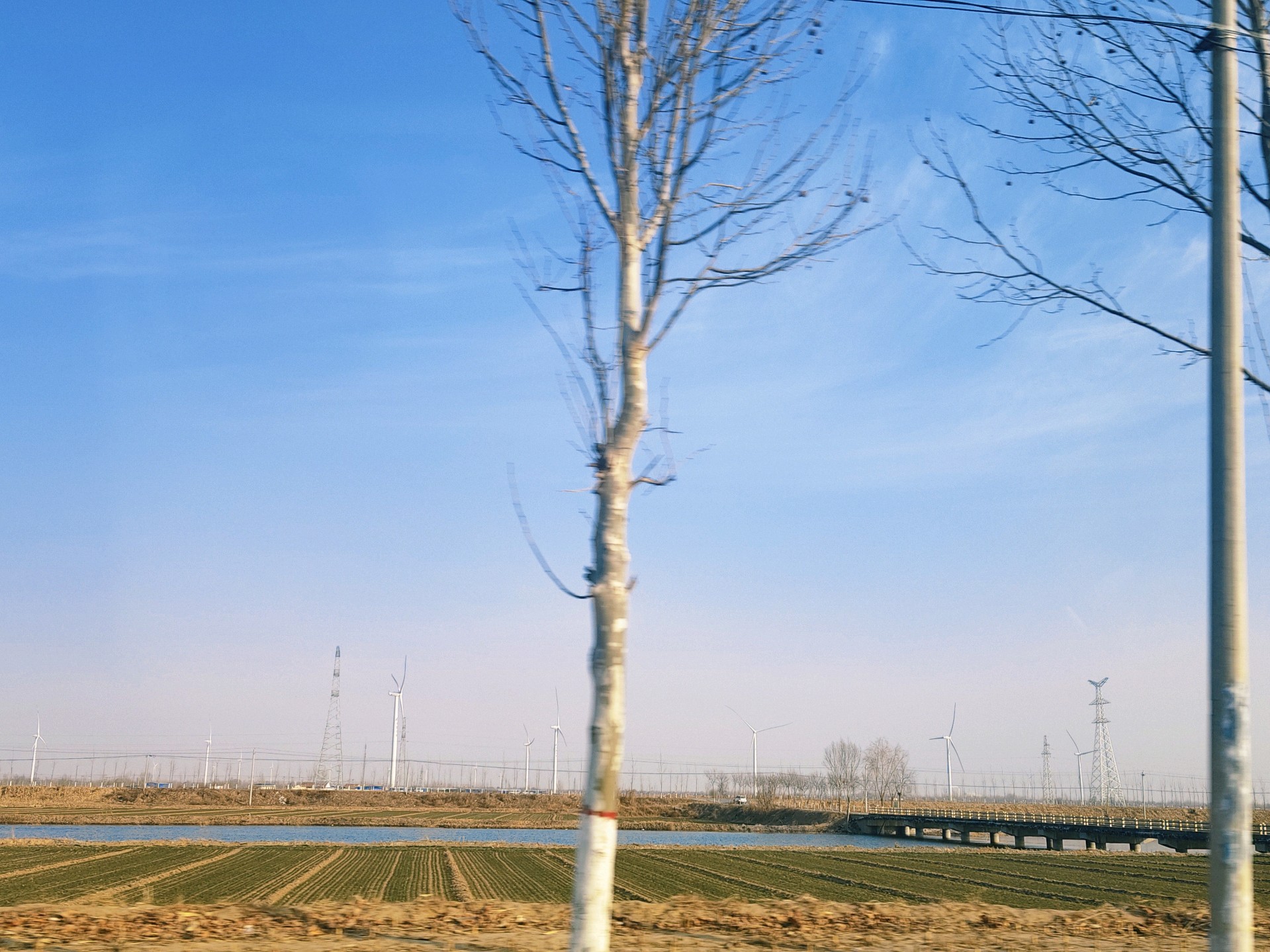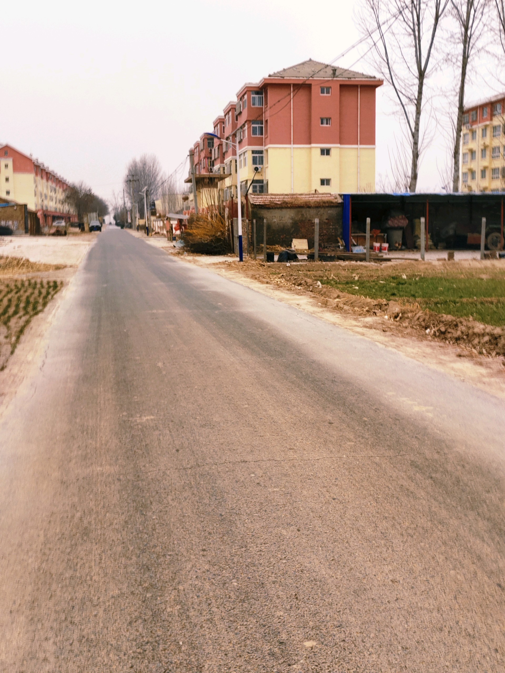 一条大路通向远处的农家屋舍,映着蓝天的河水湛蓝清澈。