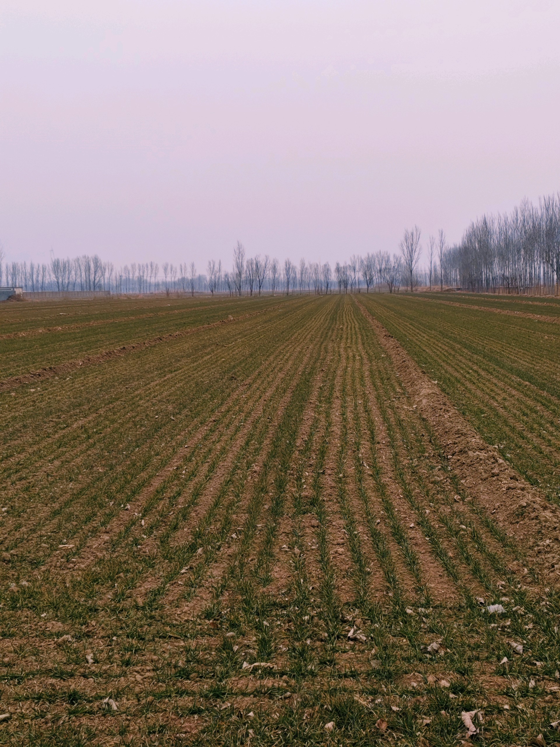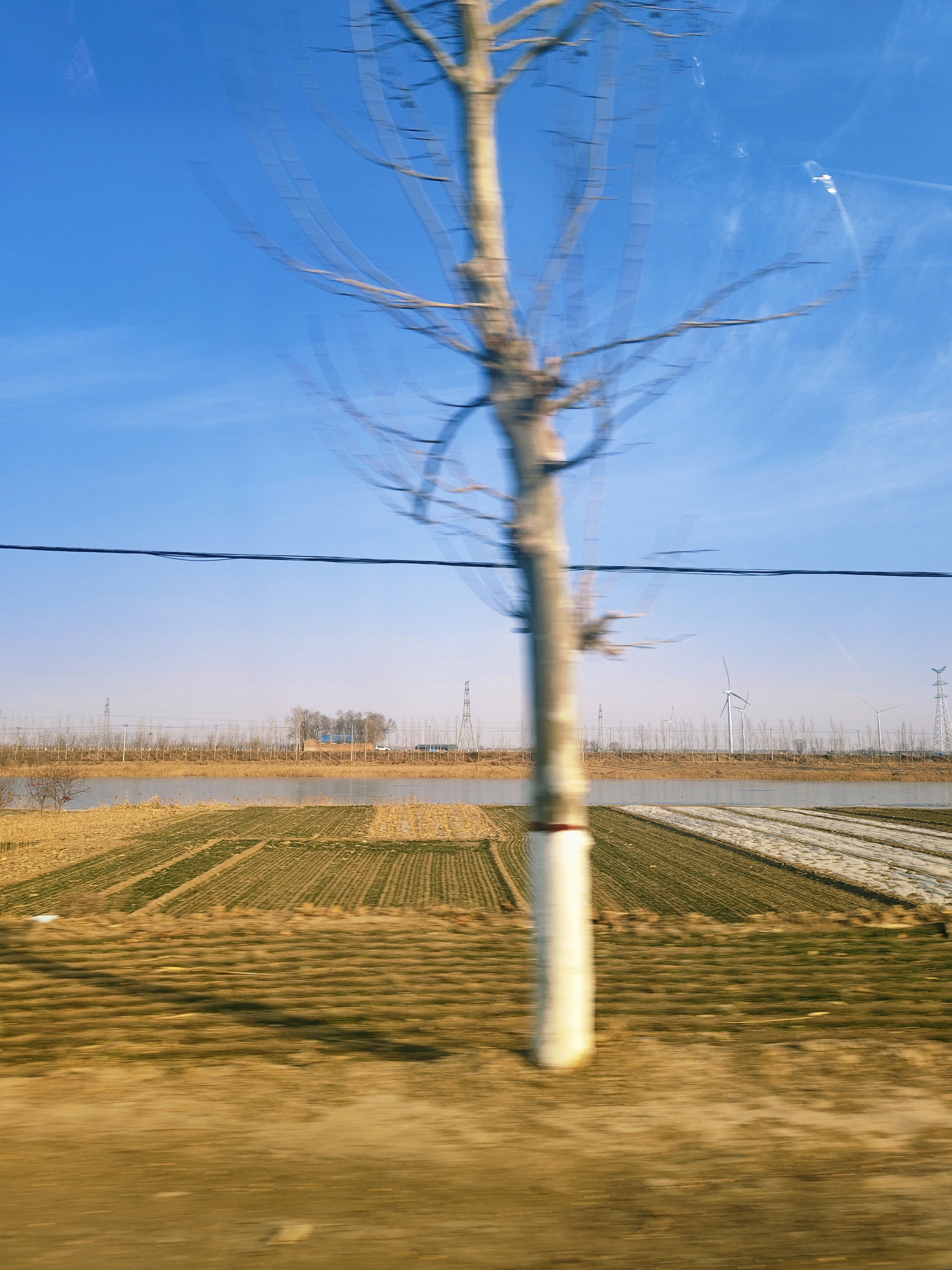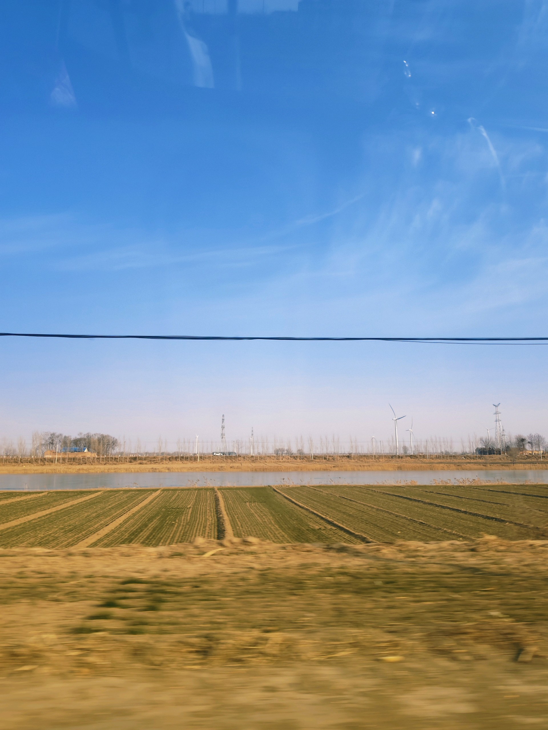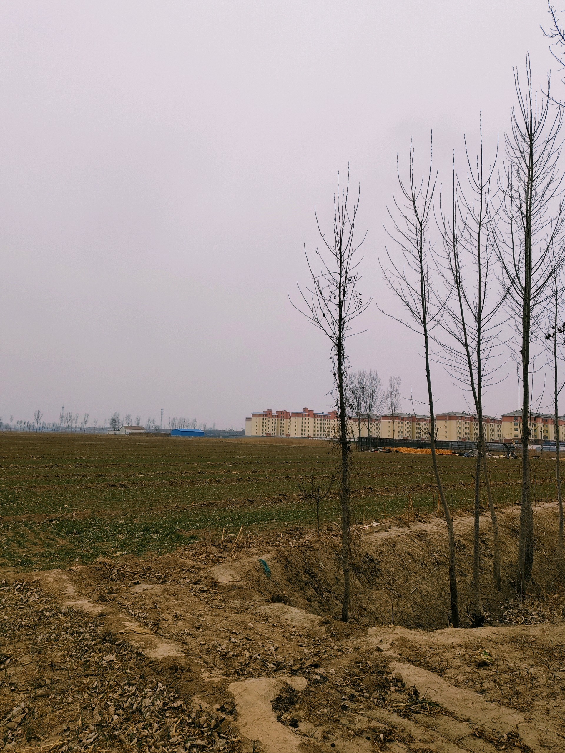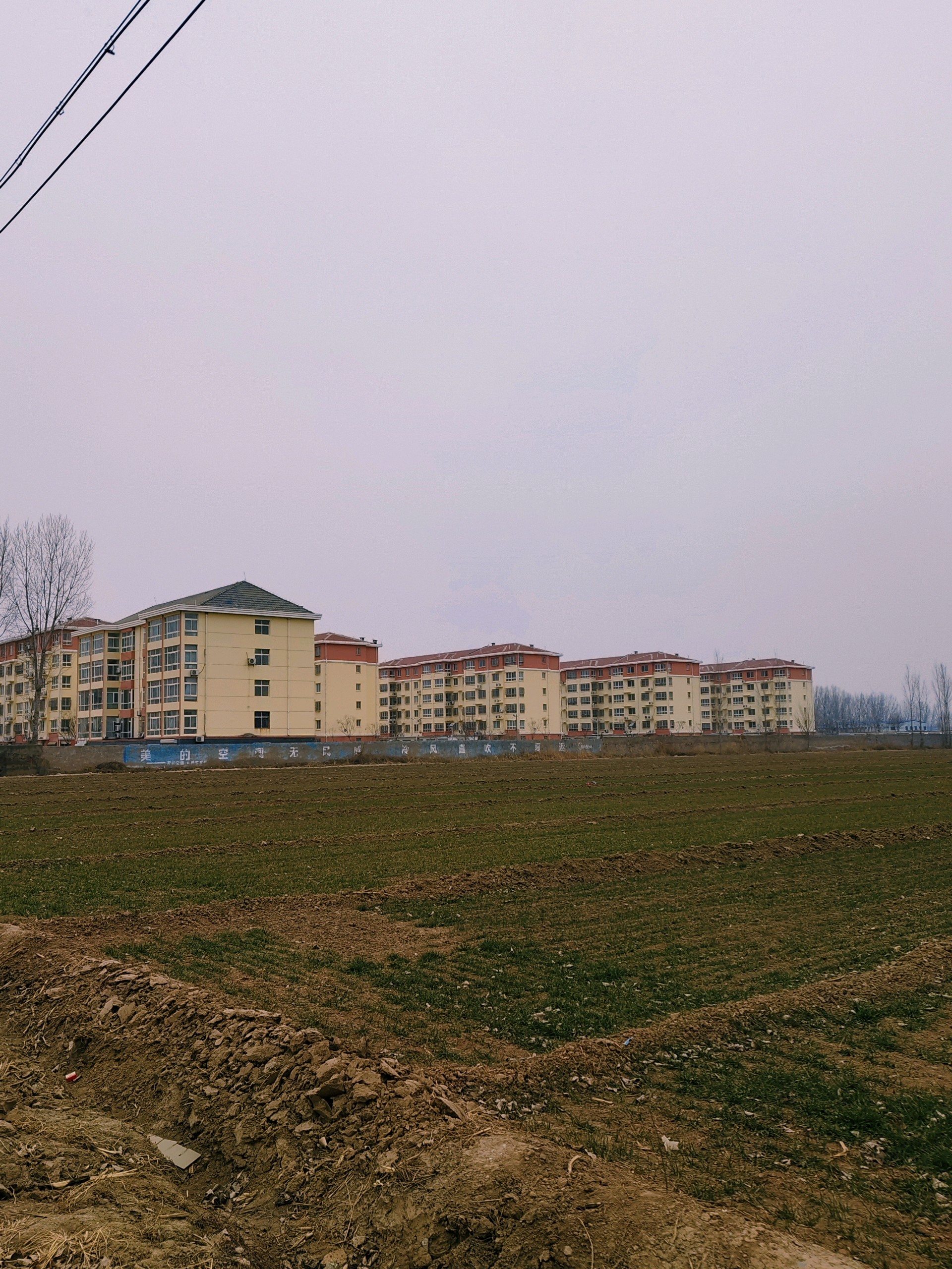 一条大路通向远处的农家屋舍,映着蓝天的河水湛蓝清澈。