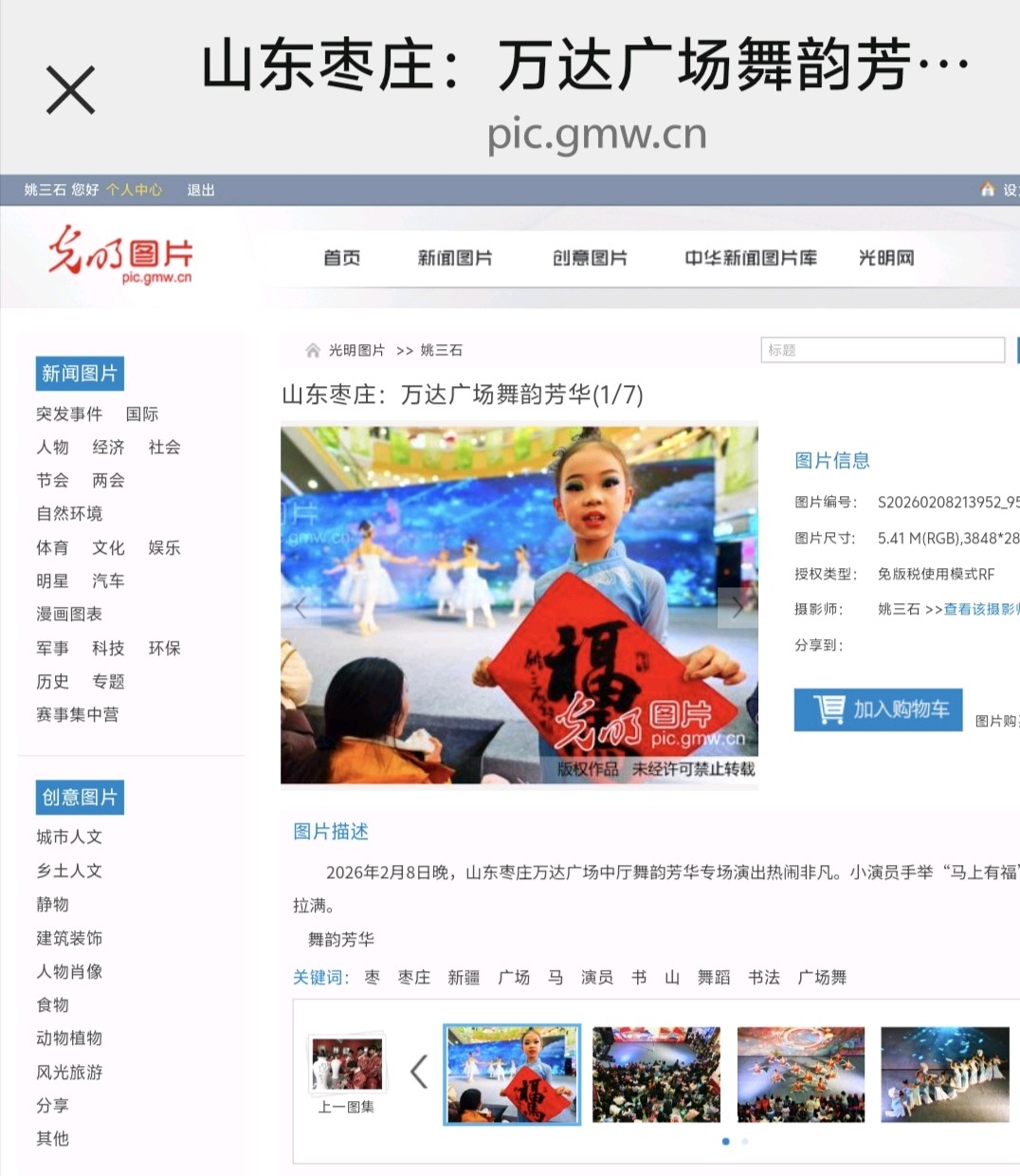 光明网发表姚三石摄影新闻《山东枣庄:万达广场舞韵芳华》2月8日,光明网发表光明图片签约摄影师,山东省摄影家协会会员姚三石摄影新闻作品《山东枣庄:万达广场舞韵芳华》(组图7幅)。山东枣庄:万达广场舞韵芳华2026年2月8日晚,山东枣庄万达广场中厅舞韵芳华专场演出热闹非凡。舞者们身着彩衣,演绎民族舞、古典舞等节目,现场人头攒动,小演员手举“马上有福”书法作品,年味拉满,共迎新春佳节。(姚三石 摄影)
