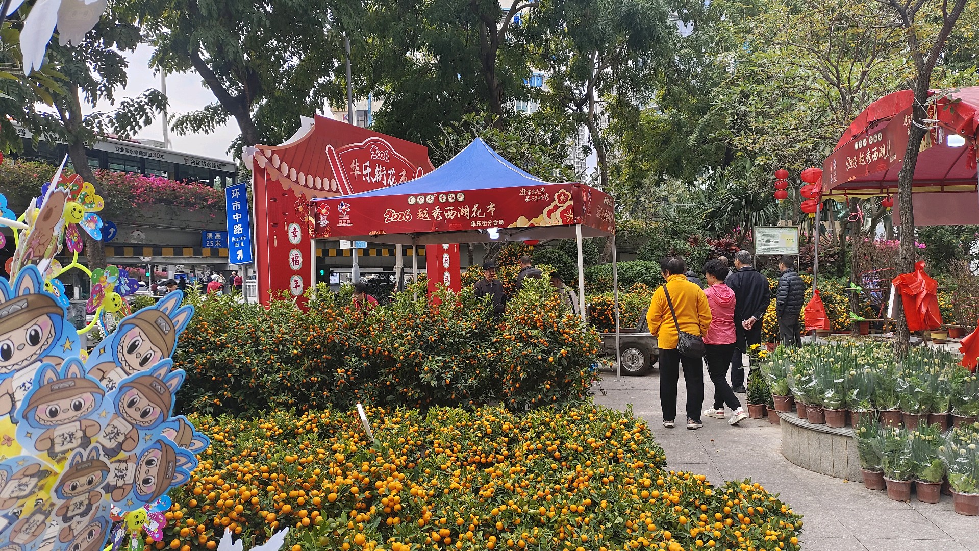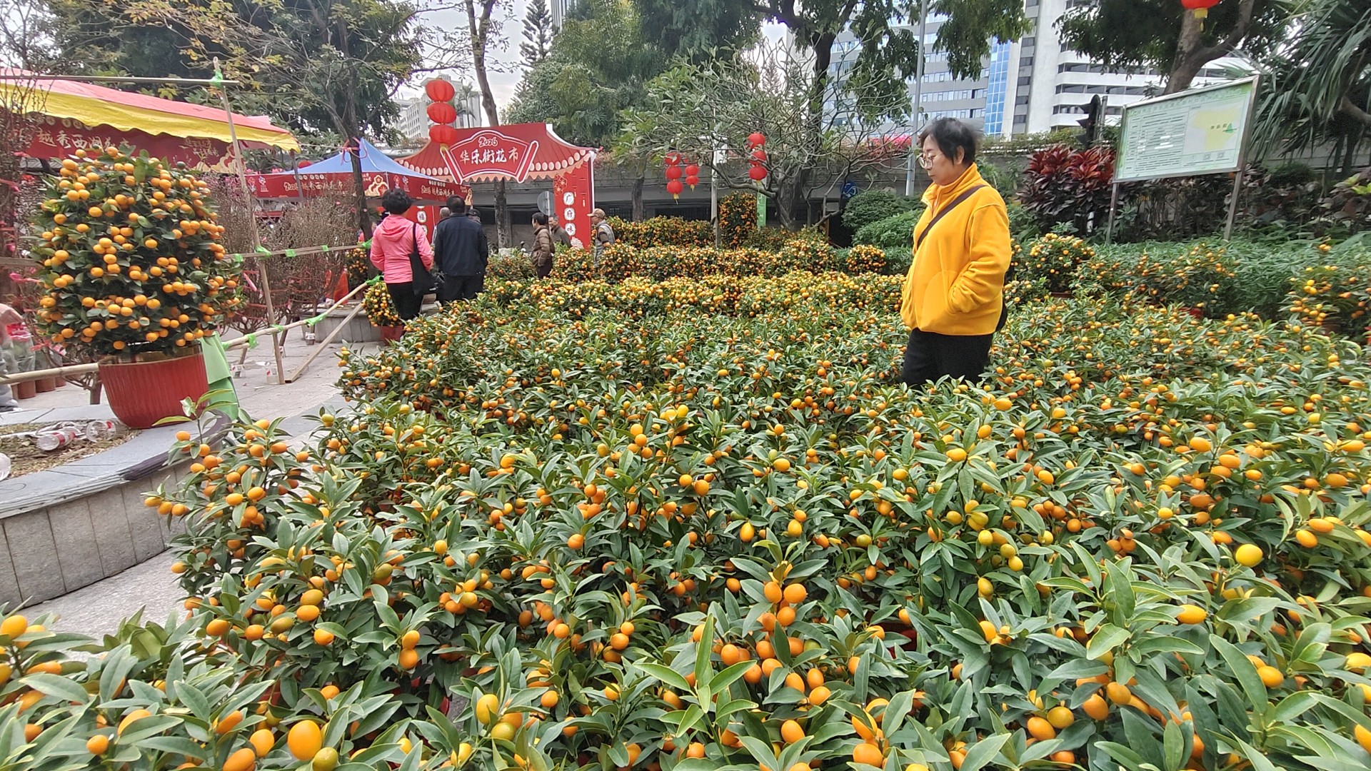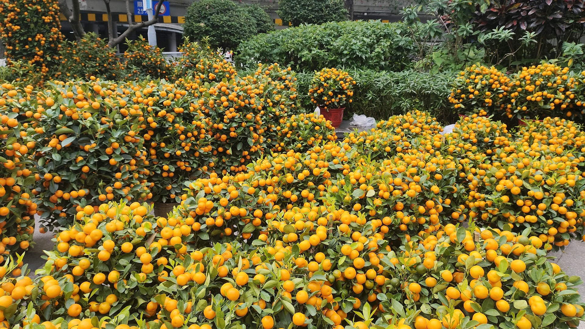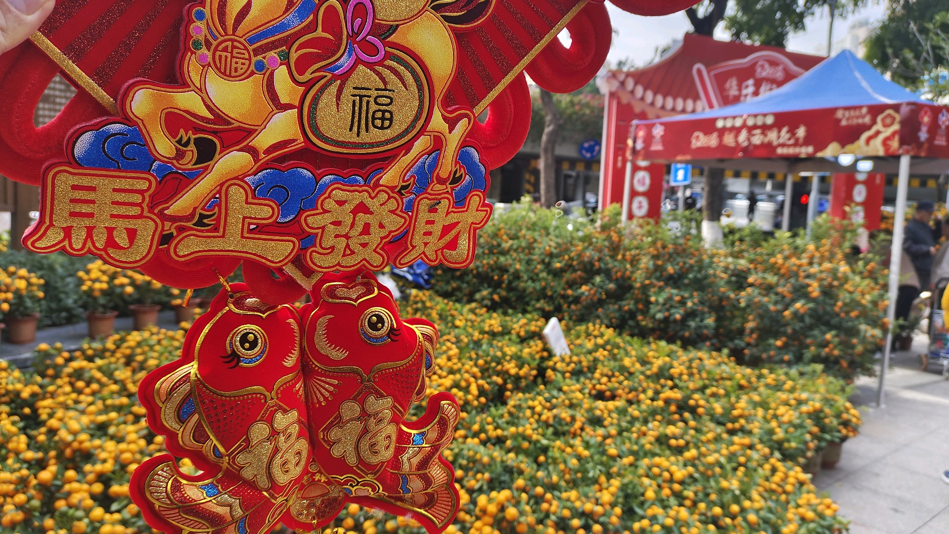 放眼望去,成百上千盆年桔整齐陈列,金灿灿的果实挂满枝头,在翠绿枝叶的映衬下格外耀眼,每一盆都被摊主精心打理,有的还点缀着红彤彤的中国结、吉祥挂件,微风拂过,喜庆气息扑面而来。