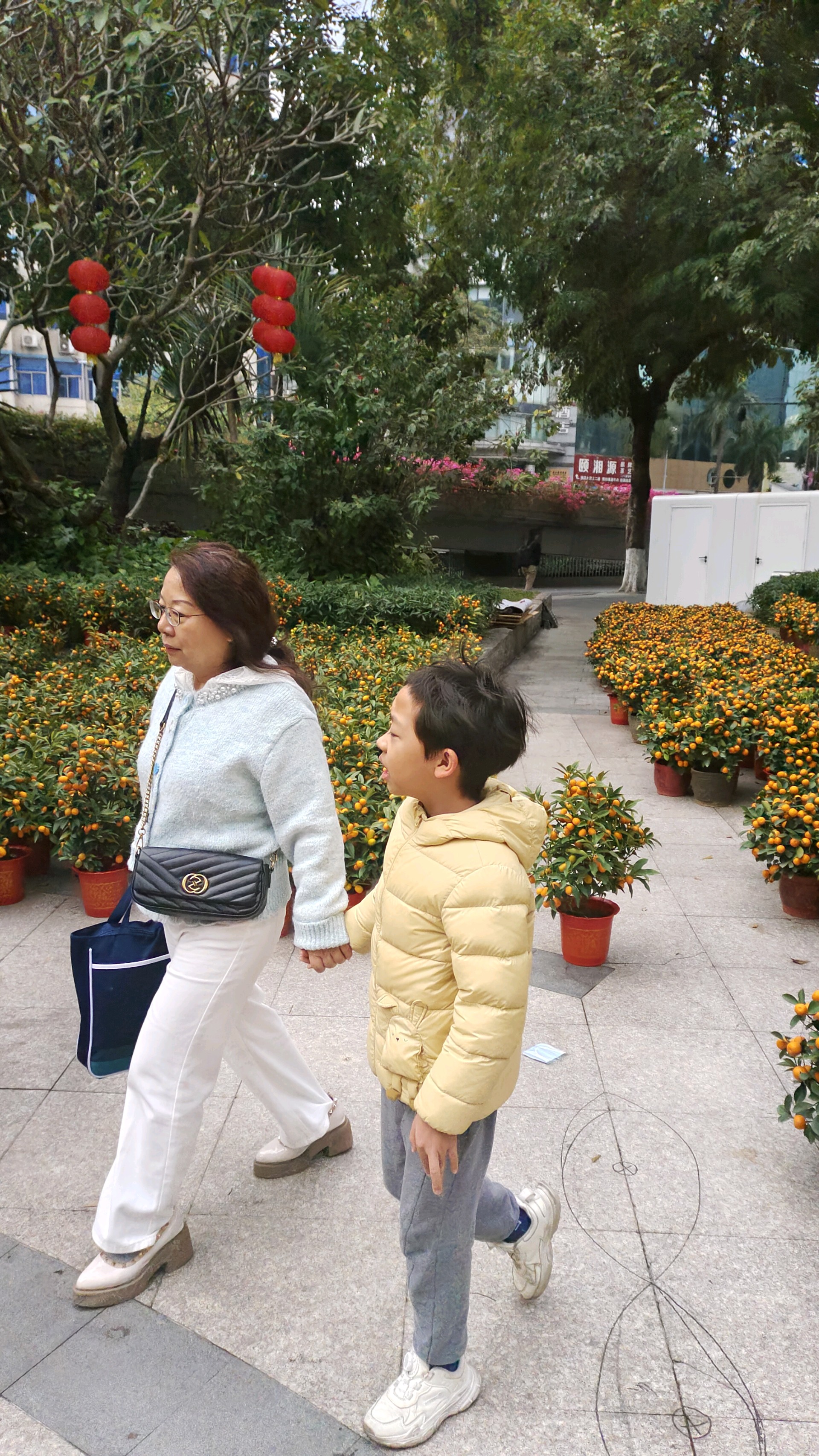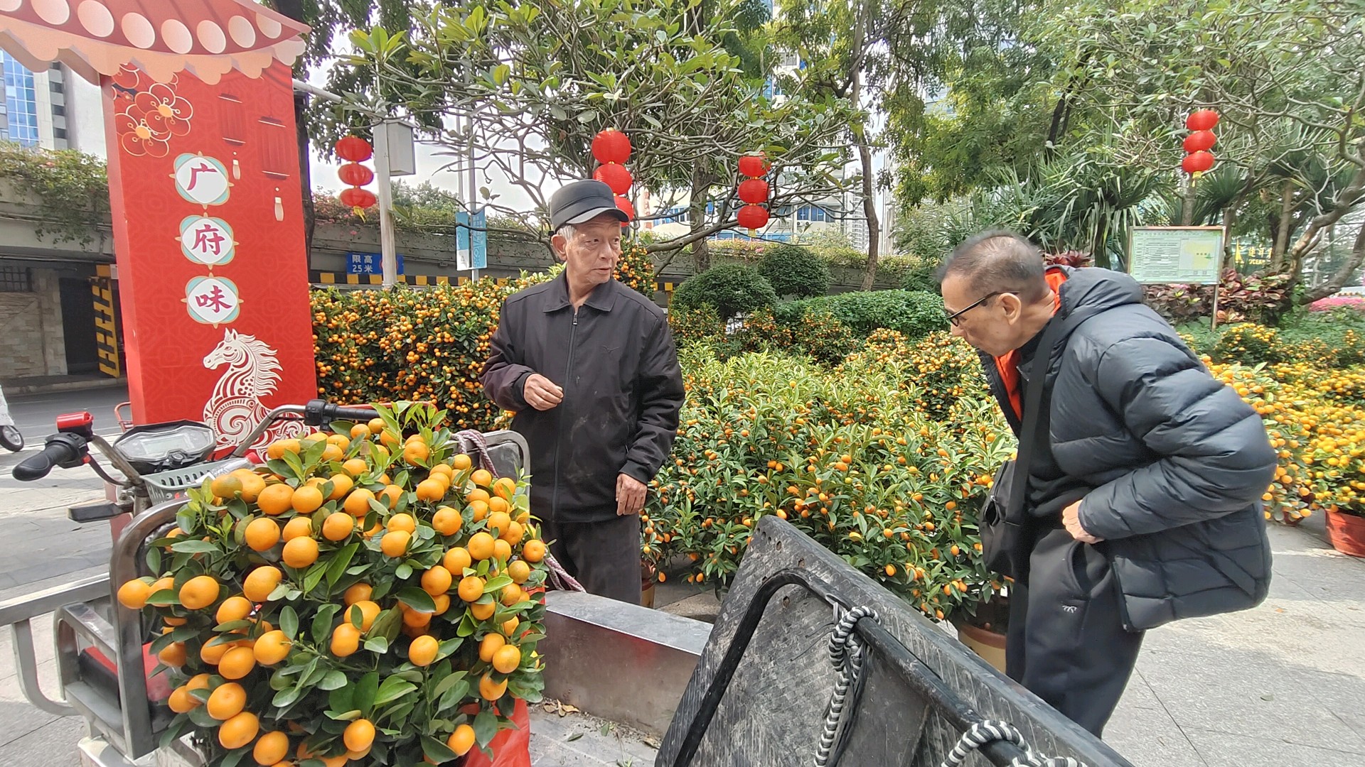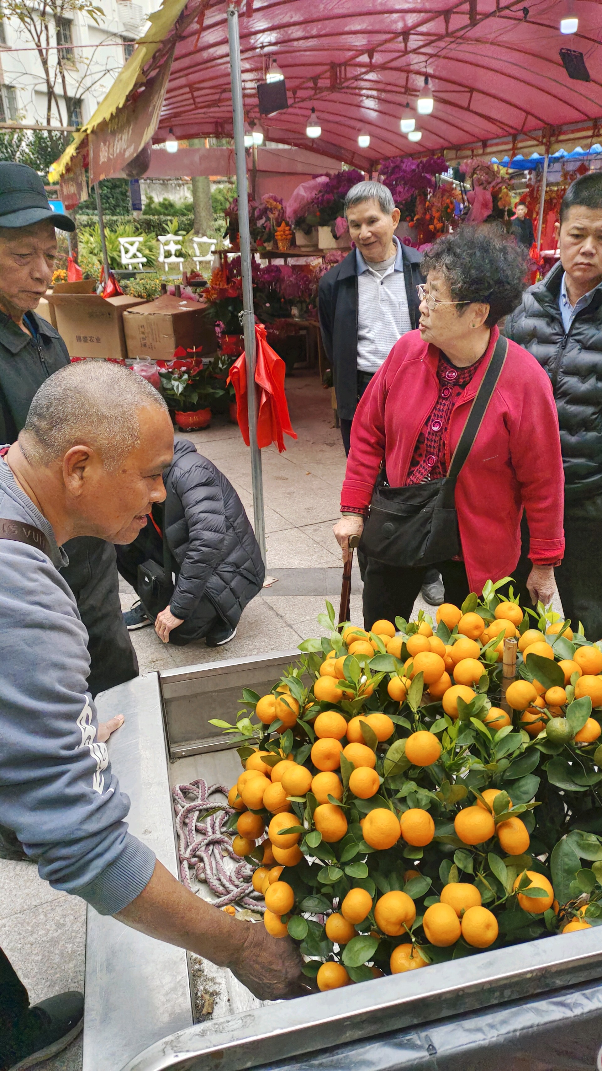 现场人头攒动,热闹非凡。市民们穿梭在年桔丛中,细细挑选心仪的盆栽:有一家三口围在大盆朱砂桔前商量尺寸,有老人蹲下身轻轻抚摸果实挑选果量最足的一盆,还有摊主热情地向顾客介绍年桔的养护技巧。大家手里提着刚选好的年桔,脸上洋溢着对新春的憧憬。