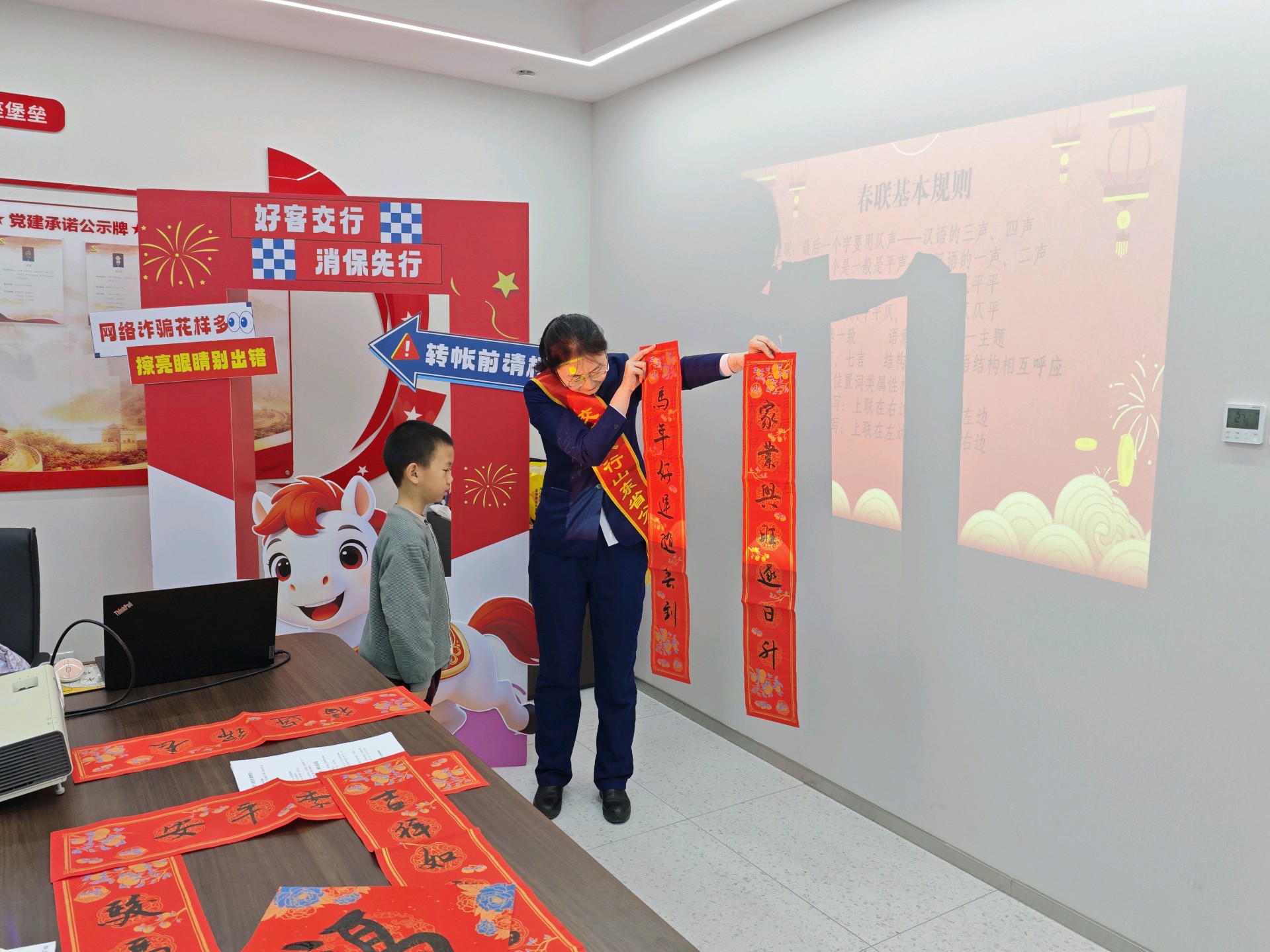 2026年2月9日上午,交通银行济南领秀城支行年味浓郁、暖意融融,支行联合育秀中学小学部2024级5班开展“写对联·新春送福添财气”主题民俗活动,以传统文化为纽带,融合科普、手工、书法与祝福定制,让大小朋友沉浸式感受年俗魅力,共迎马年新春。