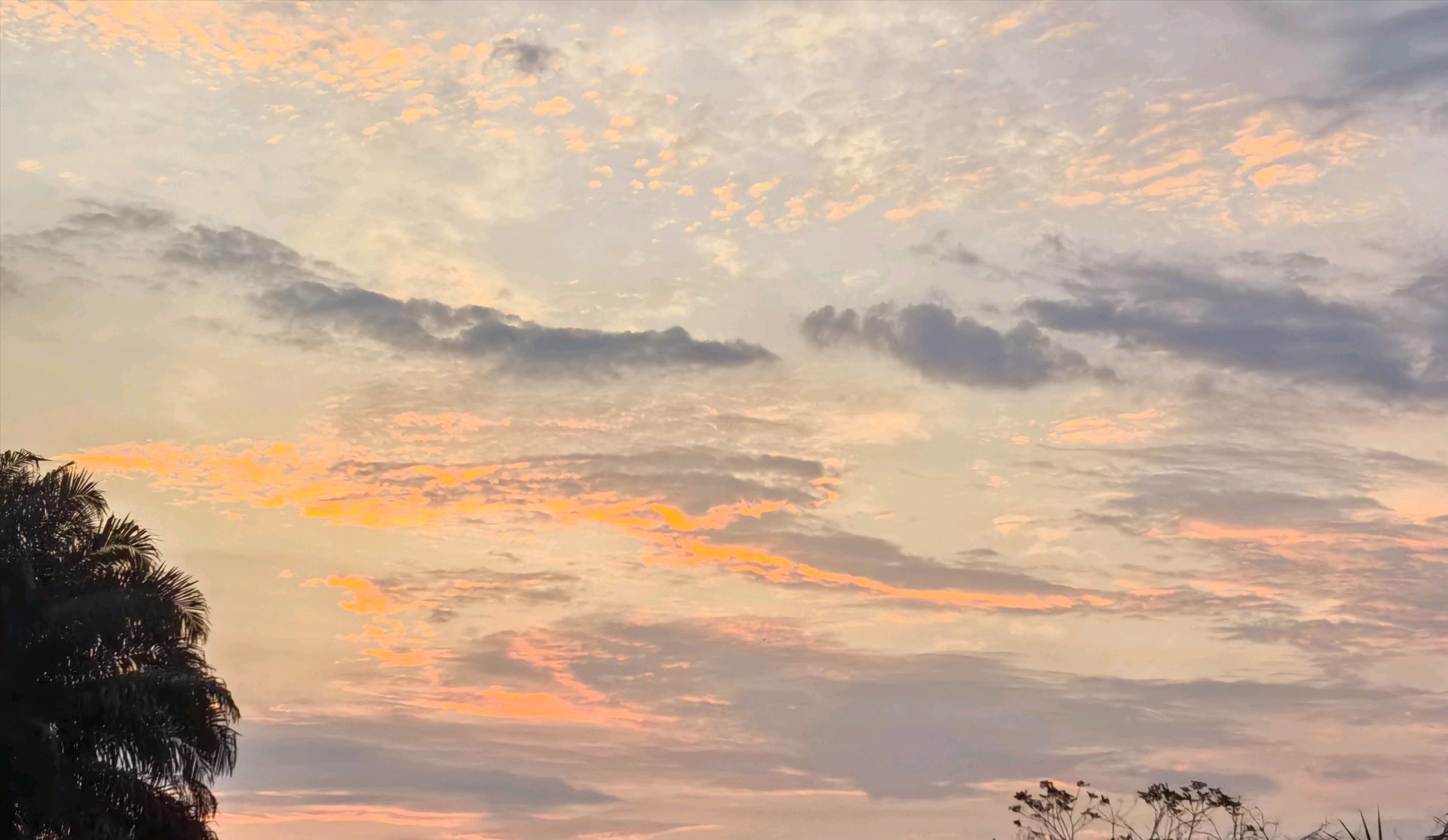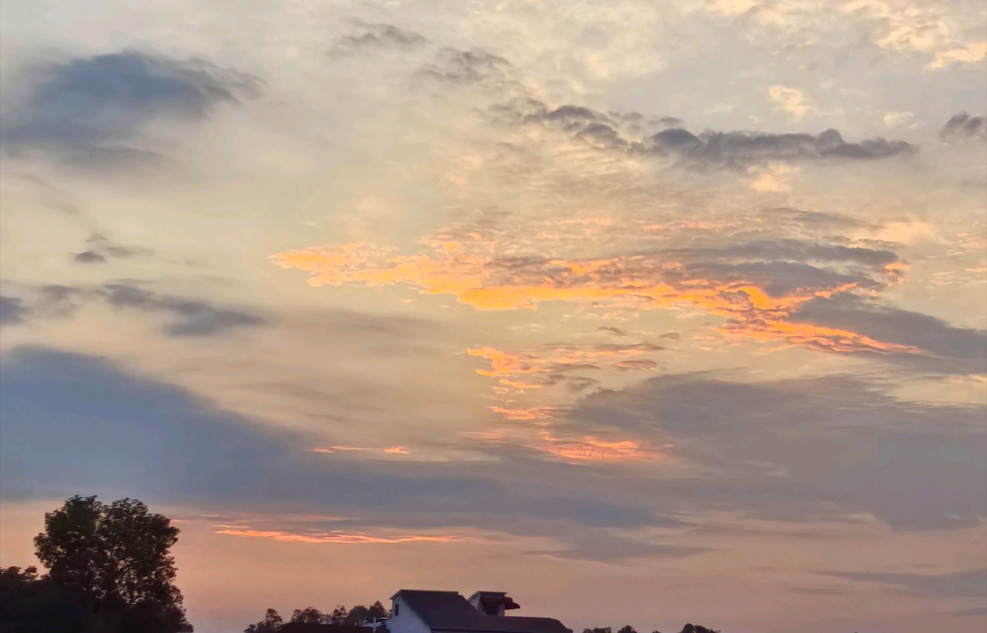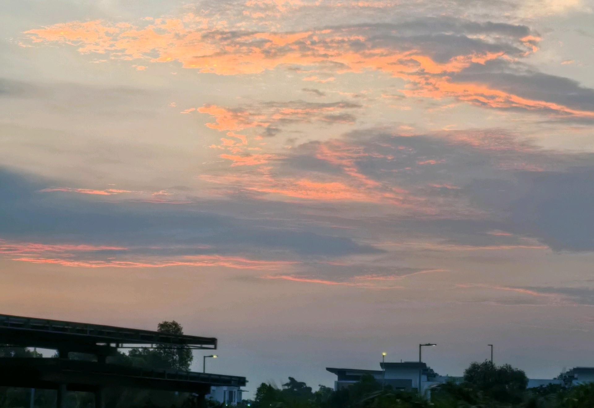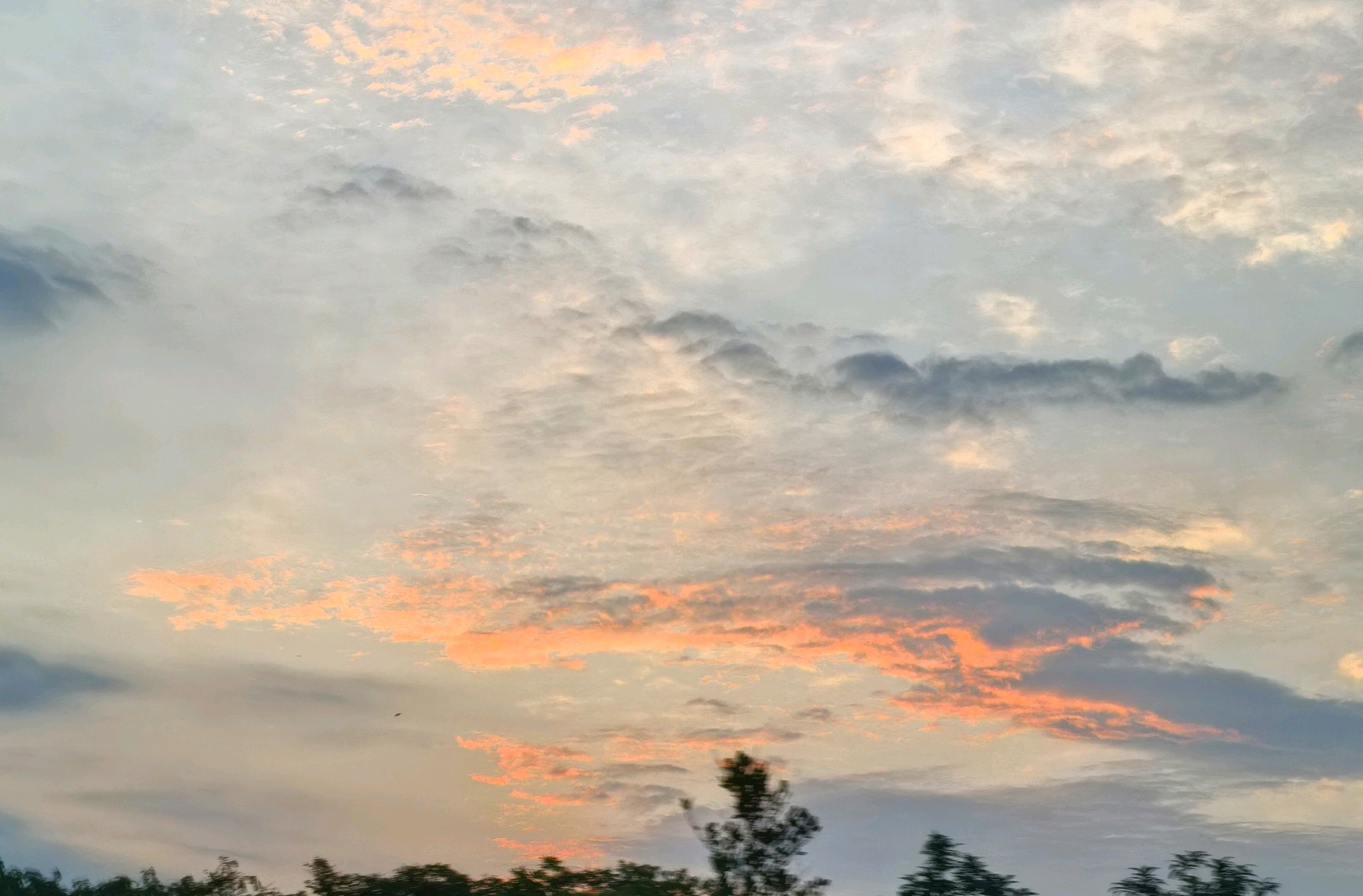 当白日的喧嚣渐渐隐去,天空便成了最盛大的舞台。暖橙与粉紫的霞光,像被打翻的调色盘,肆意晕染在云层之上。轻薄的云絮被染成鎏金的丝带,厚重的云团则晕着温柔的粉紫,层次分明,如梦似幻。