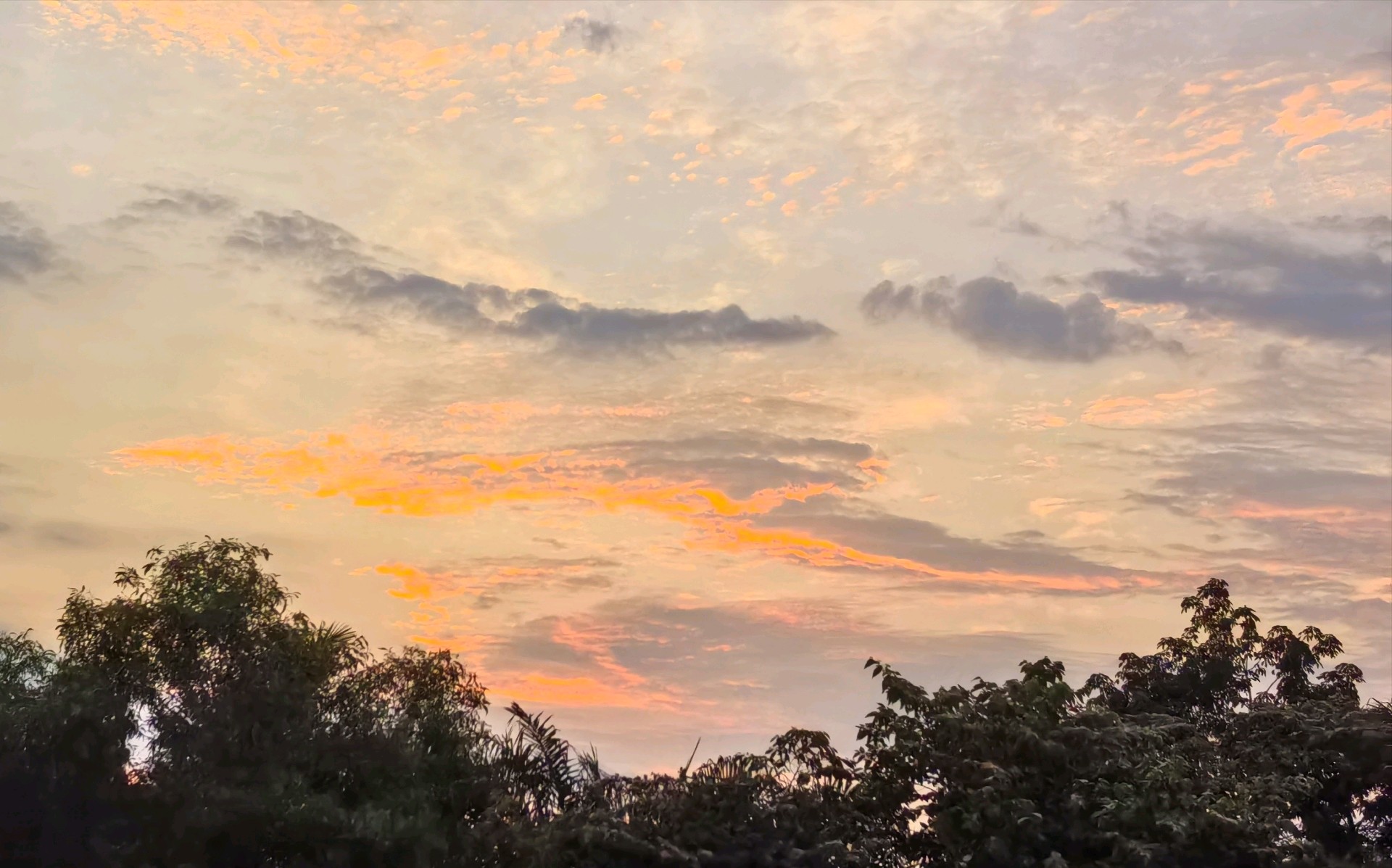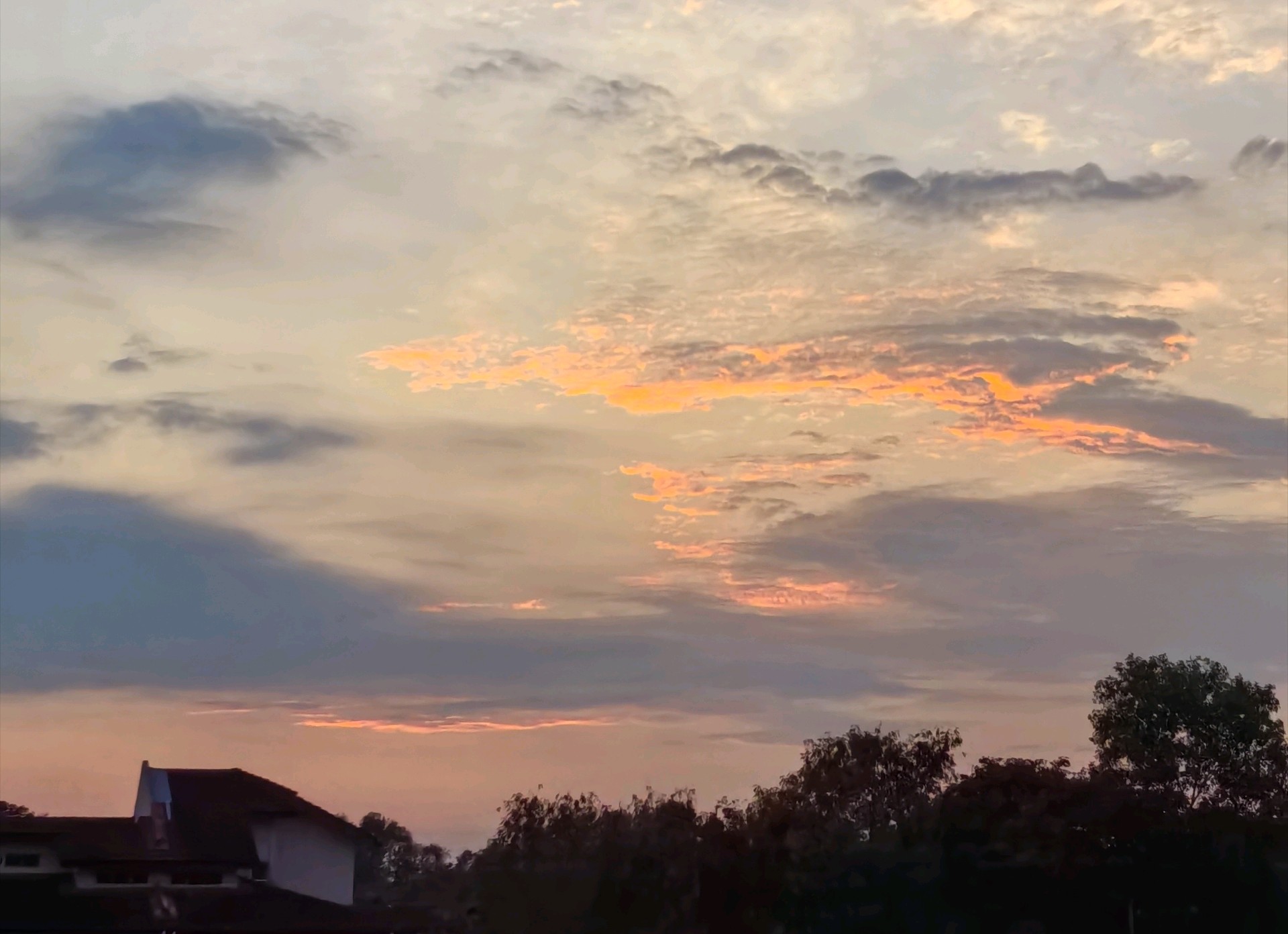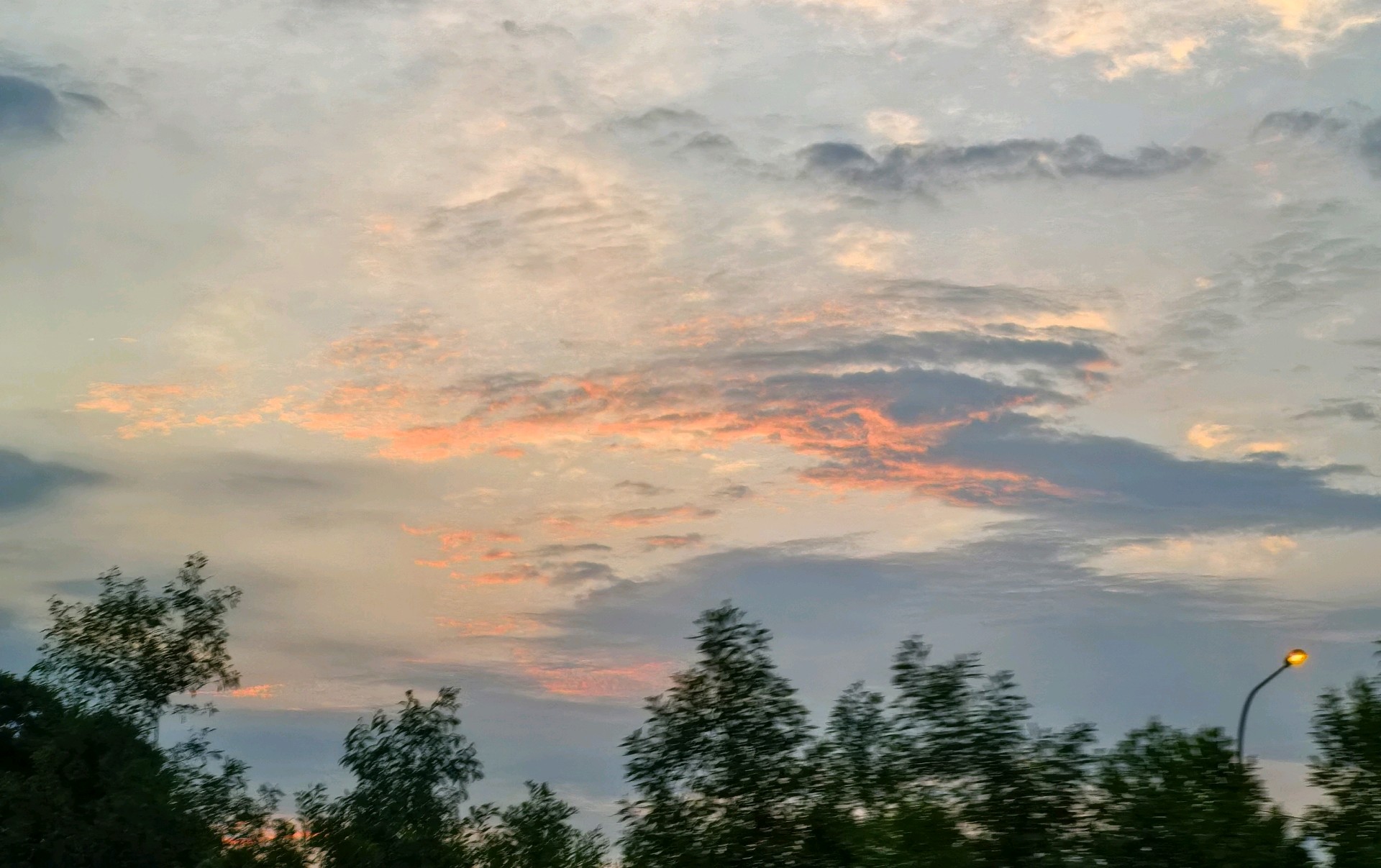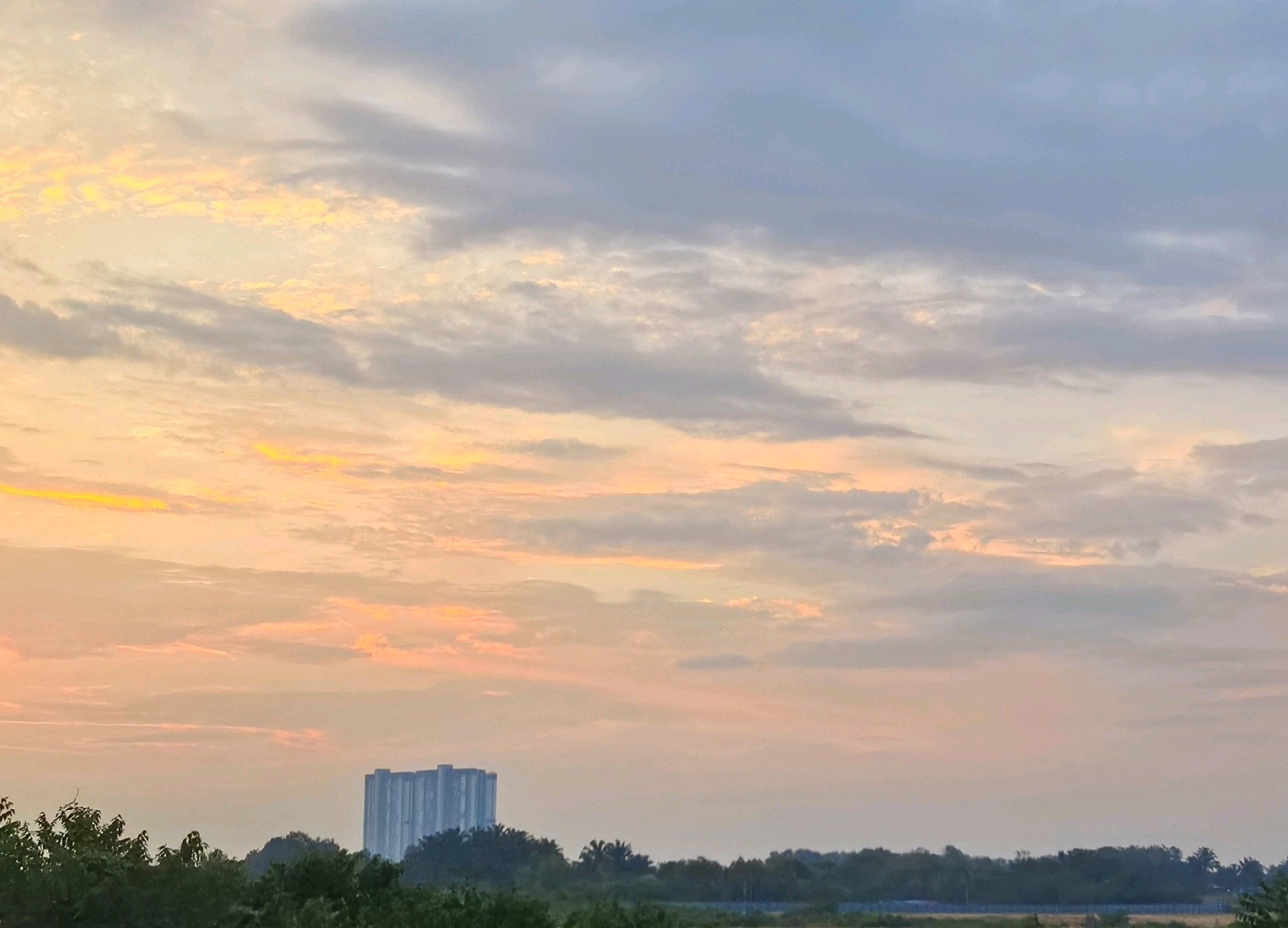 当白日的喧嚣渐渐隐去,天空便成了最盛大的舞台。暖橙与粉紫的霞光,像被打翻的调色盘,肆意晕染在云层之上。轻薄的云絮被染成鎏金的丝带,厚重的云团则晕着温柔的粉紫,层次分明,如梦似幻。