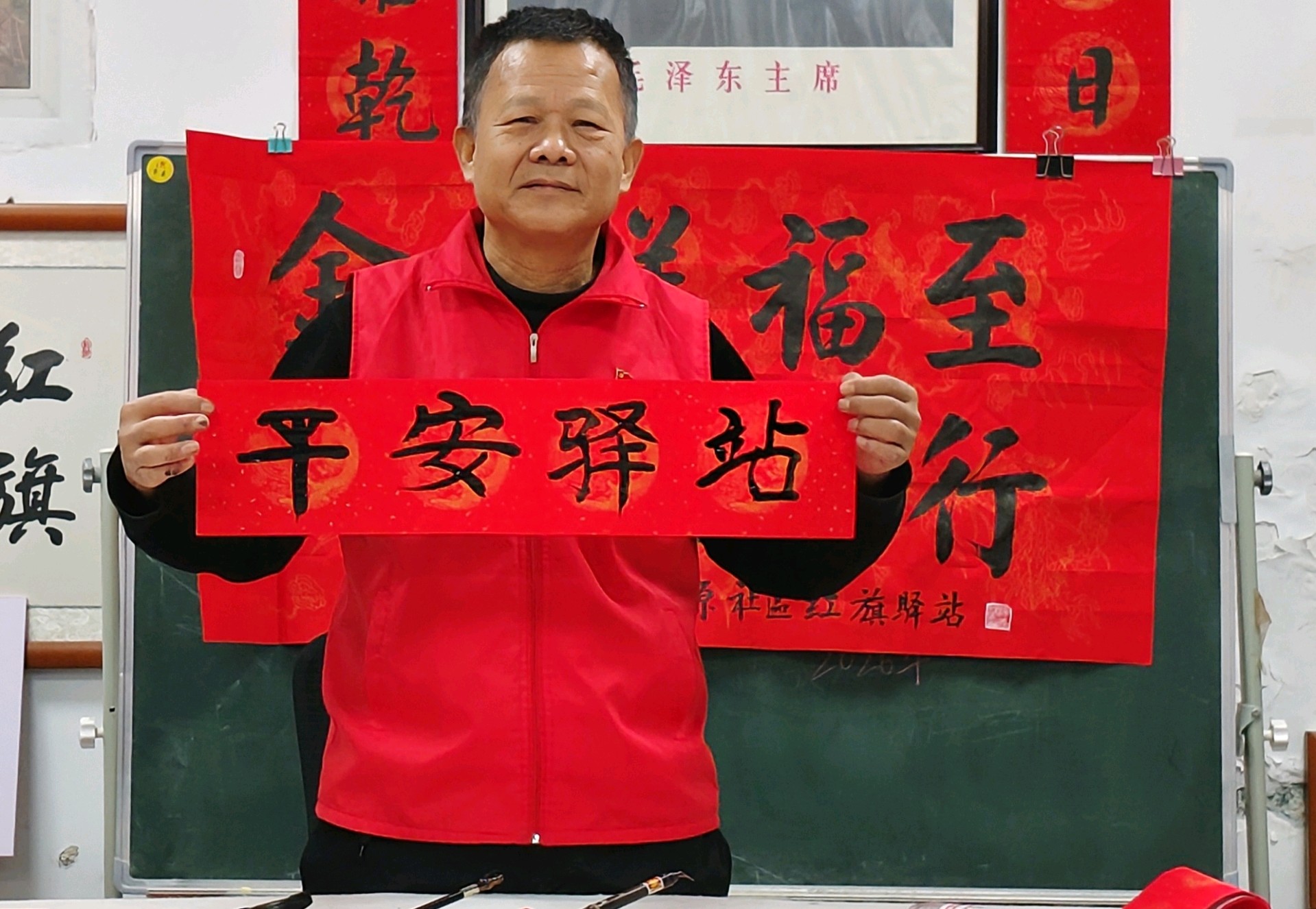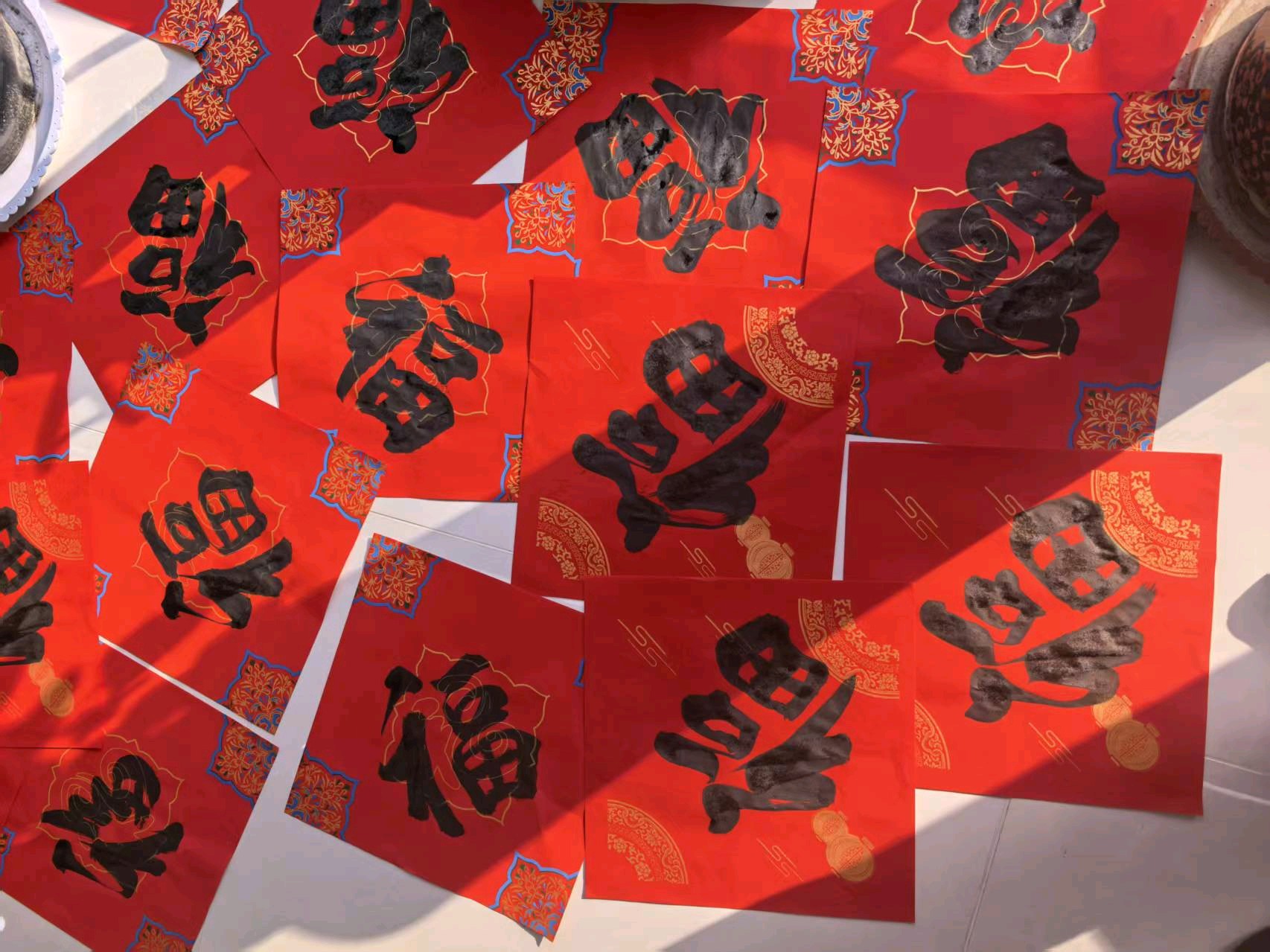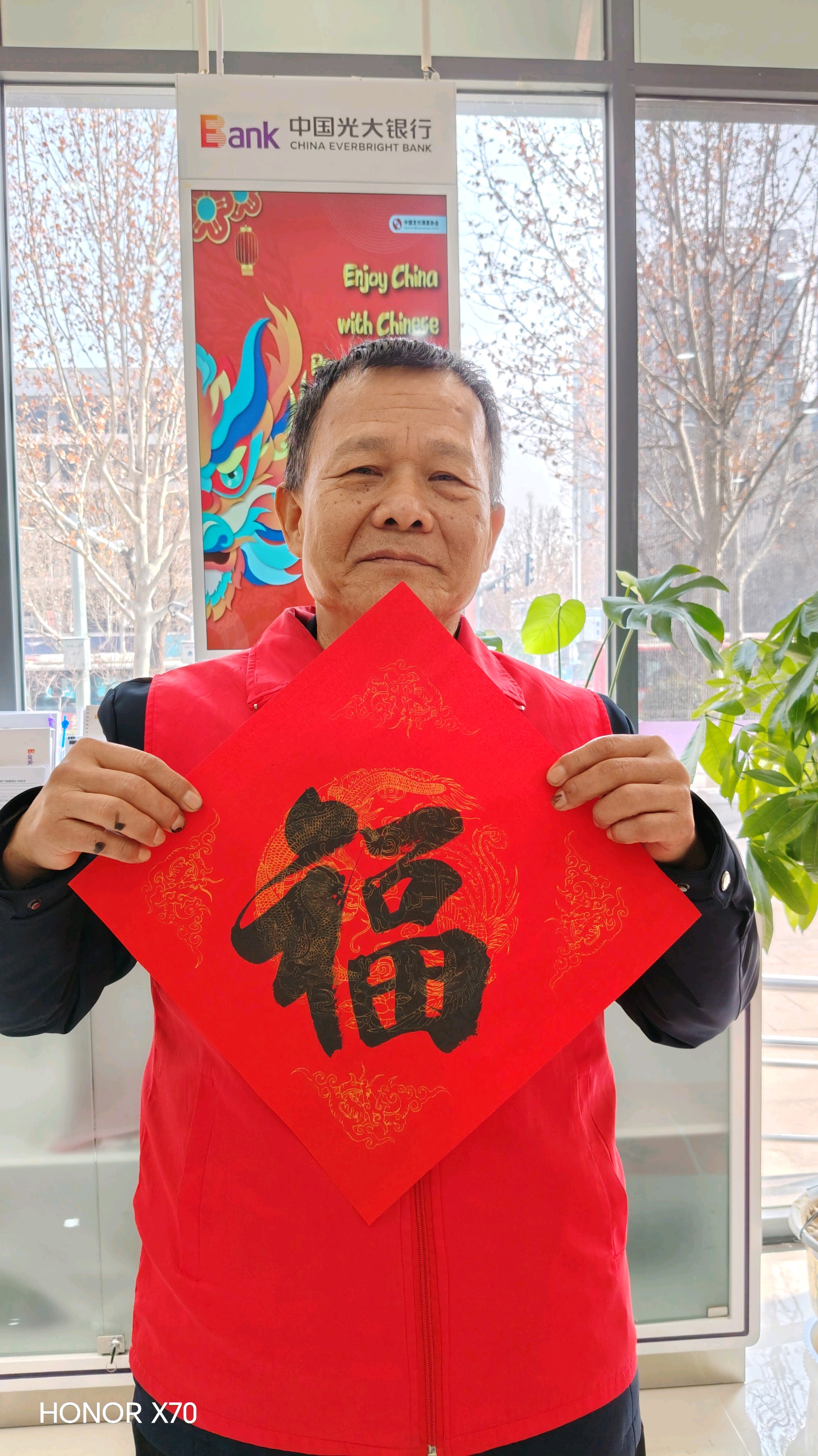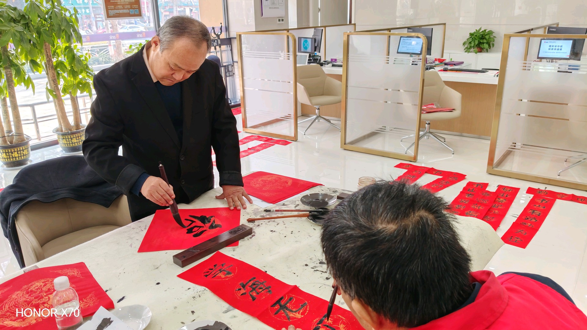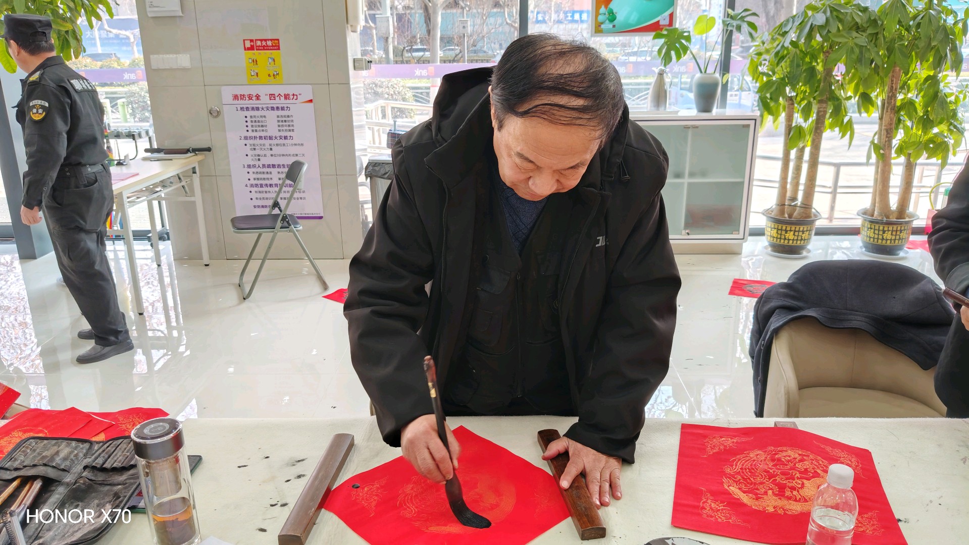 活动现场,红纸铺展,墨香四溢。亚大支部书记牛东华率先挥毫,写下“聚源传福千家暖,光大防诈万户安”,巧妙地将社区祝福与反诈宣传融入其中,引得居民们纷纷称赞。汤润芝、宋邦华、路兴红也不甘示弱,笔走龙蛇,一个个饱满圆润的“福”字跃然纸上,传递着满满的福气。邱振国则题写“新春大吉”,为活动增添了喜庆的氛围。