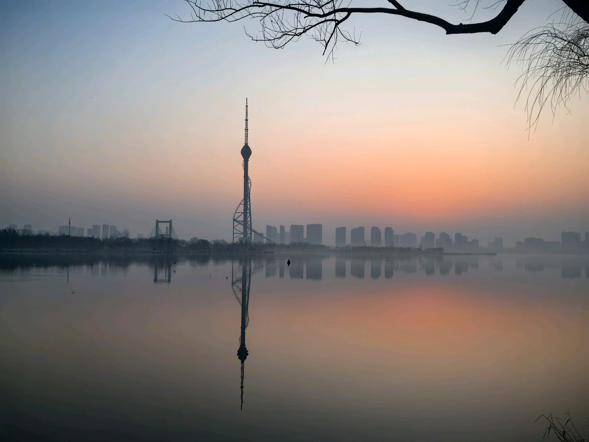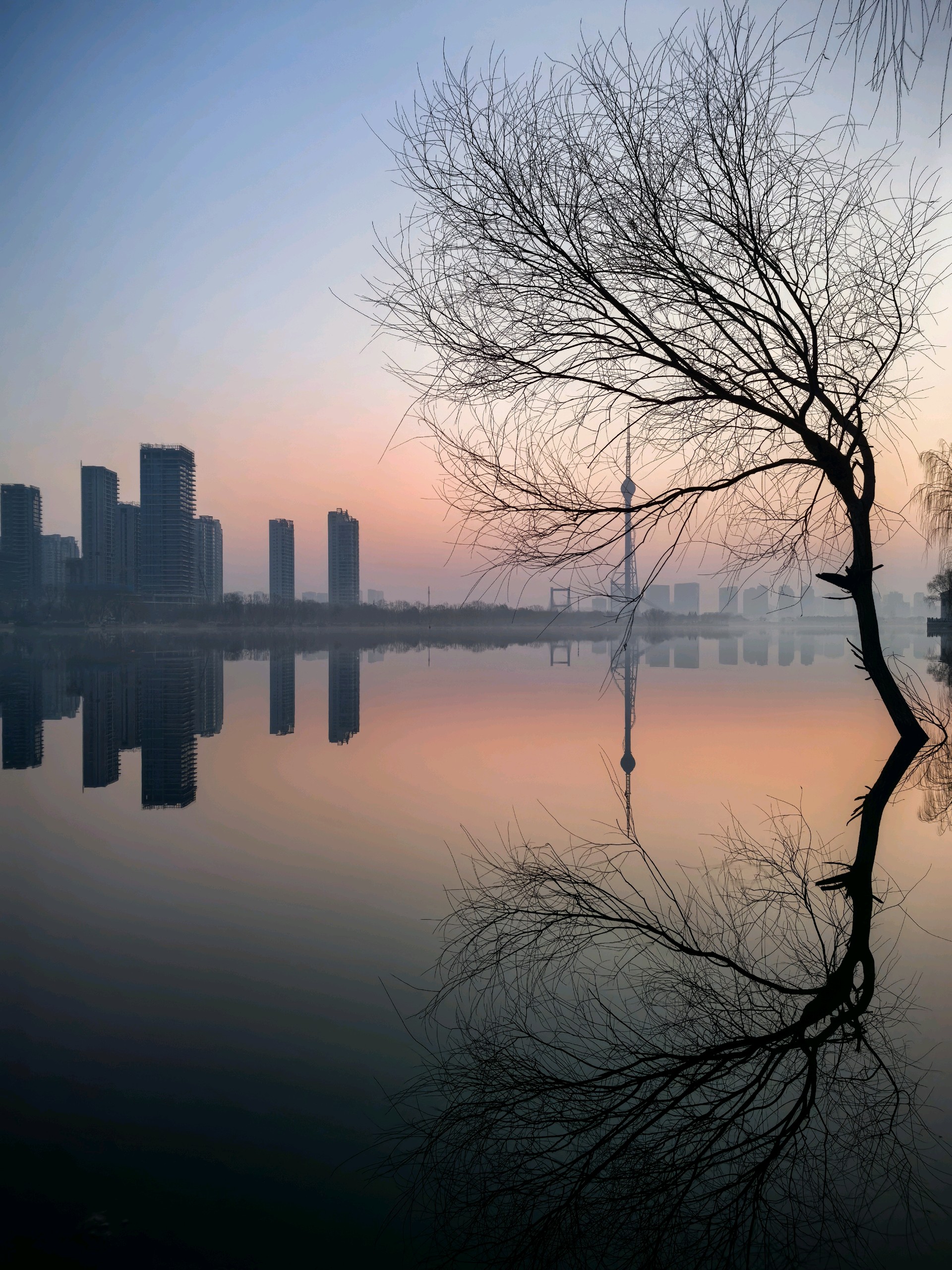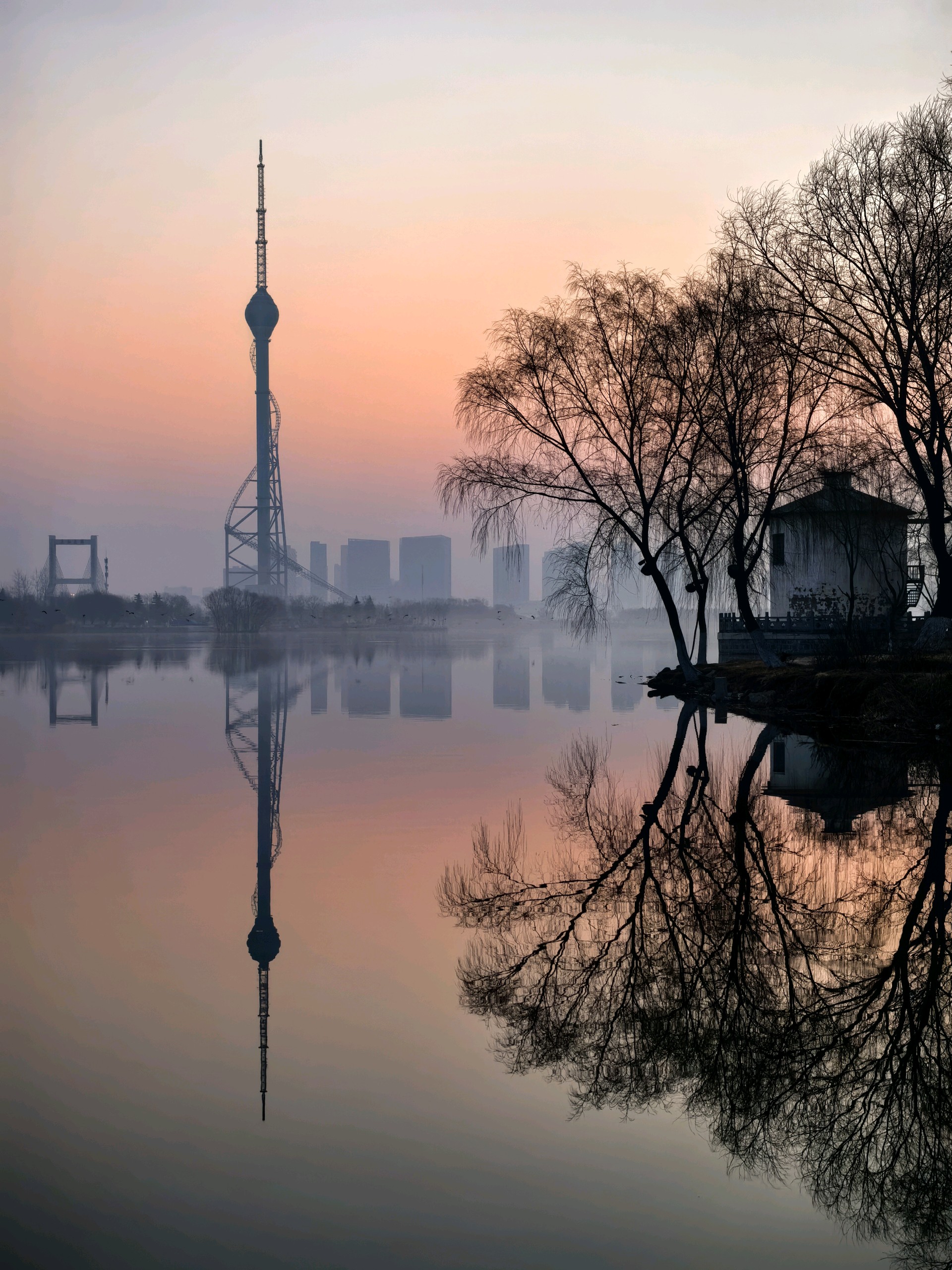 清晨,沂河在红色天空下,宁静河面宛如镜子,倒映着城市的繁华与美丽。