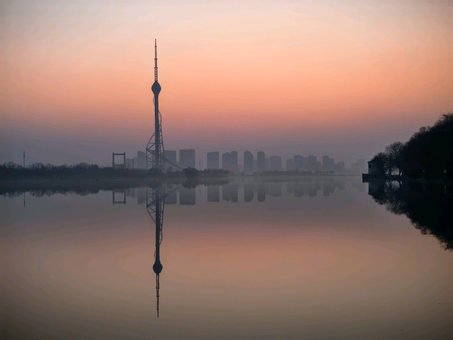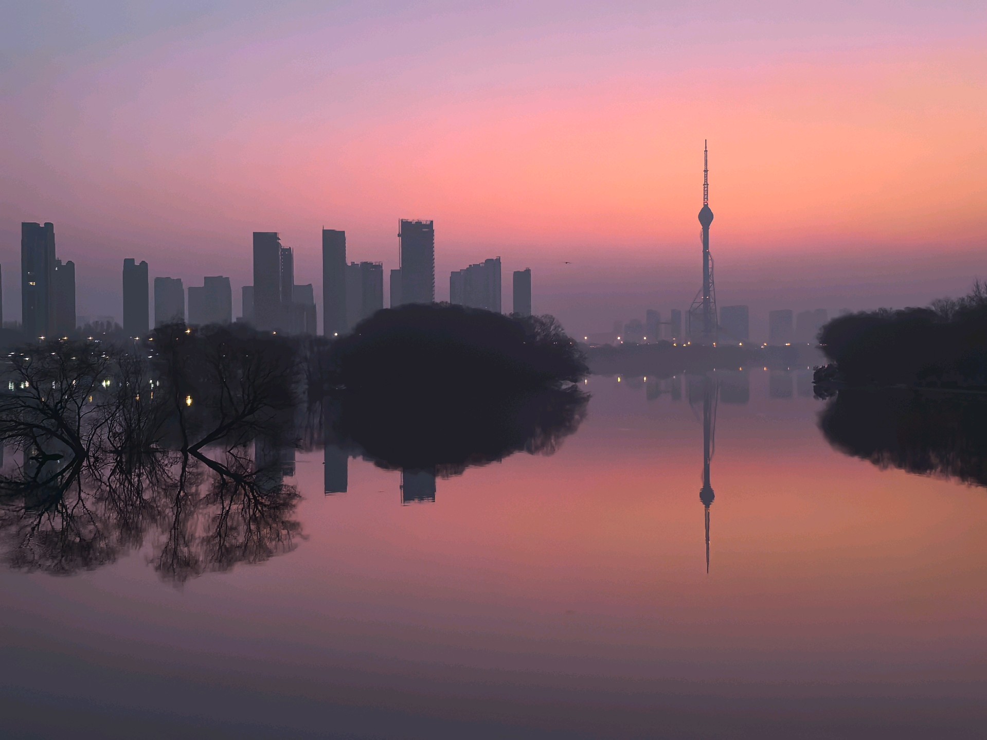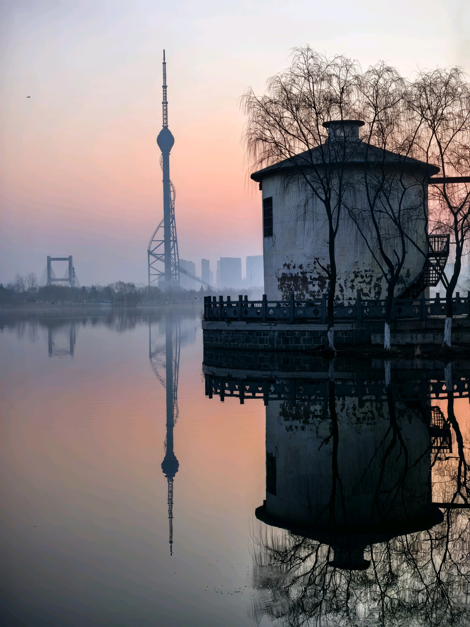 清晨,沂河在红色天空下,宁静河面宛如镜子,倒映着城市的繁华与美丽。