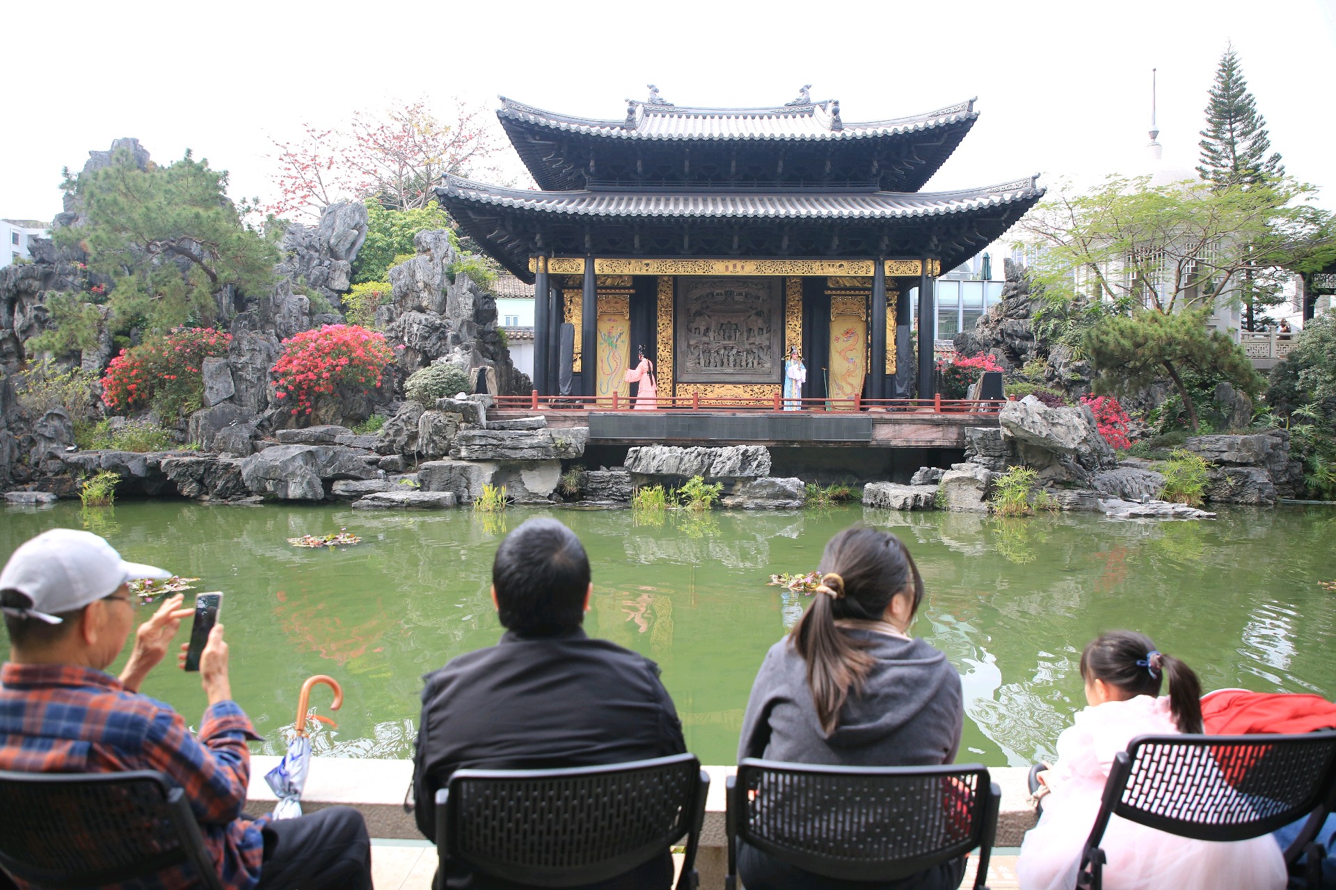 碧波荡漾的放生池畔,青瓦鎏金的古式戏台静静伫立,飞檐翘角间尽显岭南建筑的精巧雅致。戏台之上,粤剧演员身着绣满金线的戏服,头戴精致头饰,水袖翩跹间,婉转悠扬的粤曲唱腔伴着锣鼓声在园林中回荡。《牡丹亭》的经典选段、《帝女花》的凄美旋律,让在场游客沉浸式领略粤剧“南国红豆”的独特魅力。池边的游客们或端坐静赏,或举起手机记录下精彩瞬间,老人跟着旋律轻哼,孩童好奇地打量着演员的装扮,一幅鲜活的文化传承画卷徐徐展开。
