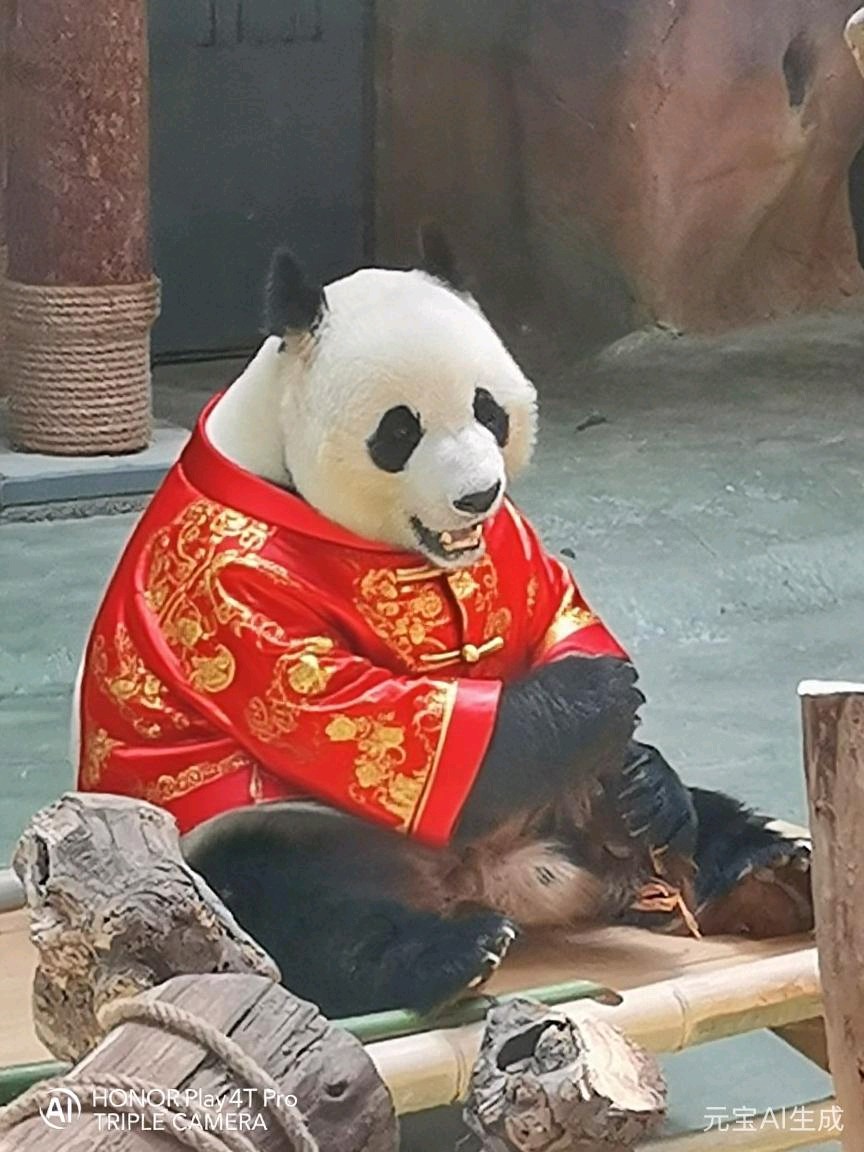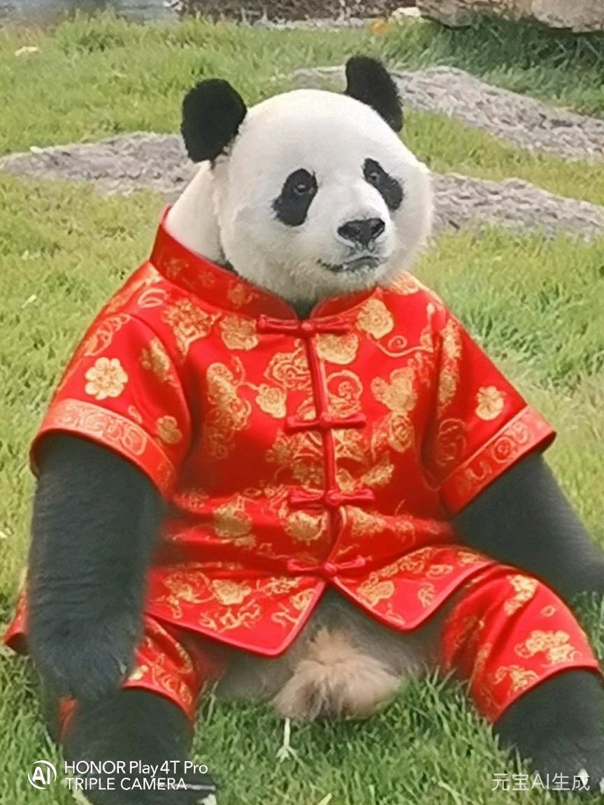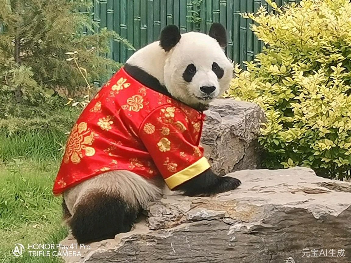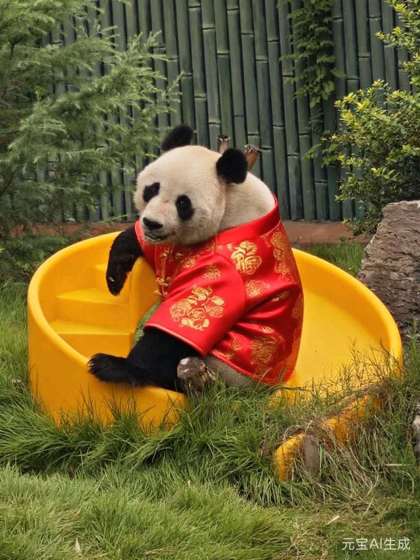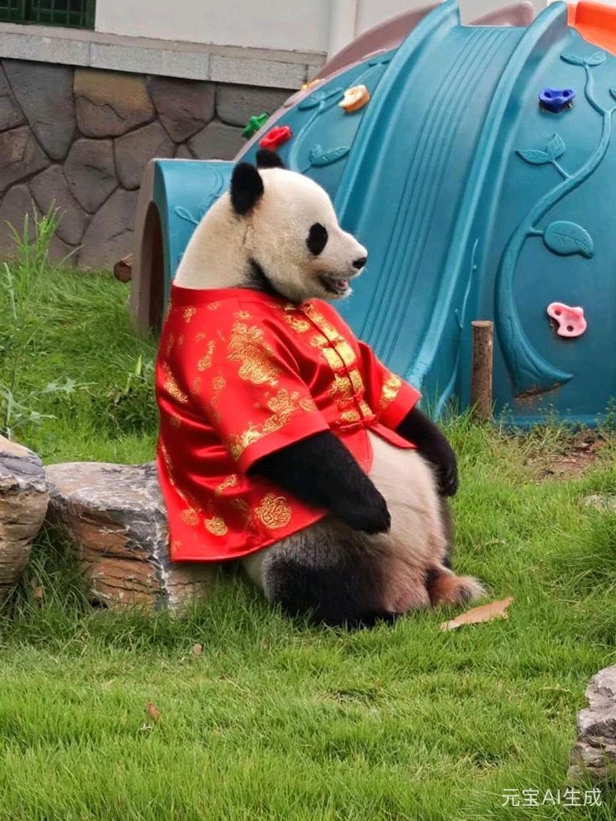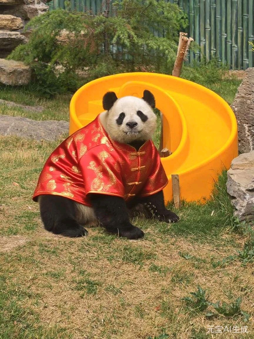 穿上中式服装的大熊猫,坐在黄色滑梯上,仿佛在庆祝中国新年。
