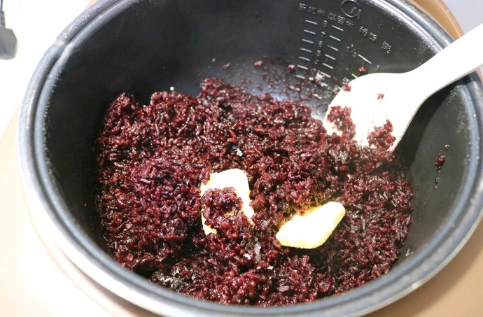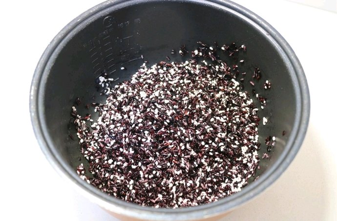 1、紫米和糯米(2:1),淘洗干净。加入比平时煮饭多一点的清水,用电饭煲煮熟。