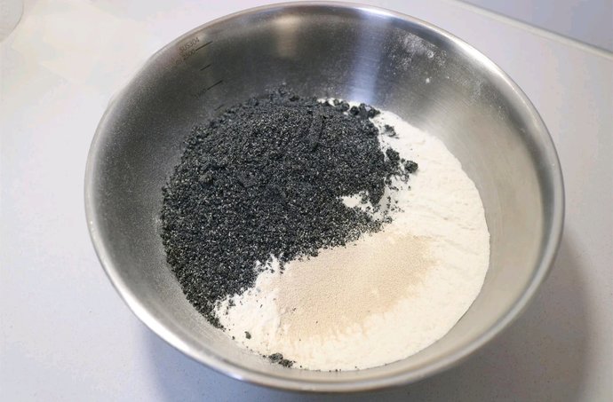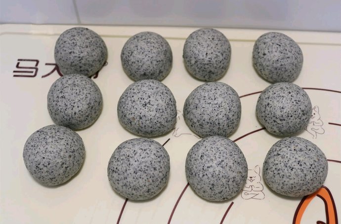 3、面粉、熟黑芝麻磨成粉、酵母、加入温水,揉成面团。