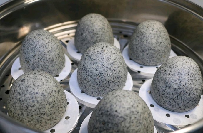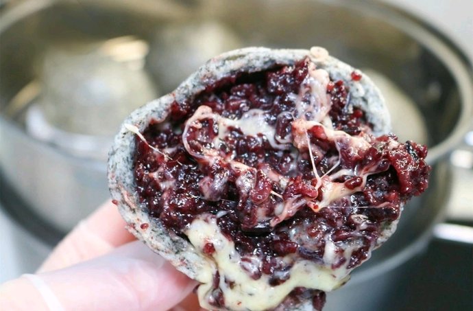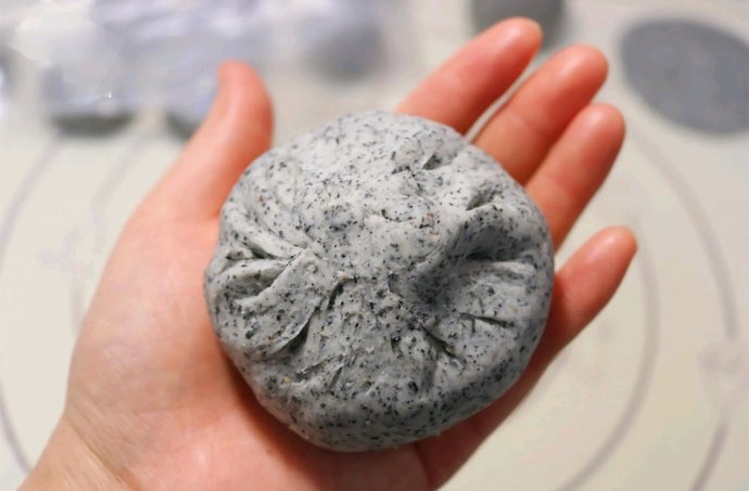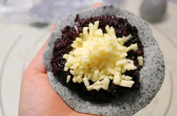 6、擀成包子皮,放入紫米馅摊平,再放入芝士碎。像捏包子一样将馅料包裹严实。封口朝下,整理成馒头状。