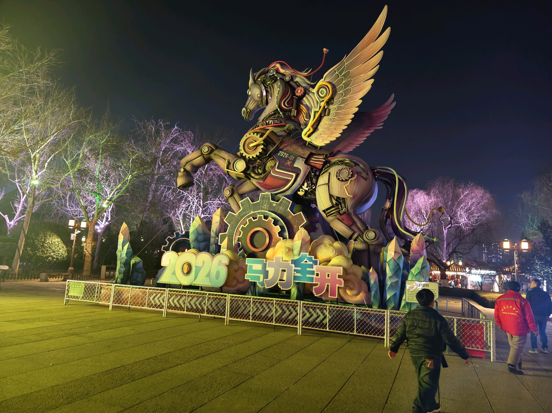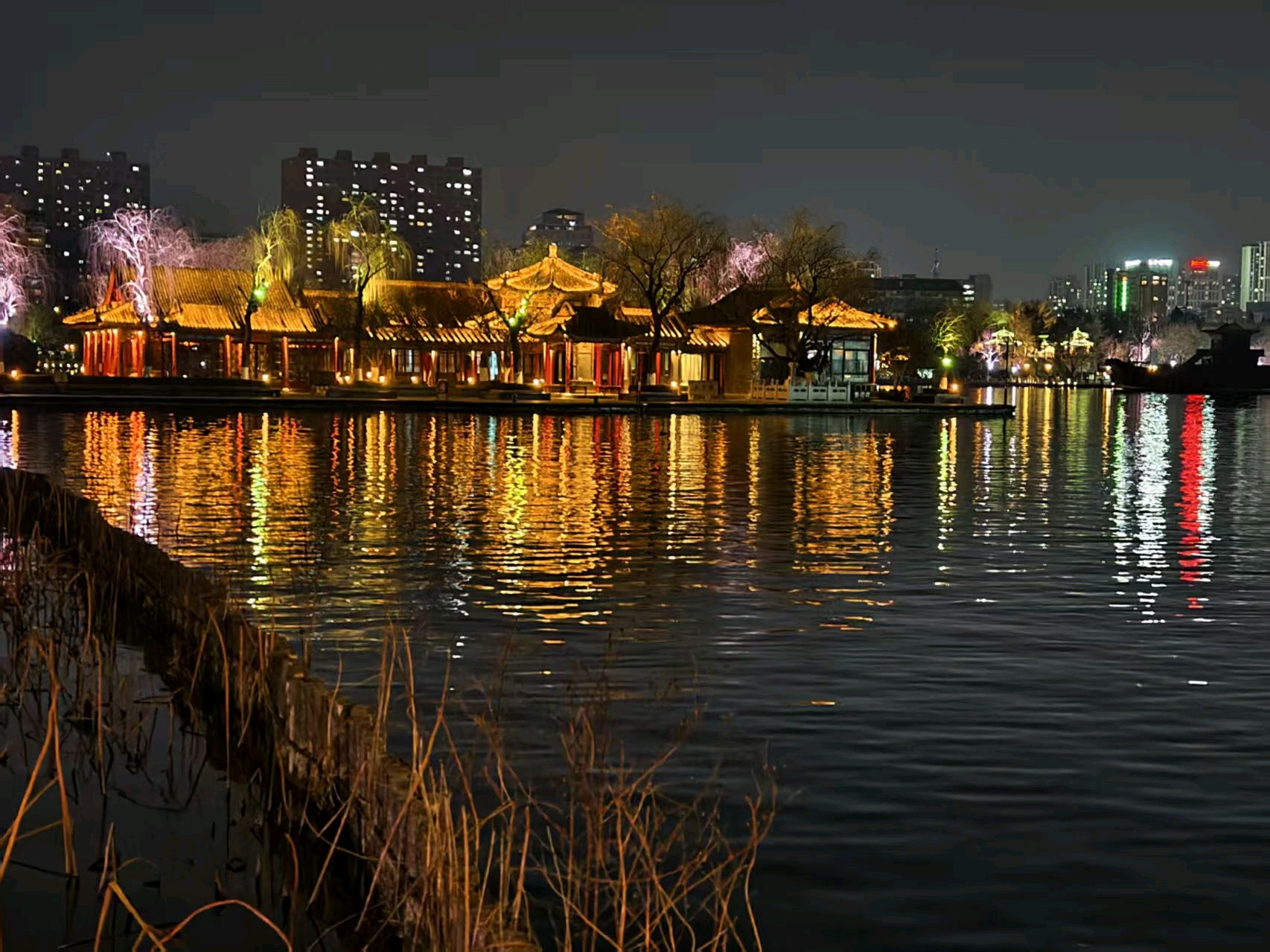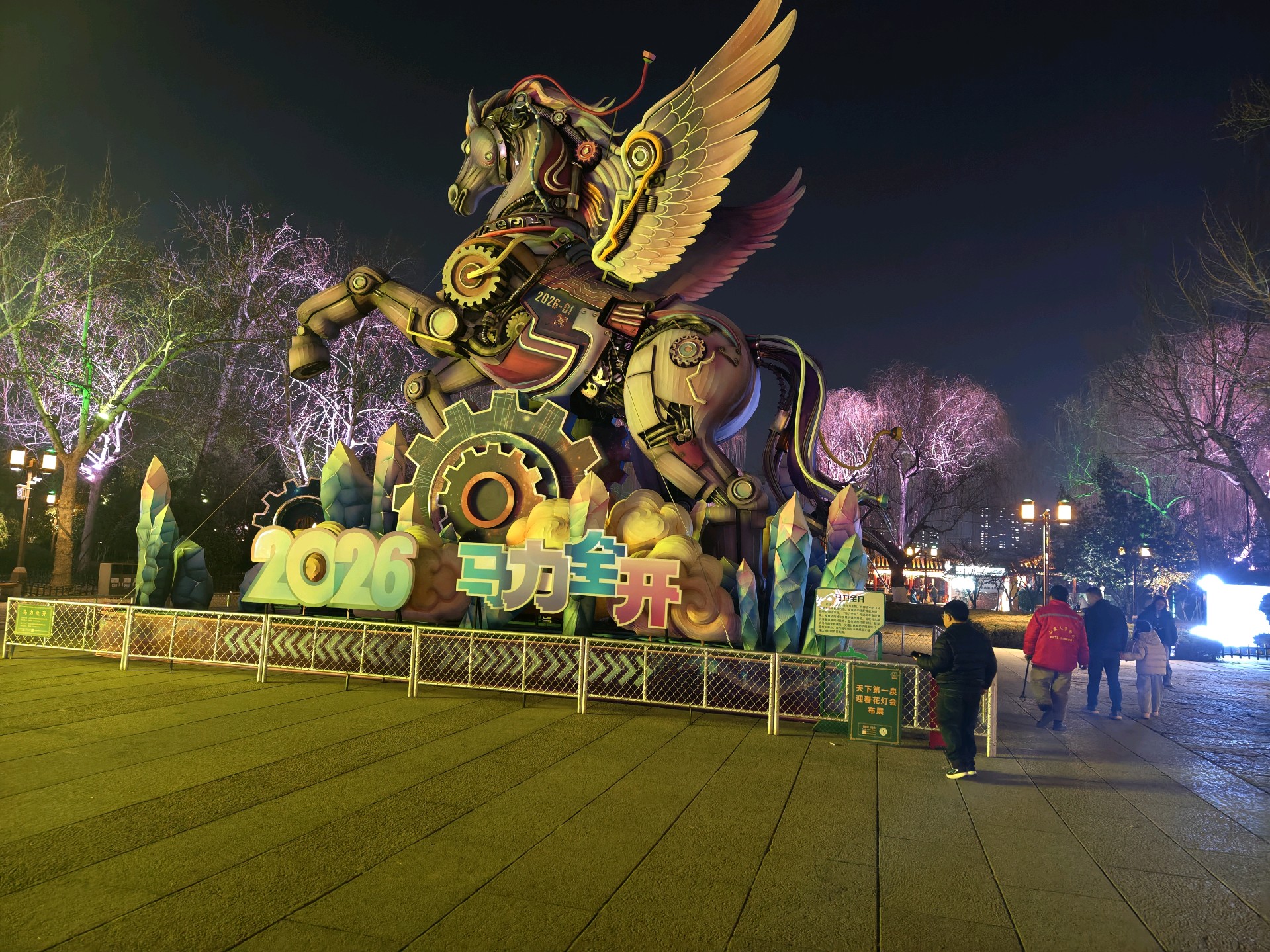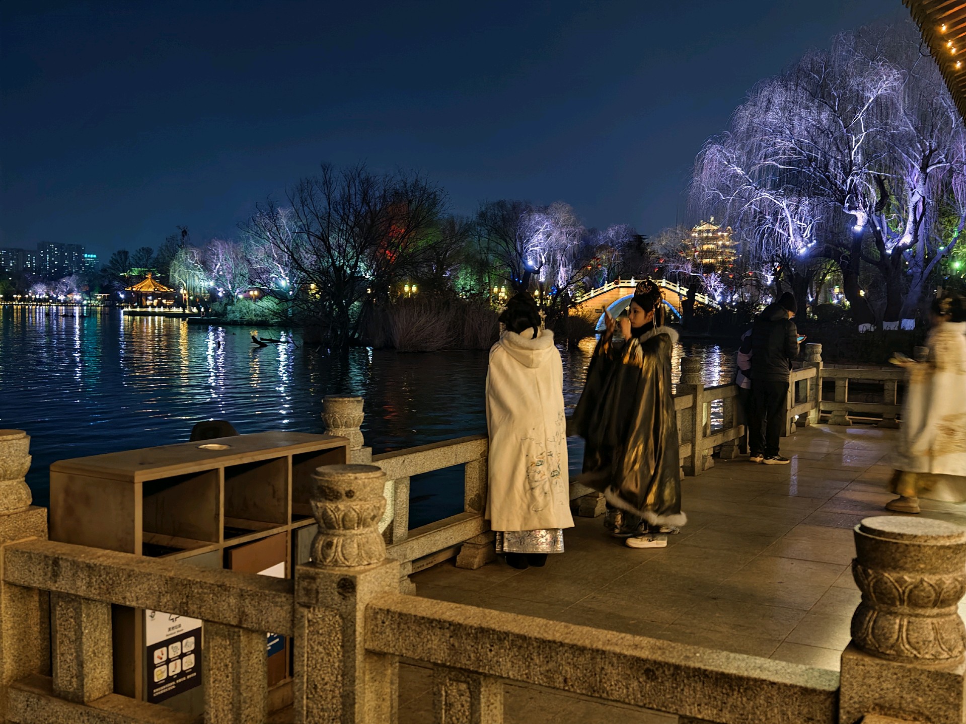 春节将至,晚间的大明湖畔灯光璀璨,火树银花,流光溢彩,骏马腾飞,古装美女随处可见,人与自然构成一幅美丽画卷。