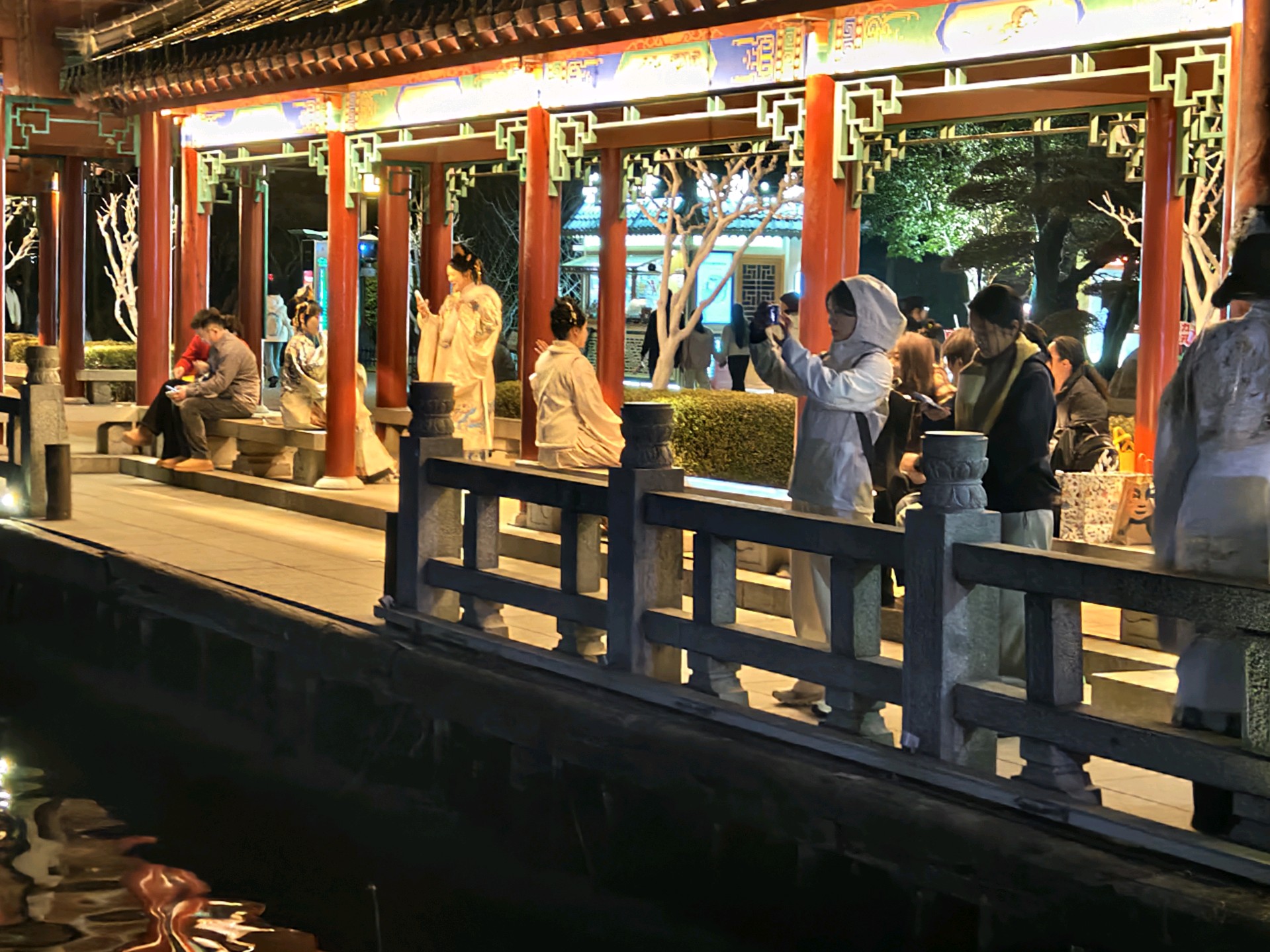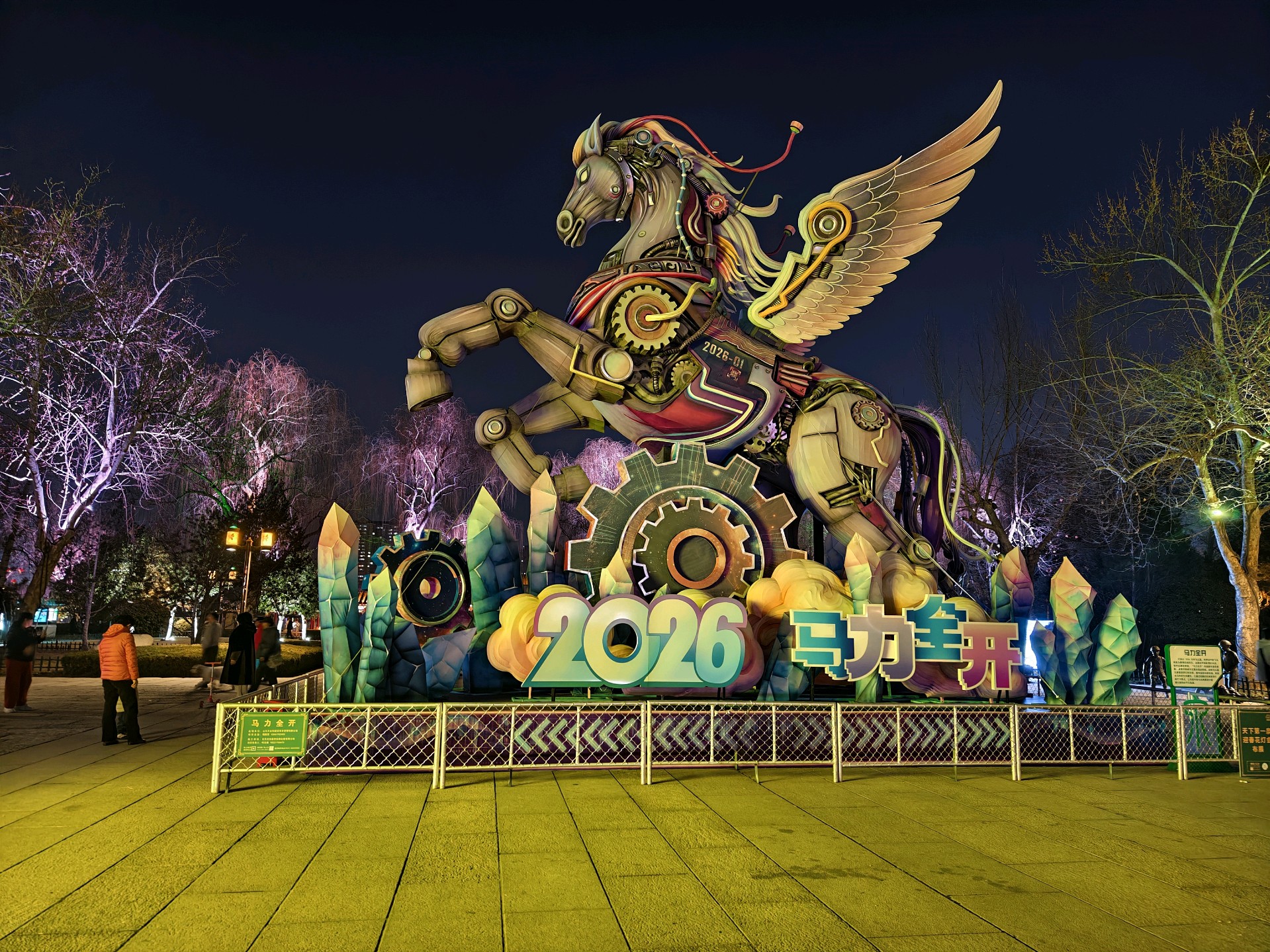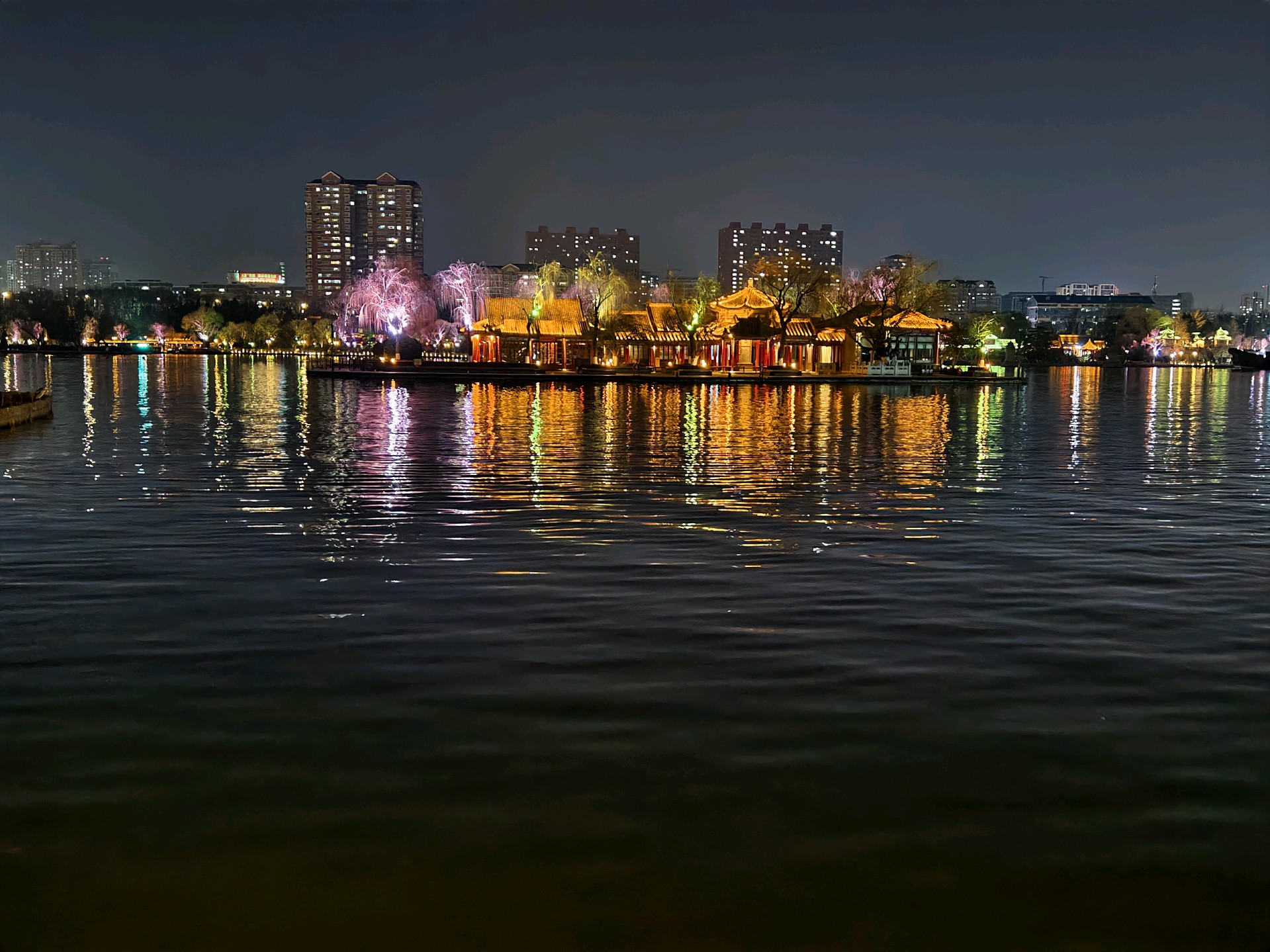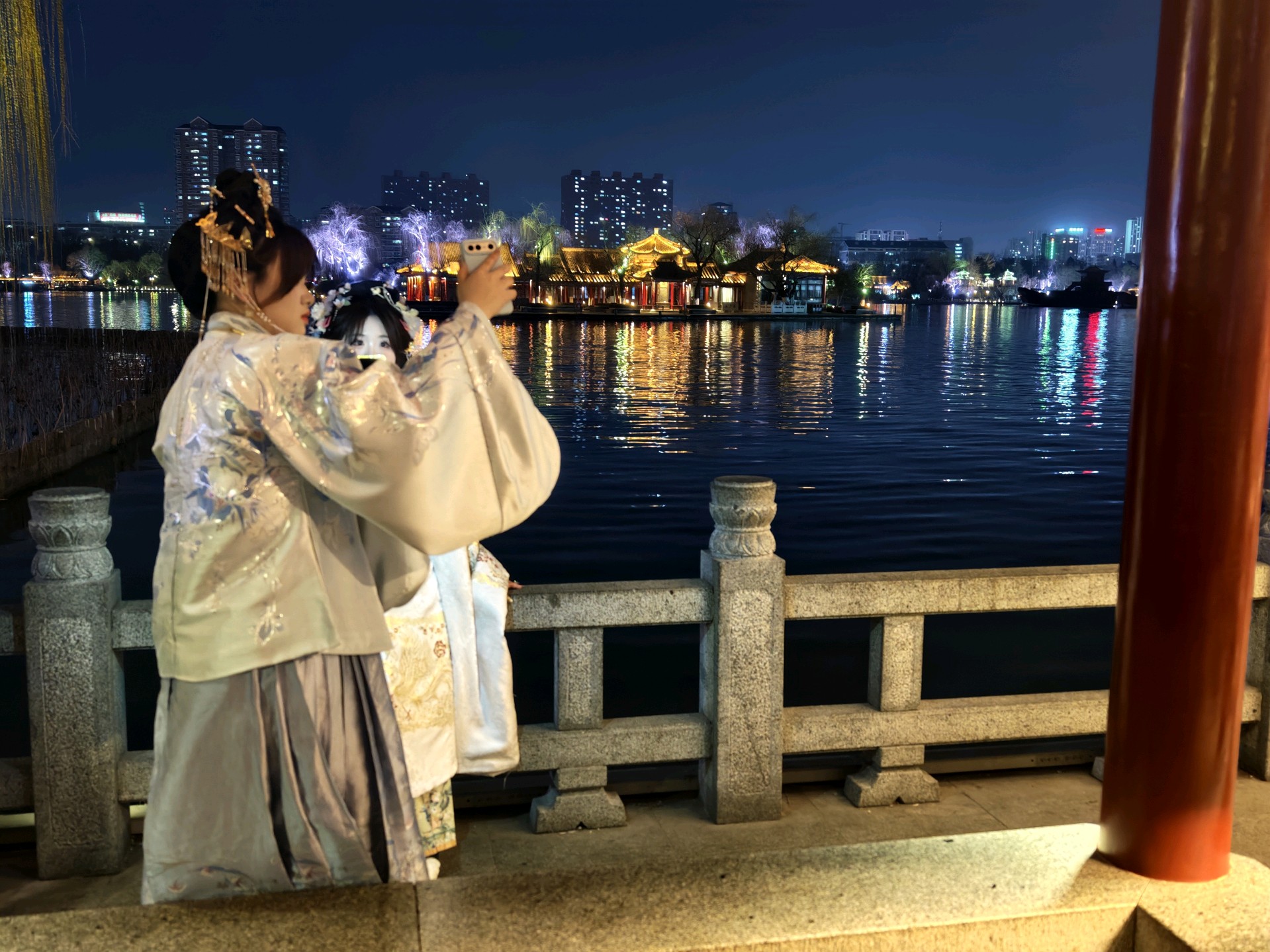 春节将至,晚间的大明湖畔灯光璀璨,火树银花,流光溢彩,骏马腾飞,古装美女随处可见,人与自然构成一幅美丽画卷。