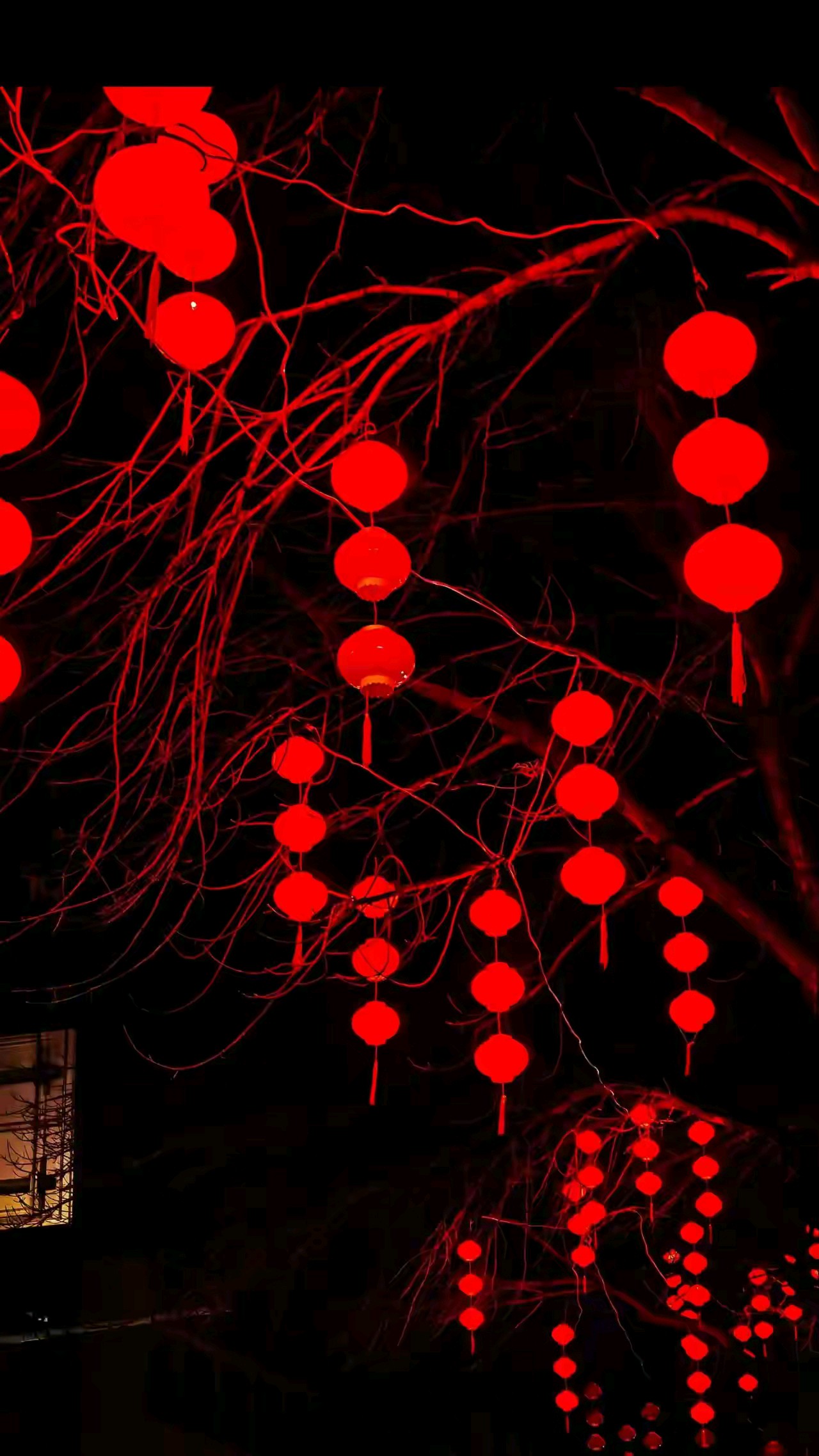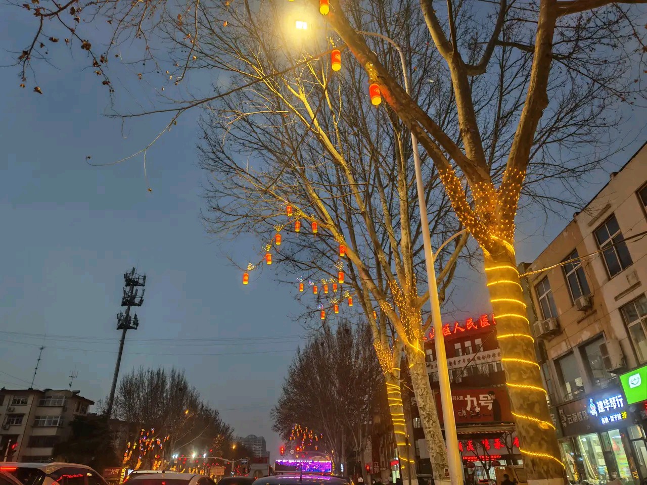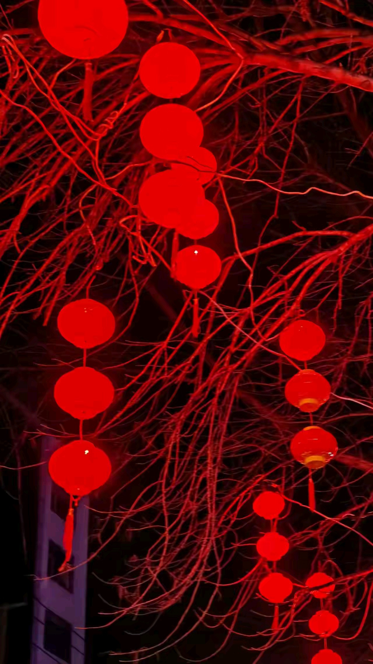 临近春节大街小巷灯光璀璨,大树上面灯带环绕,各式各样的灯笼高高挂起,