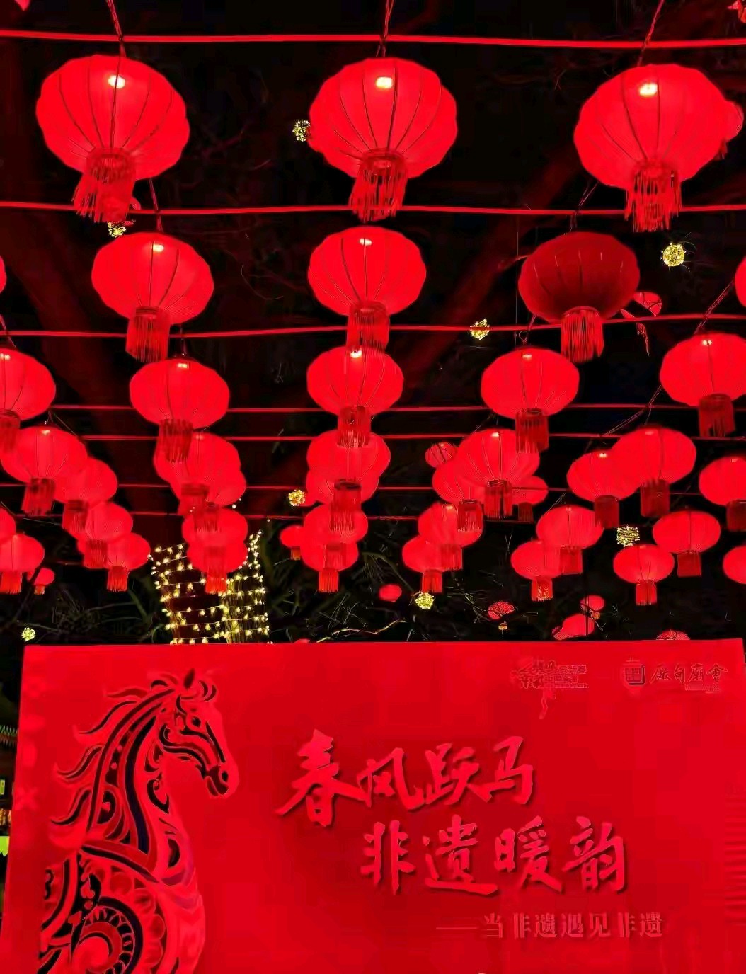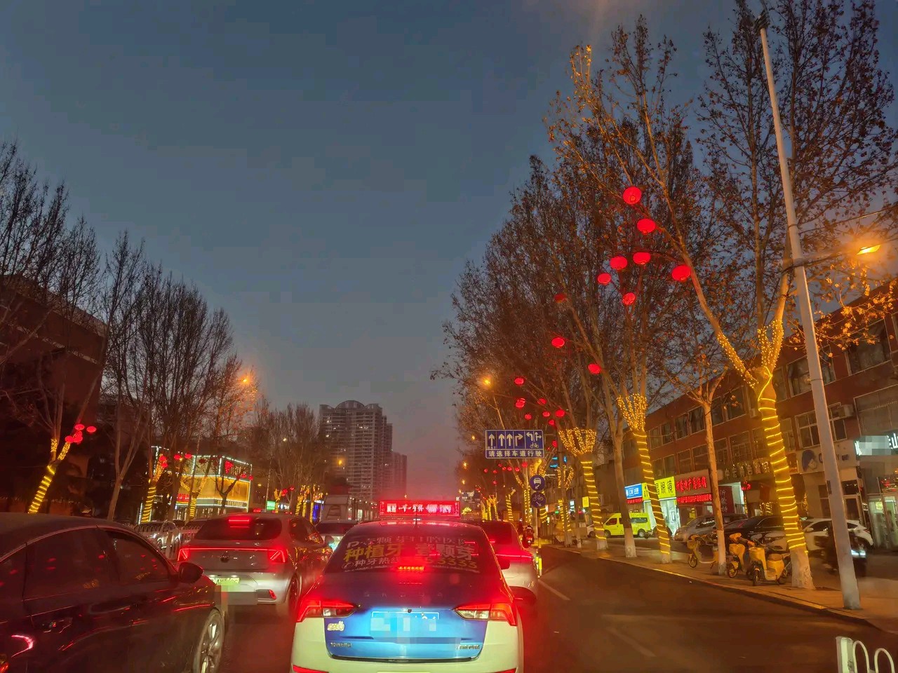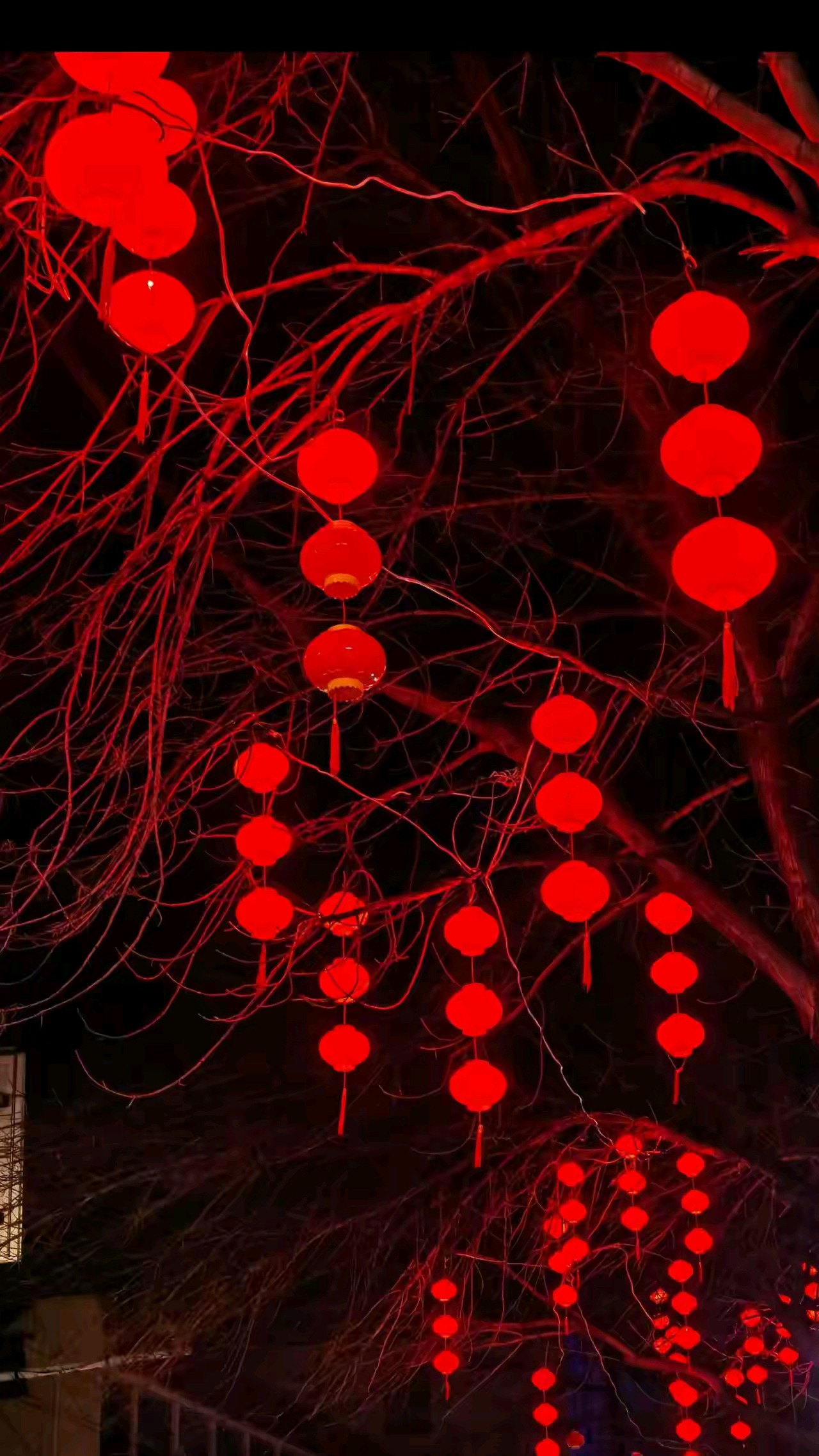 临近春节大街小巷灯光璀璨,大树上面灯带环绕,各式各样的灯笼高高挂起,
