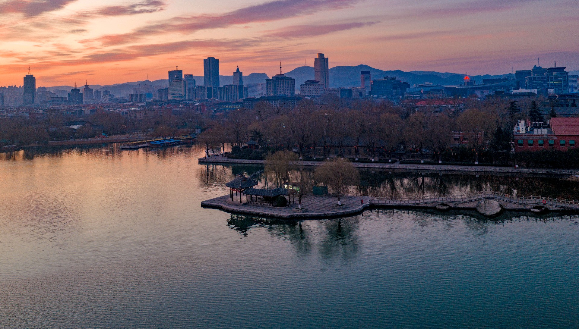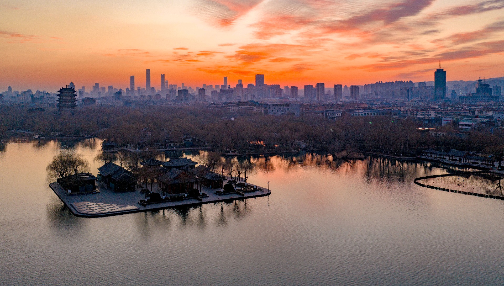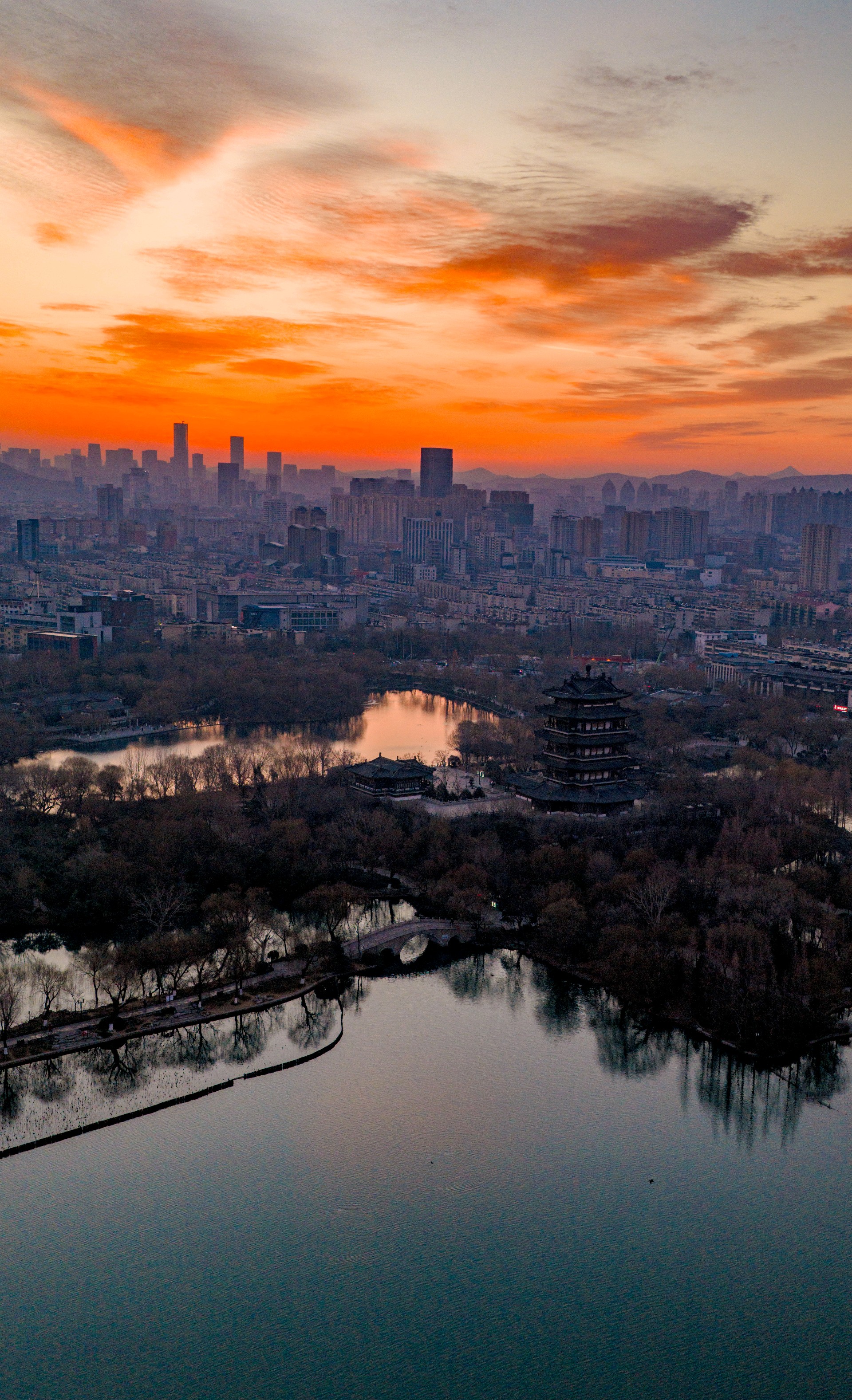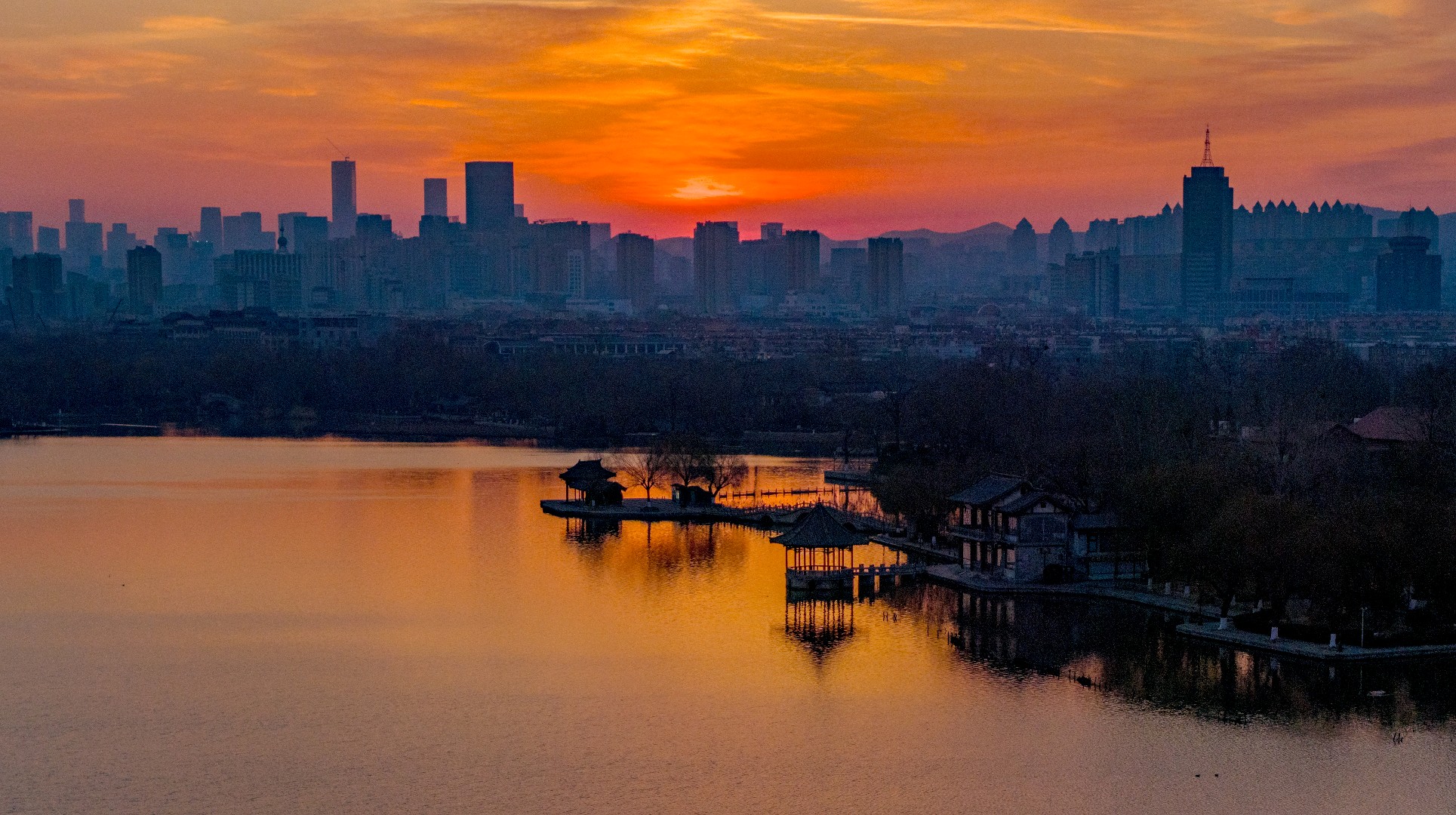 冬日清晨,大明湖朝霞漫天。东方天际晕染成温柔橘红,流云似火,将澄澈湖水映得绯红一片,水天相接,浑然一色。岸边亭台静立如画,疏枝在晨光里勾勒出清雅轮廓,寒日少了萧瑟,多了暖意。霞光漫洒,光影温柔,湖面裹在静谧温暖中,美得让人心安。