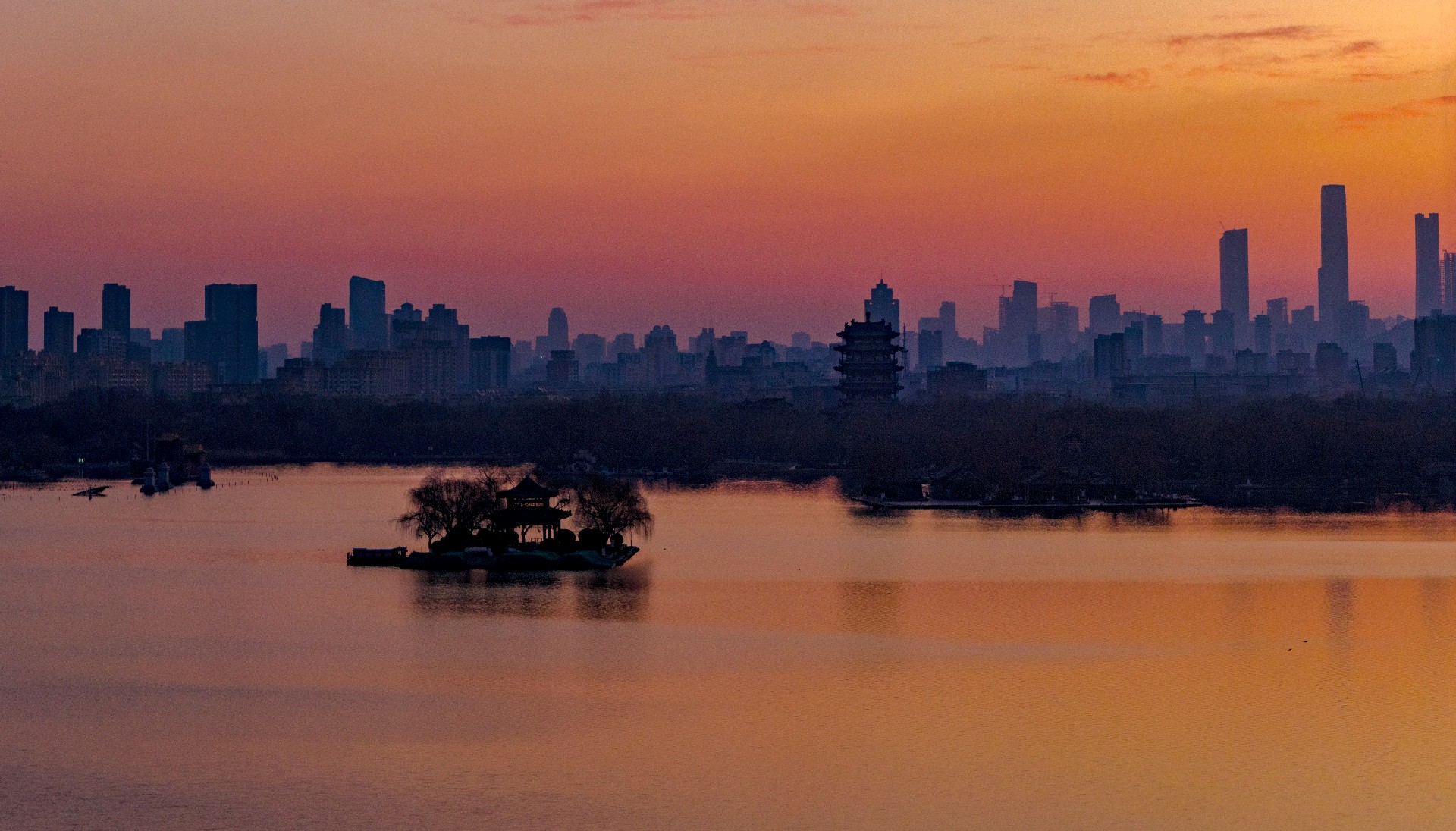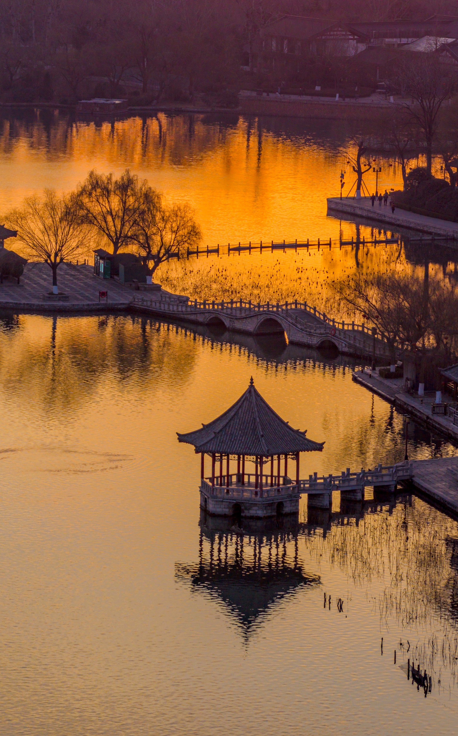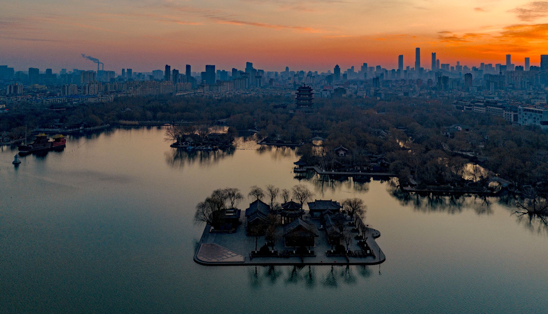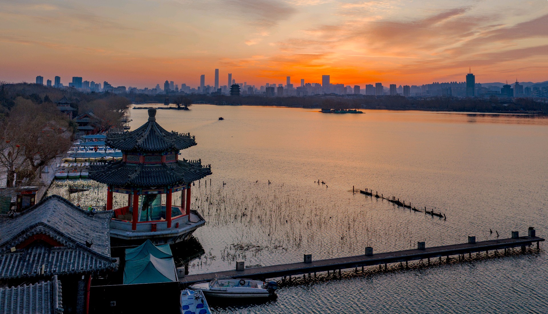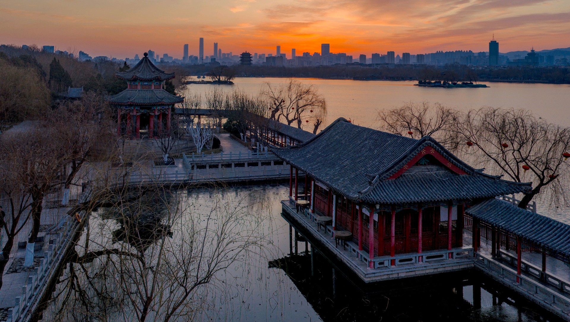 冬日清晨,大明湖朝霞漫天。东方天际晕染成温柔橘红,流云似火,将澄澈湖水映得绯红一片,水天相接,浑然一色。岸边亭台静立如画,疏枝在晨光里勾勒出清雅轮廓,寒日少了萧瑟,多了暖意。霞光漫洒,光影温柔,湖面裹在静谧温暖中,美得让人心安。