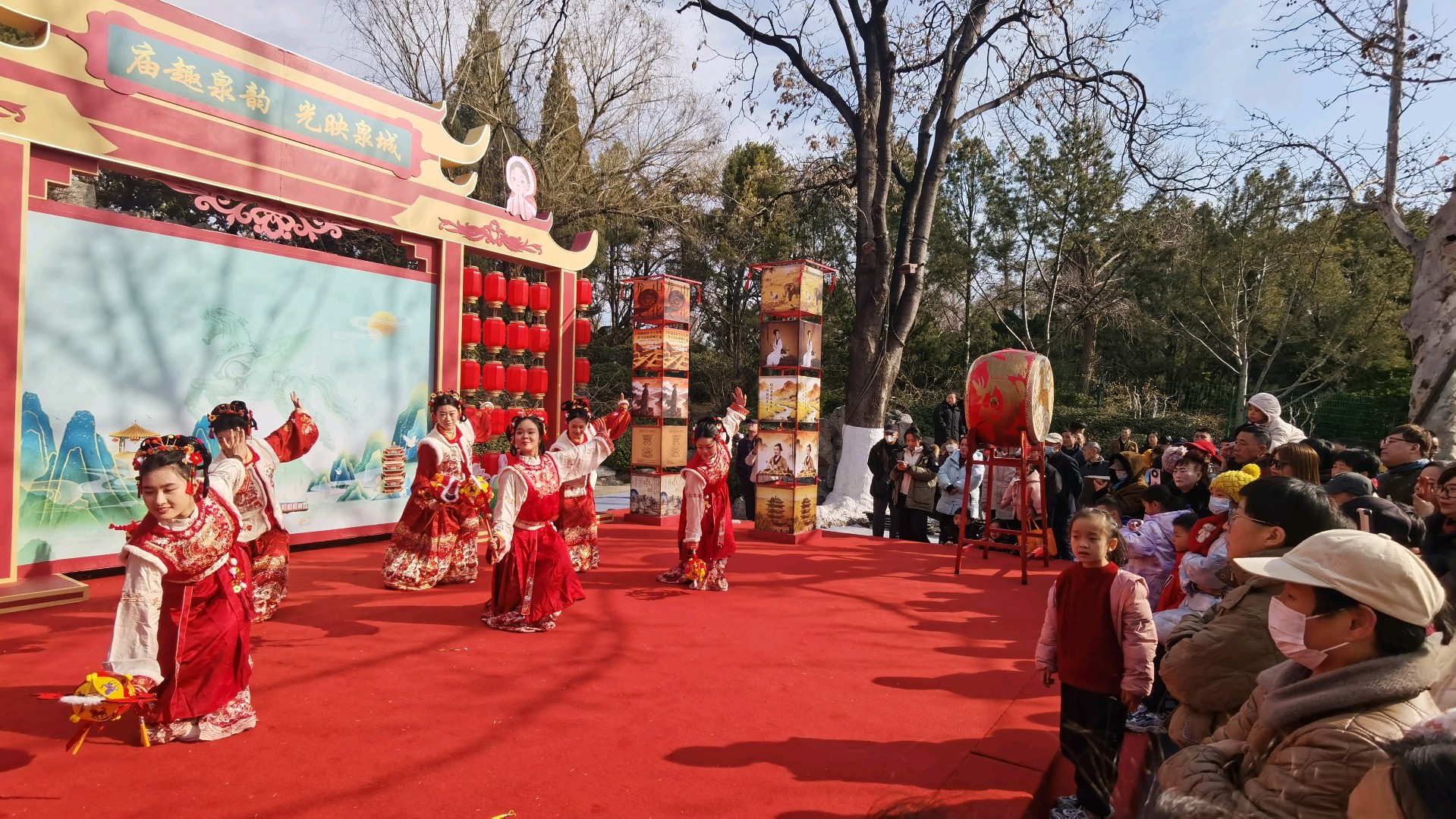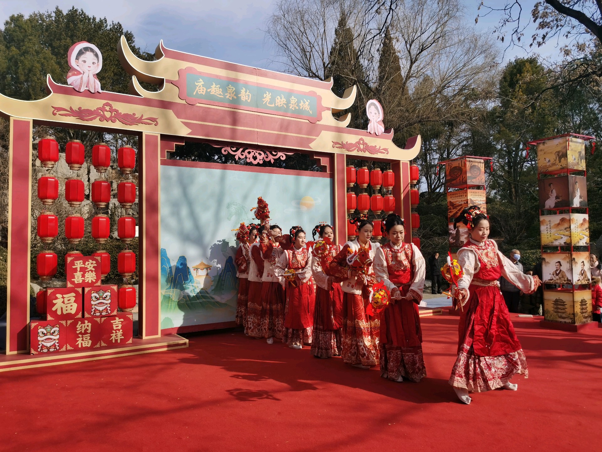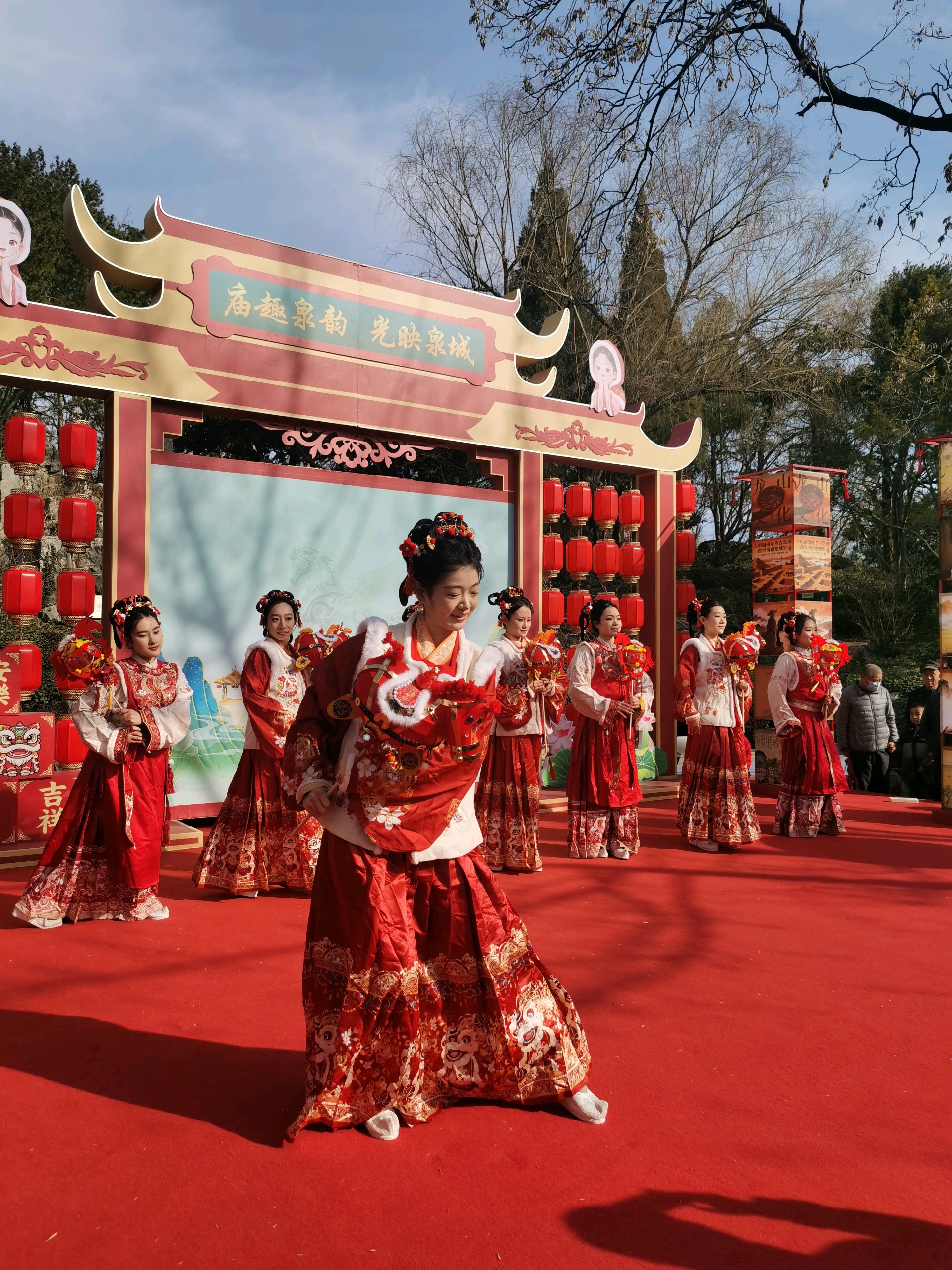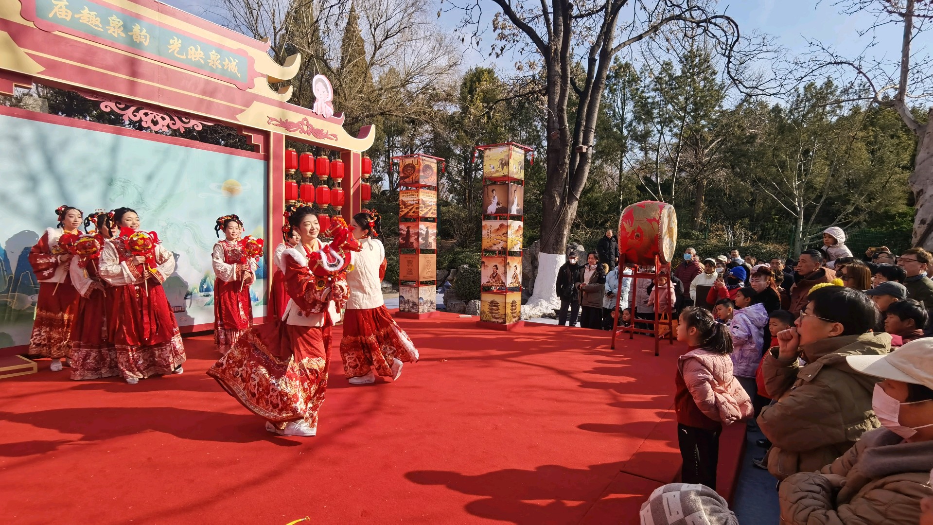 大年初一,大明湖人头攒动、喜气洋洋,自然广场上演马灯舞,吸引了众多游客,人们载歌载舞欢天喜地过大年。