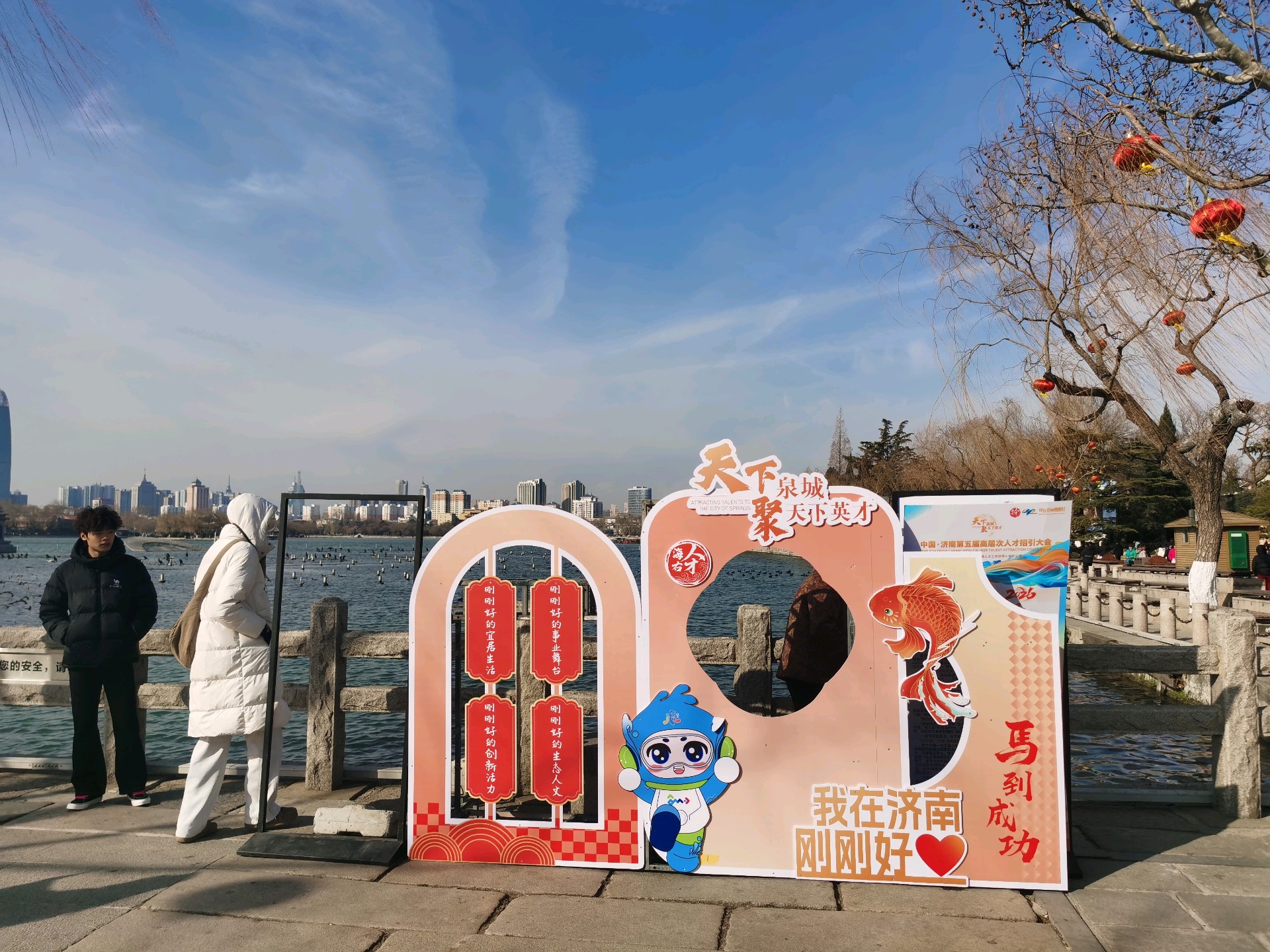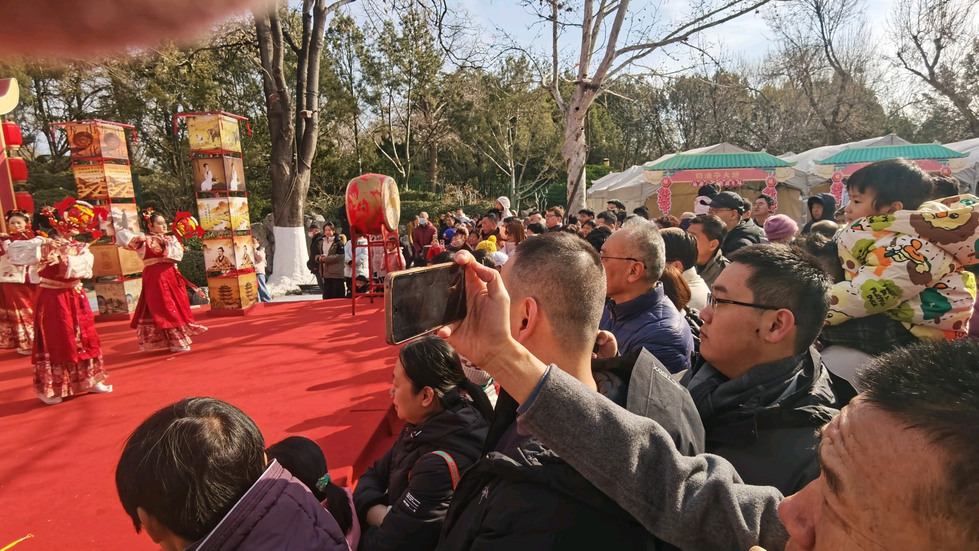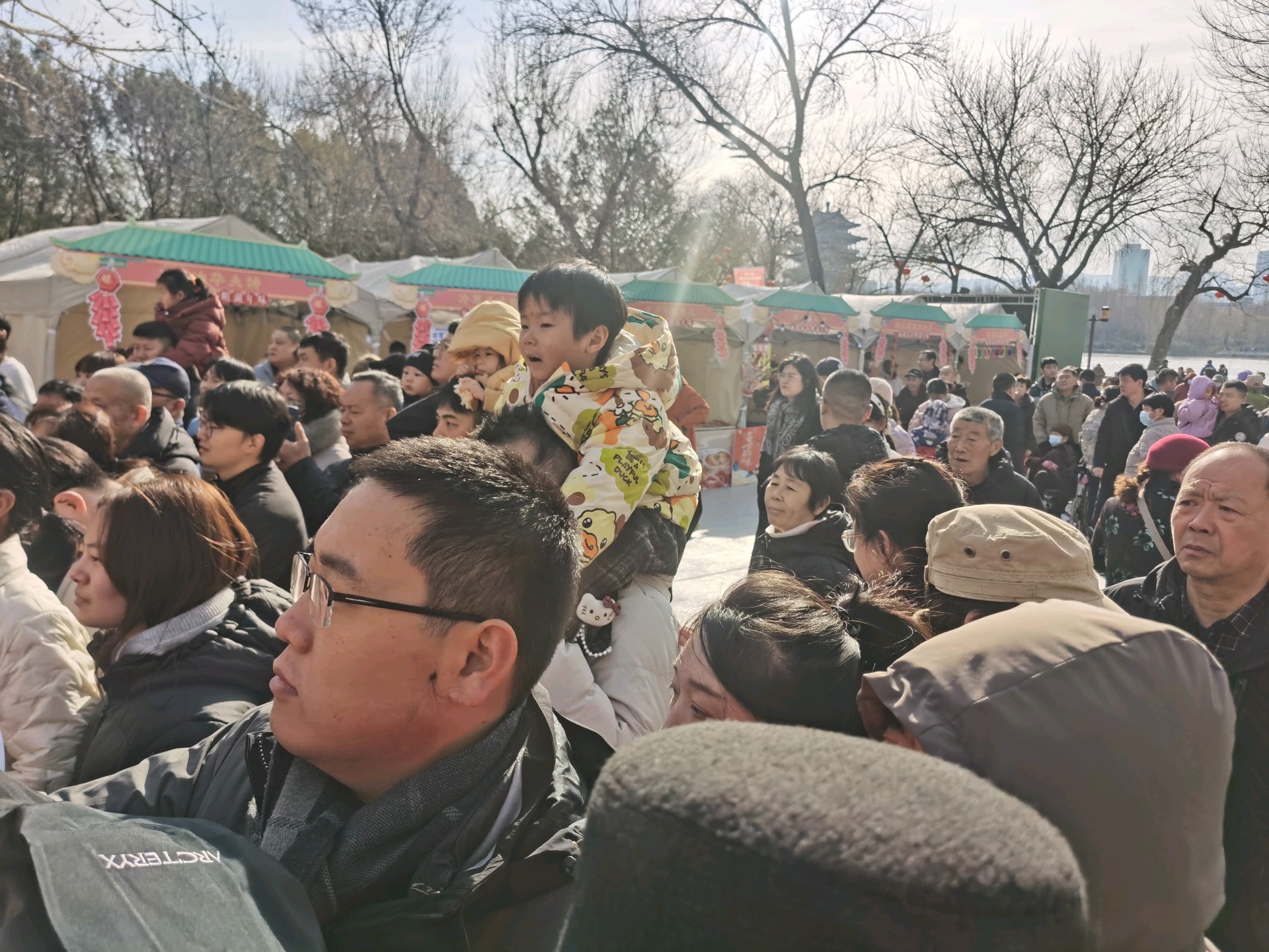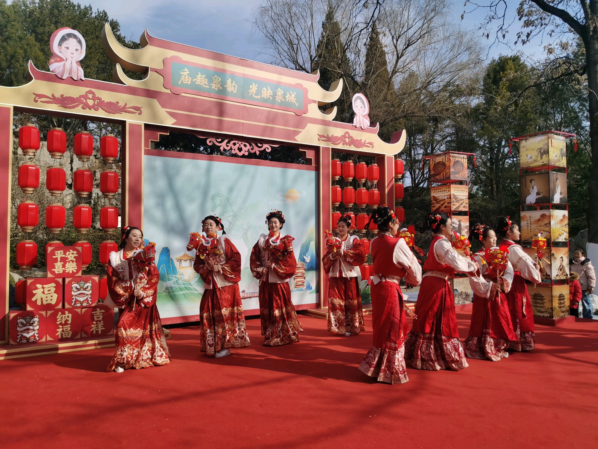 大年初一,大明湖人头攒动、喜气洋洋,自然广场上演马灯舞,吸引了众多游客,人们载歌载舞欢天喜地过大年。