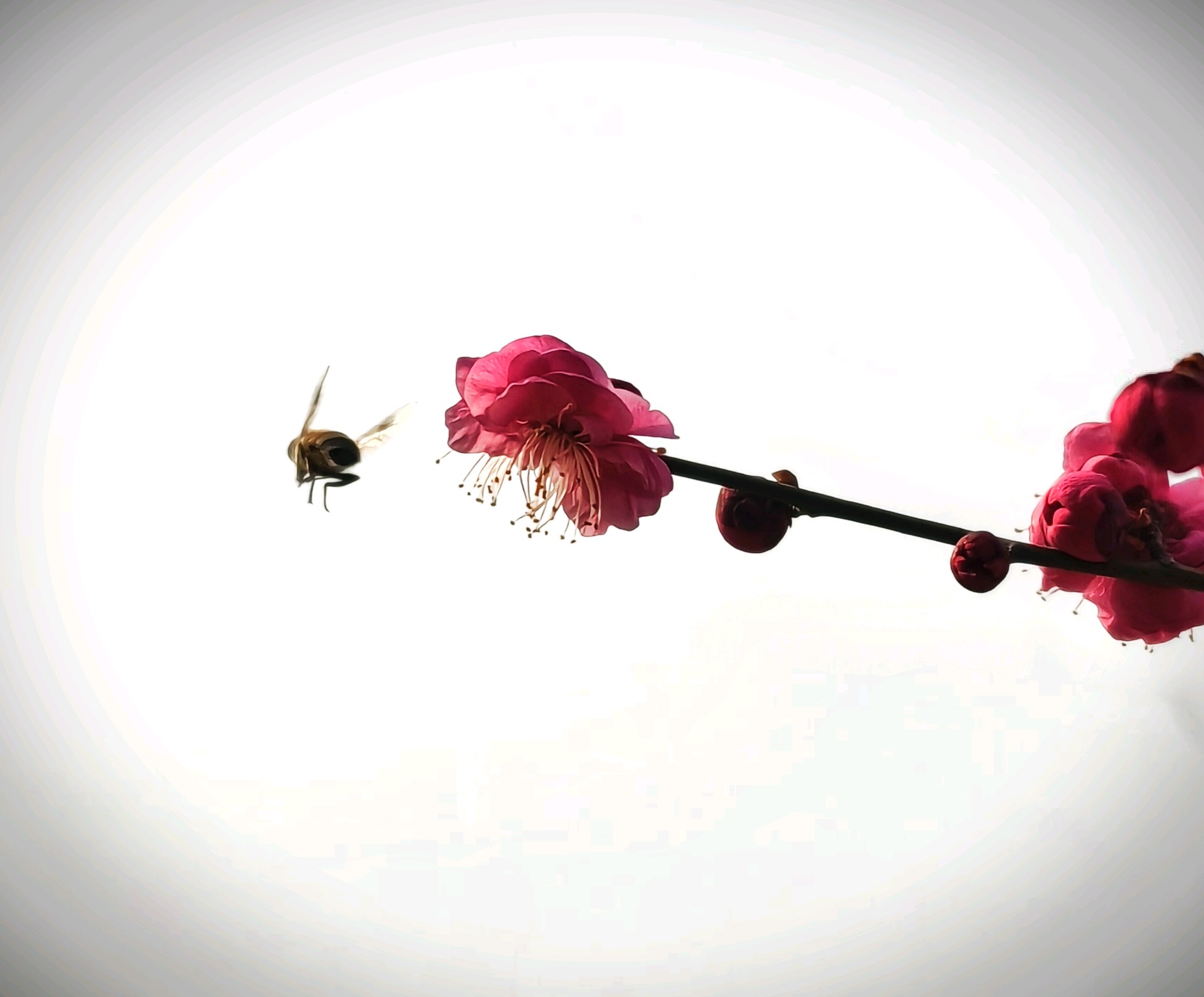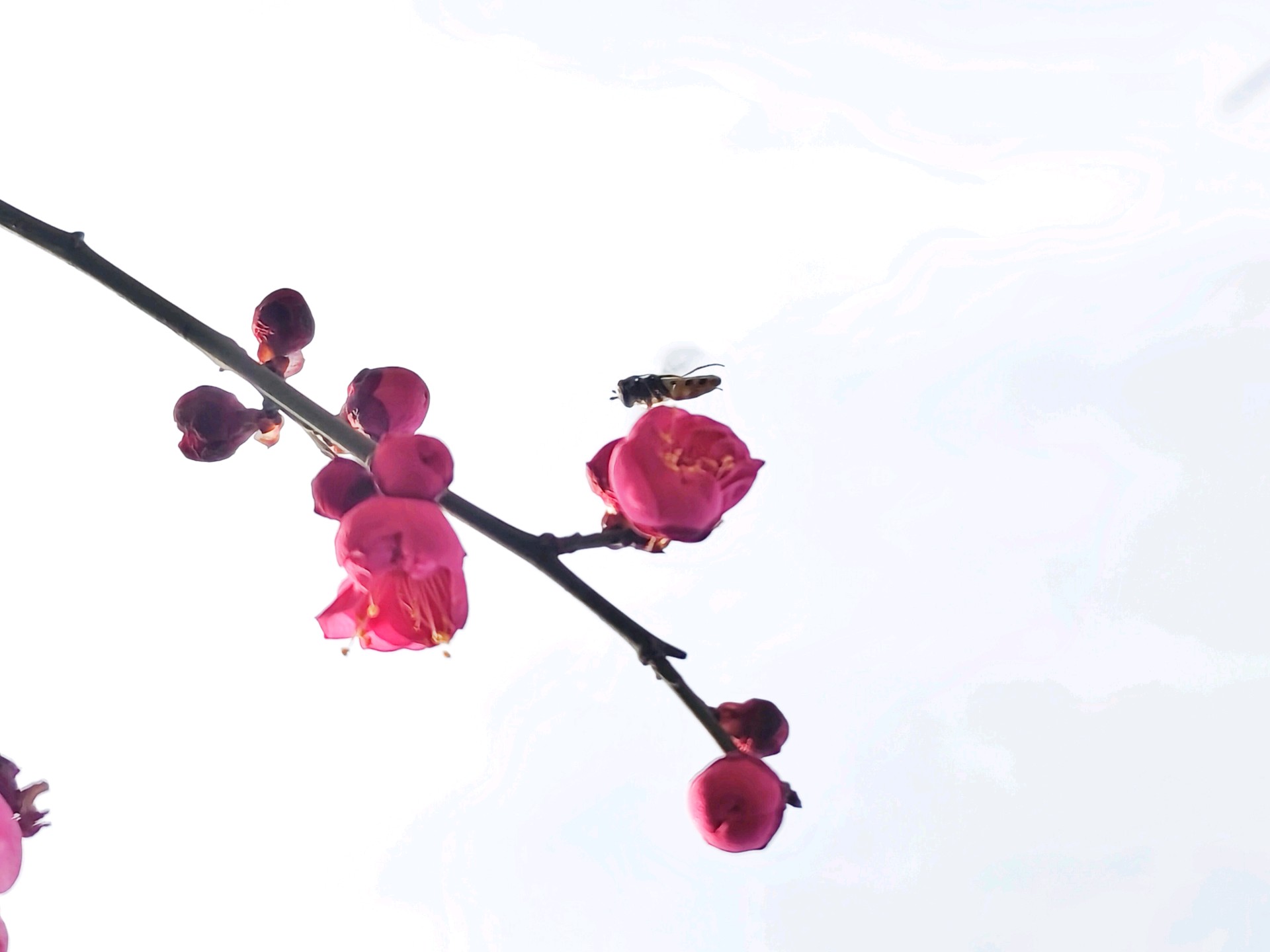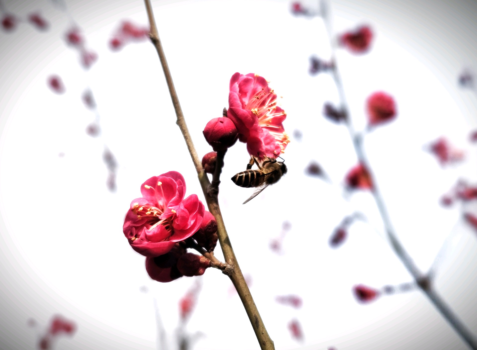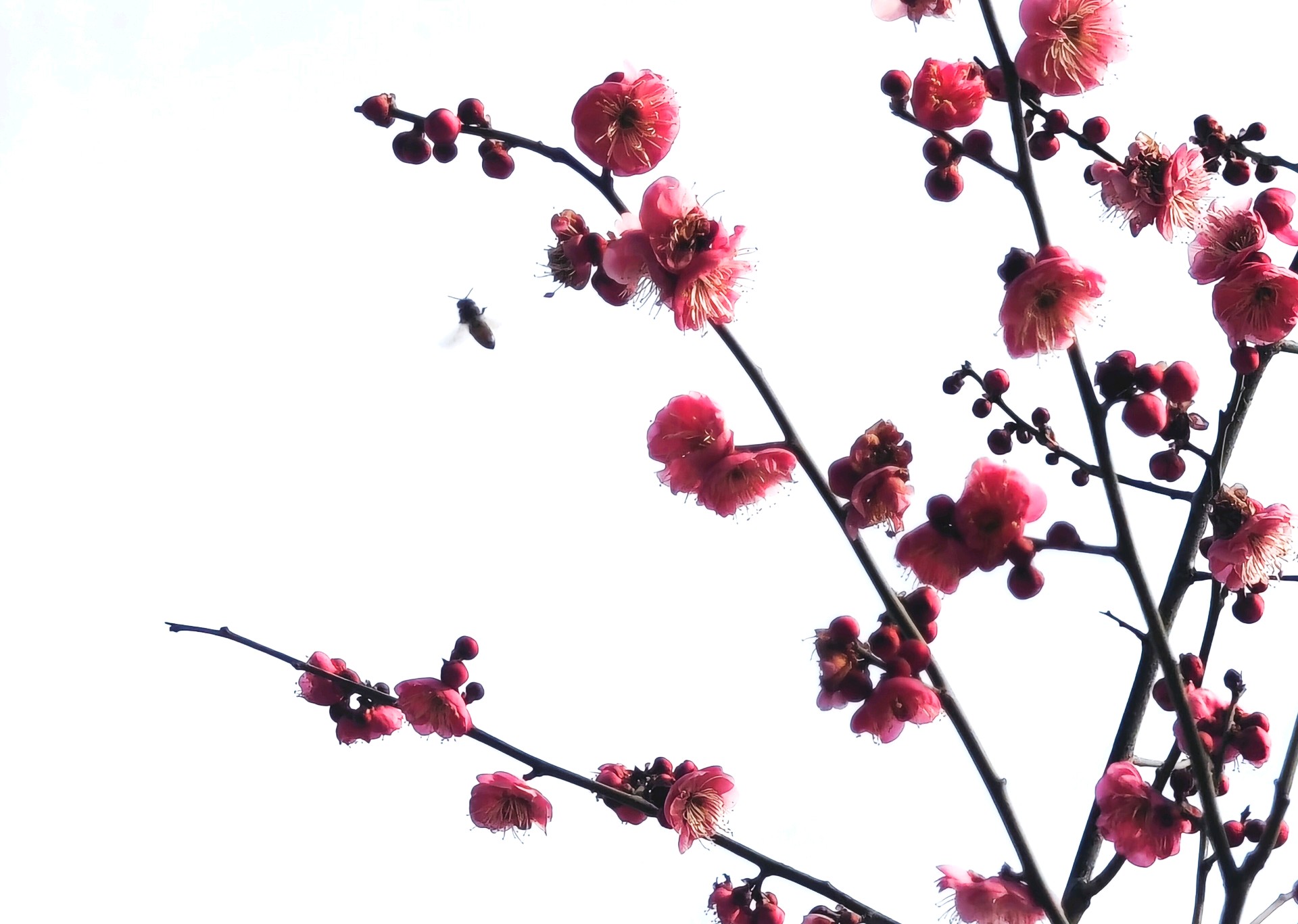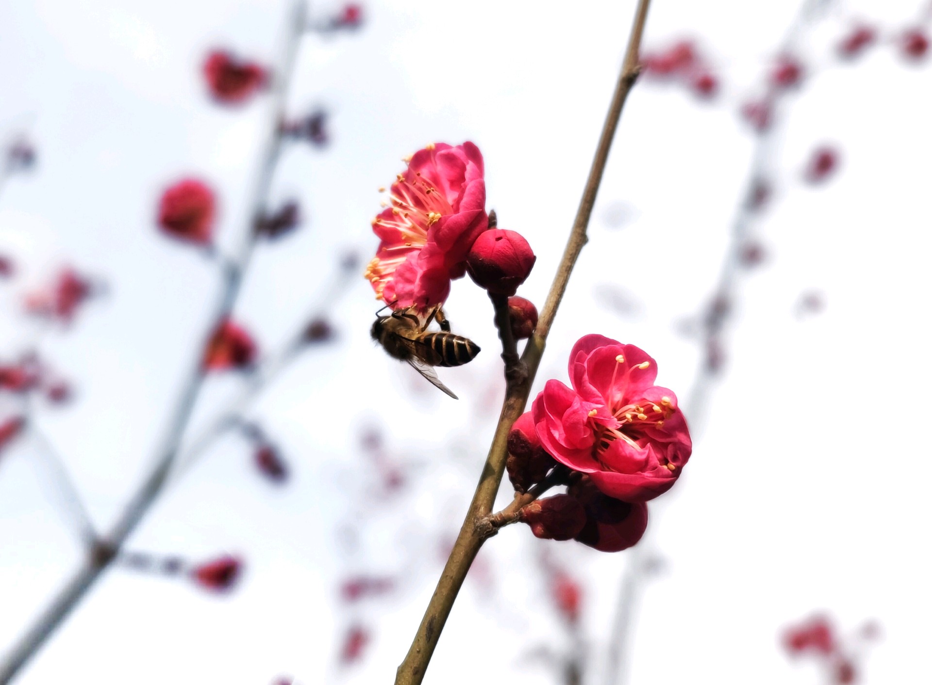 过年连日来,天气气温渐升,红梅烂漫绽放,花香馥郁,沁人心脾。众多蜜蜂穿梭其间,上下飞舞着辛勤采蜜,一幅春暖花开的动人景致跃然眼前。(高军摄影)