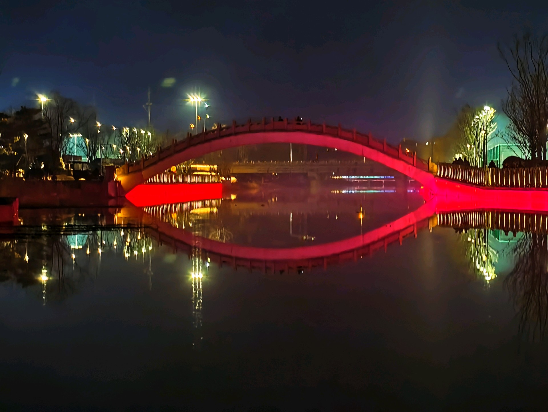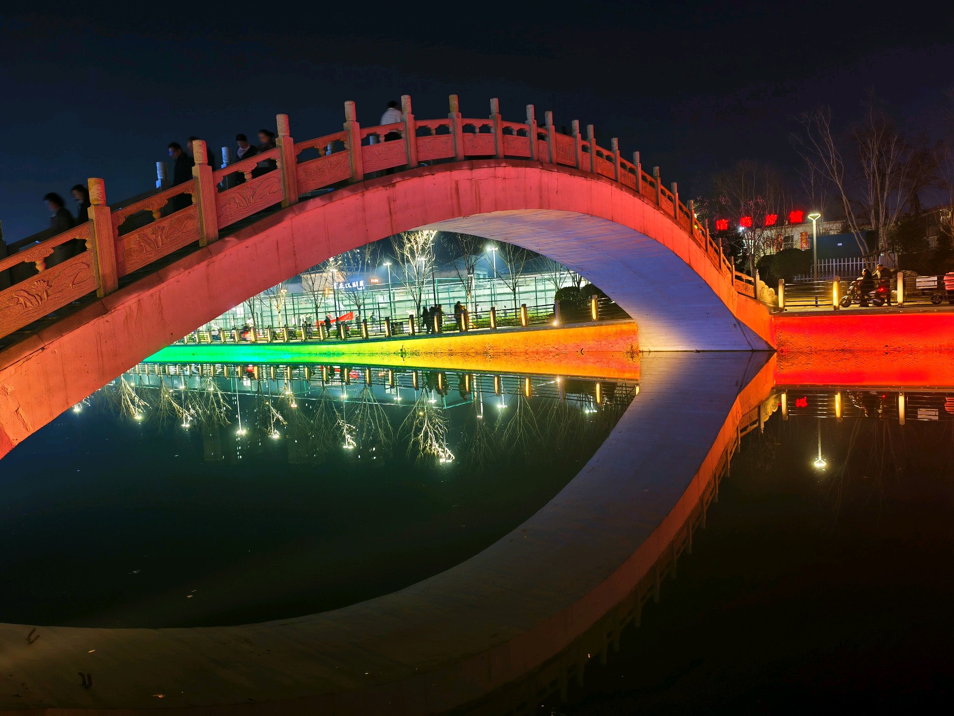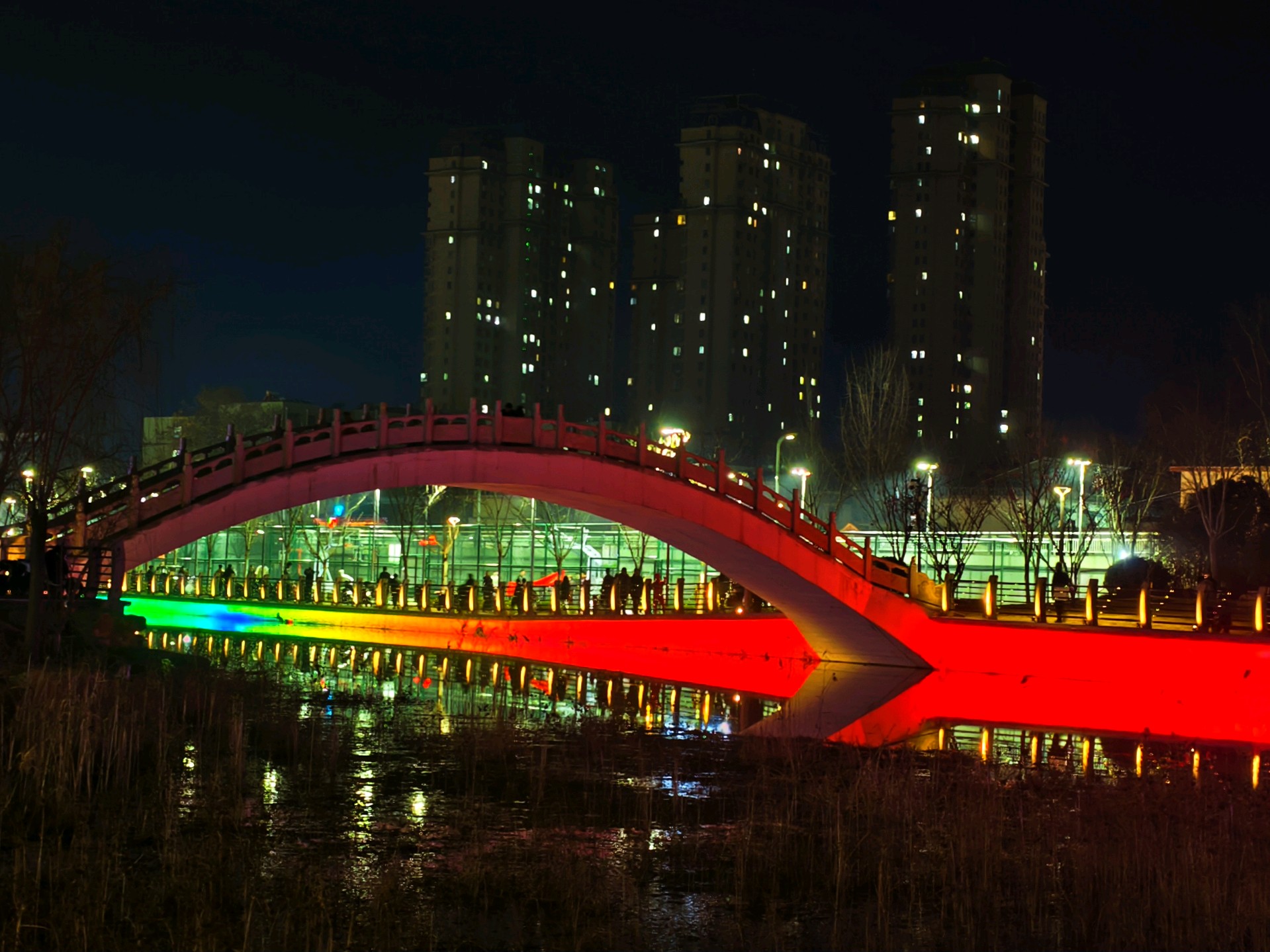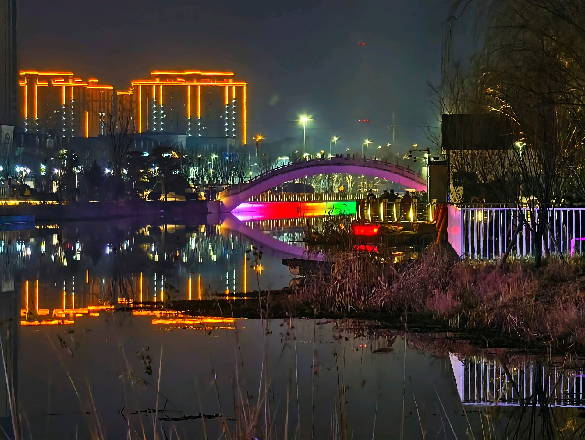 2026年2月19日正月初三晚,枣庄薛城区小沙河公园灯火璀璨。彩虹桥流光溢彩,与水面倒影相映成趣,市民漫步赏景、休闲游玩,尽享新春夜色里的祥和与惬意。(姚三石 摄影)