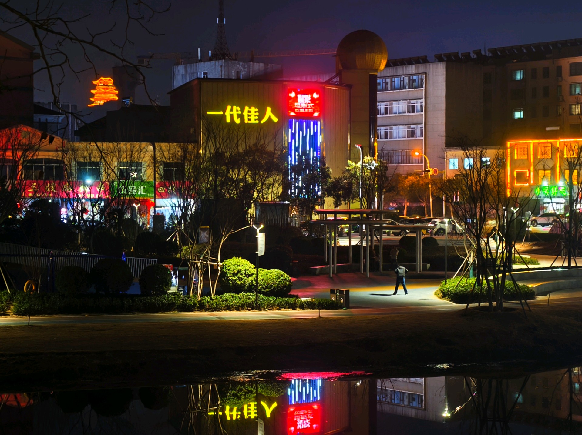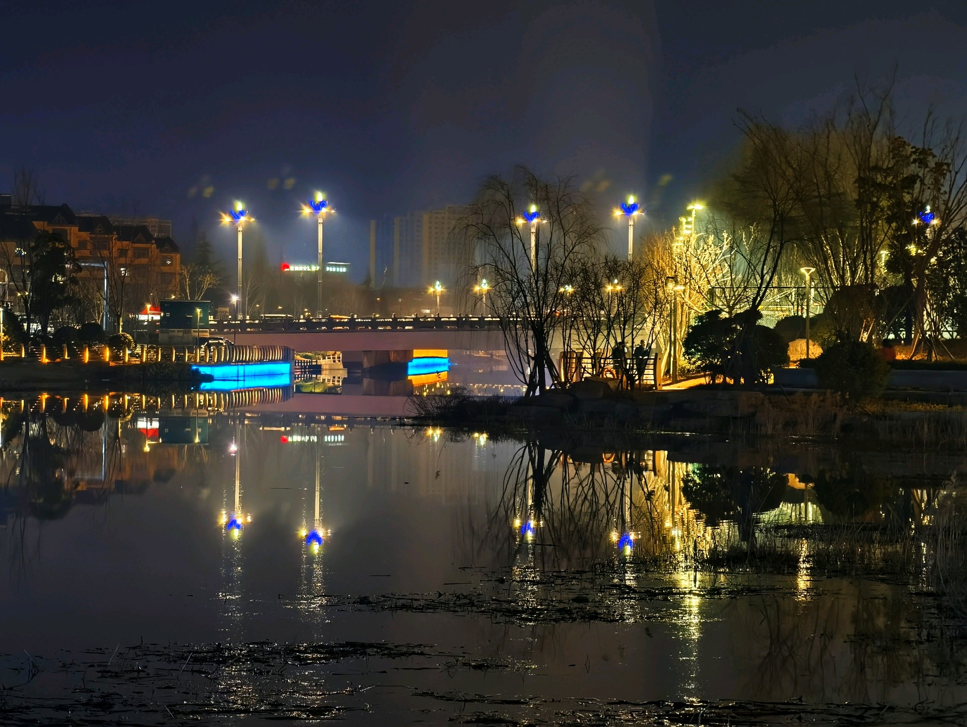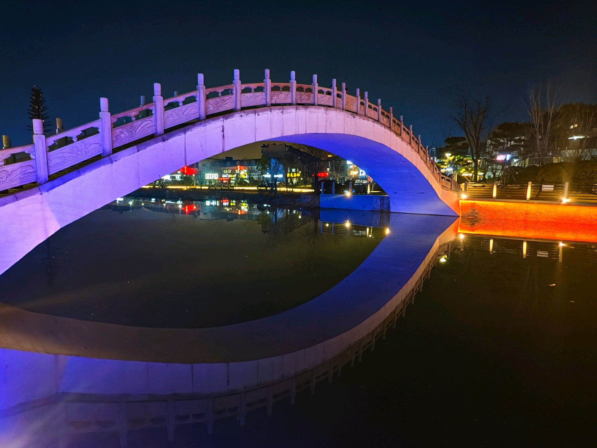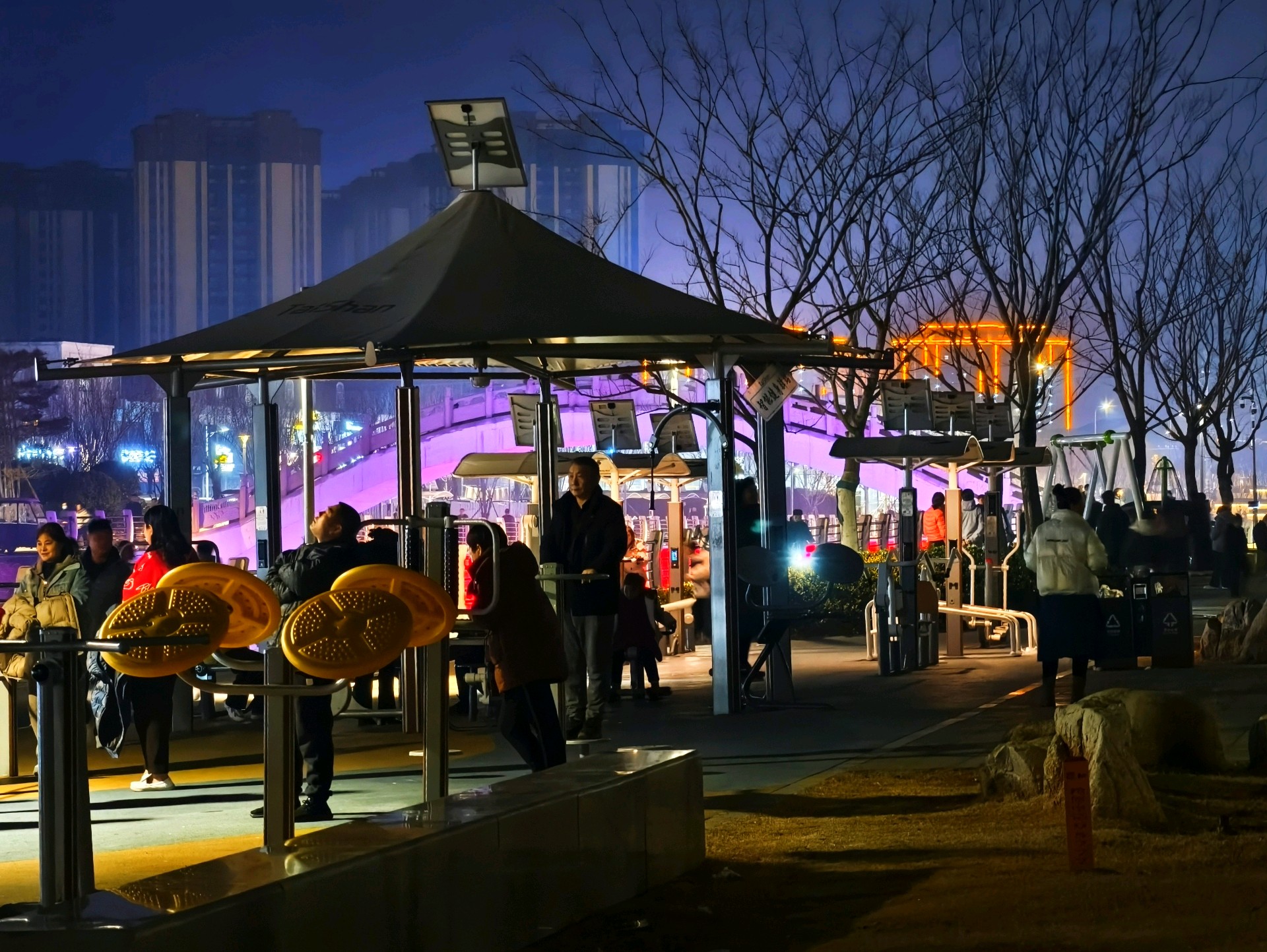 2026年2月19日正月初三晚,枣庄薛城区小沙河公园灯火璀璨。彩虹桥流光溢彩,与水面倒影相映成趣,市民漫步赏景、休闲游玩,尽享新春夜色里的祥和与惬意。(姚三石 摄影)
