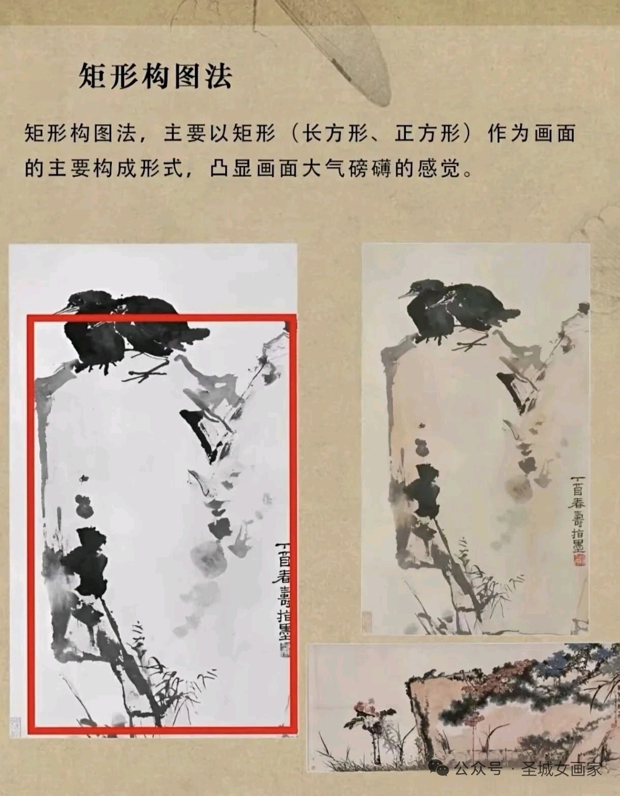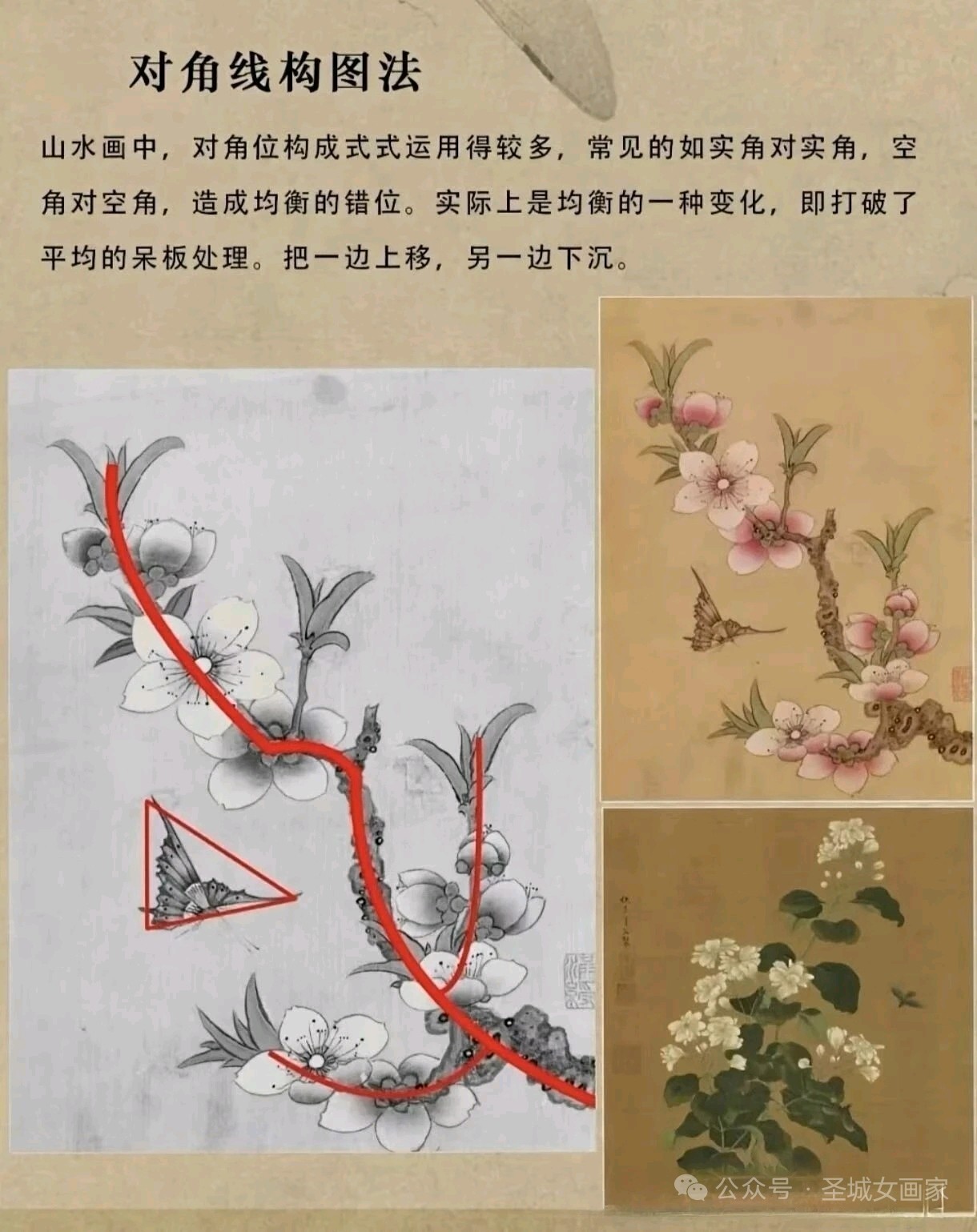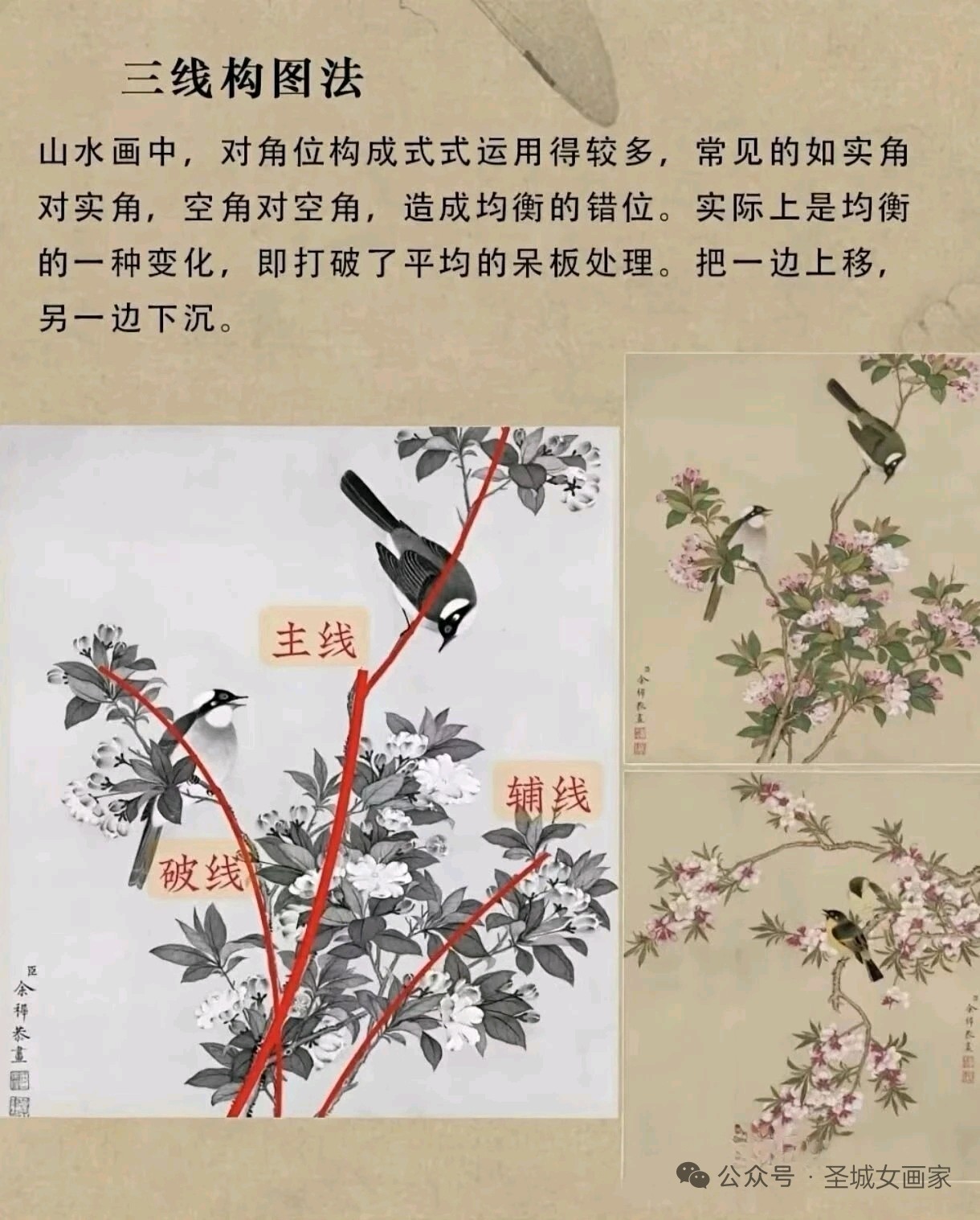 圣城曲阜画家郭美华近日推出国画构图法系列教学图集,深度解析传统技法精髓。该系列涵盖“由”字、折枝、几何形、对角线等经典构图法,通过红笔标注骨架与实例对比,直观展现画面气韵与形式美。作品兼具教学性与艺术性,为初学者提供了系统化的视觉指导。(通讯员:山东公用热电集团,渠成)