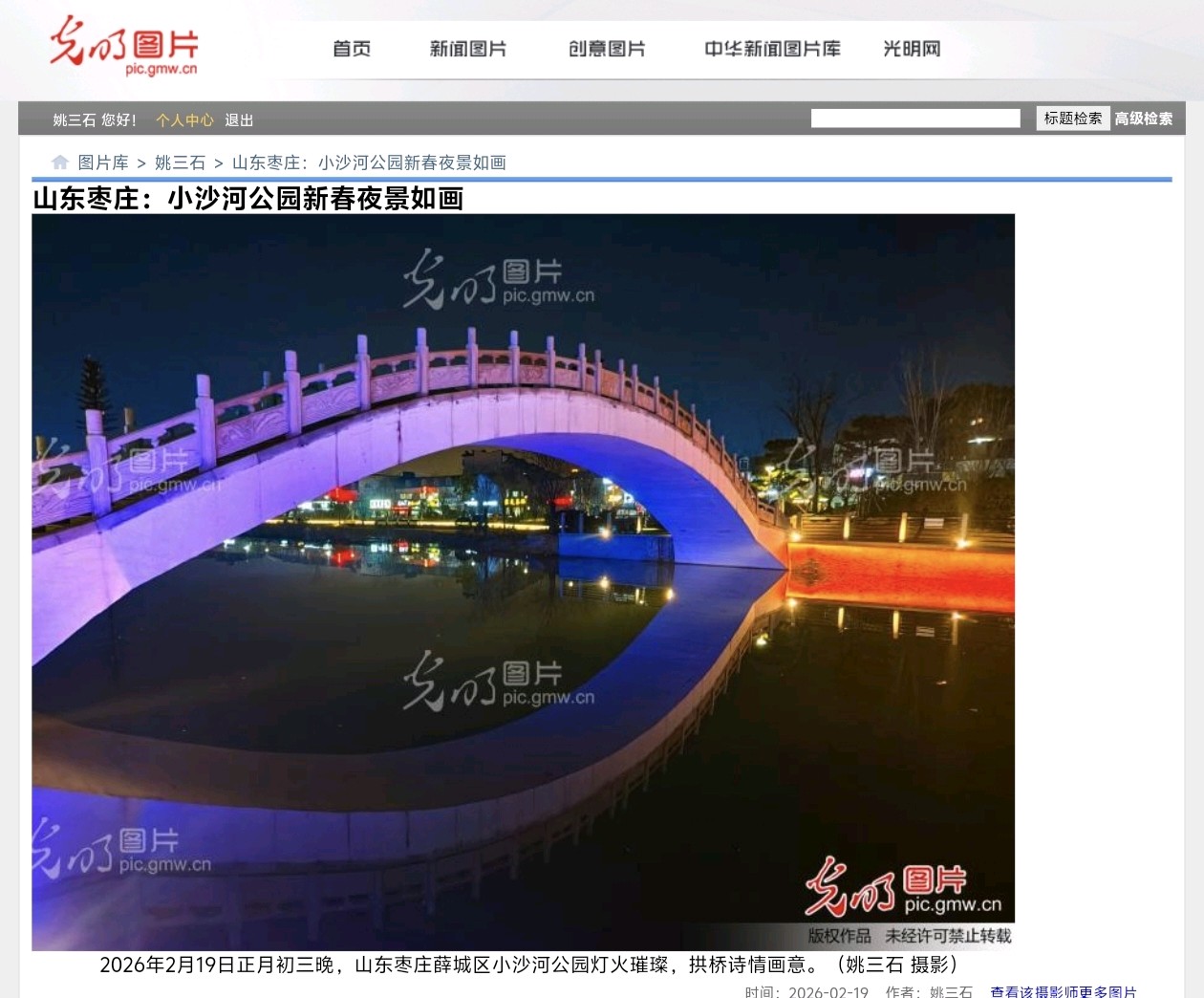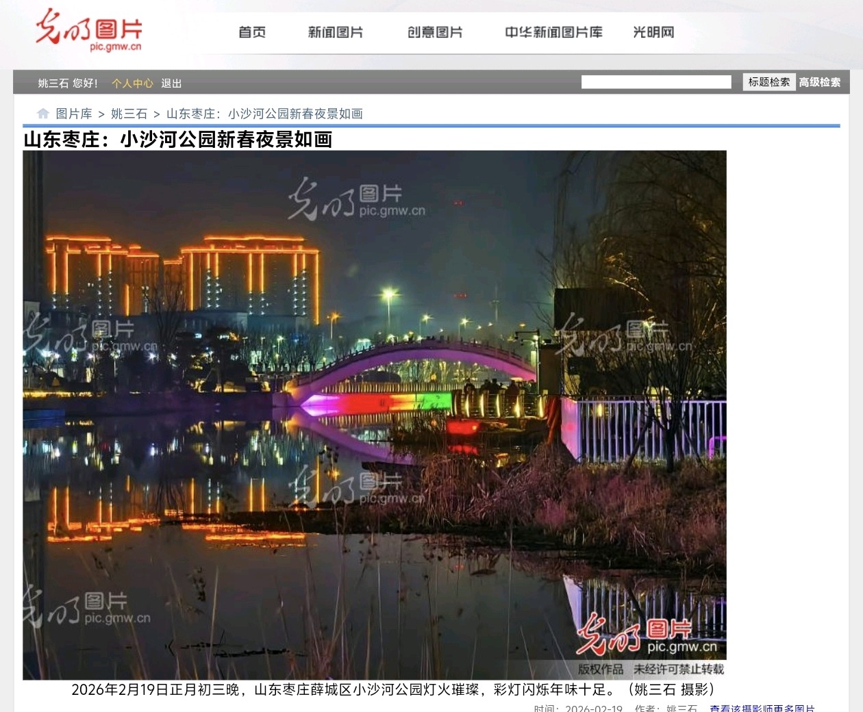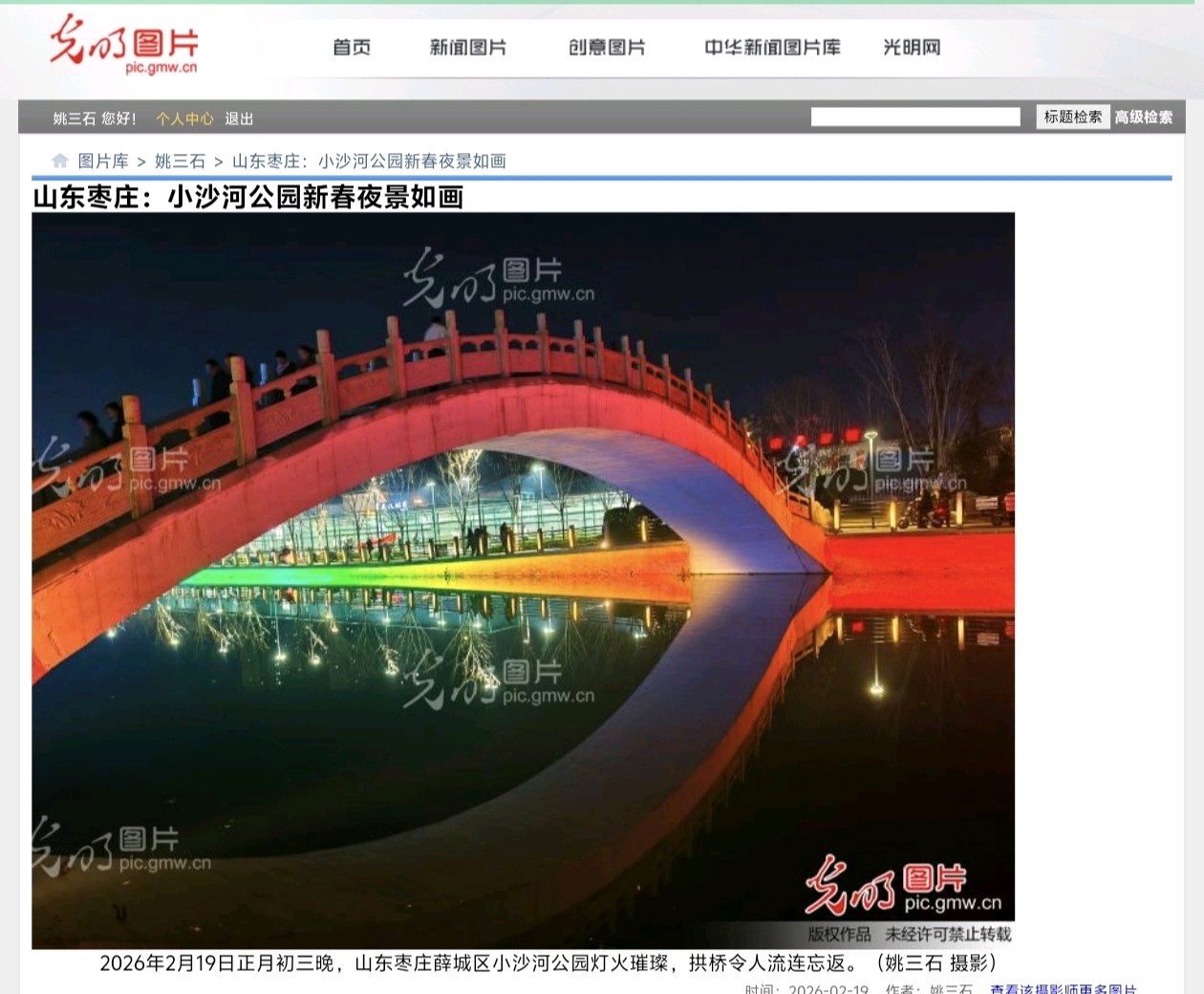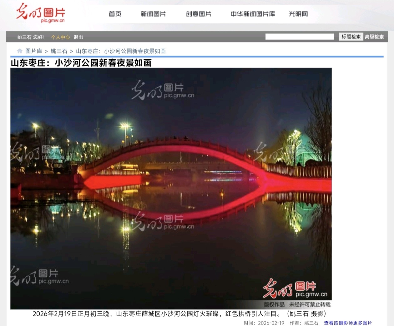 光明网发表姚三石摄影新闻《山东枣庄:小沙河公园新春夜景如画》2月20日,光明网发表光明图片签约摄影师,山东省摄影家协会会员姚三石摄影新闻作品《山东枣庄:小沙河公园新春夜景如画》(组图8幅)。山东枣庄:小沙河公园新春夜景如画 2026年2月19日正月初三晚,枣庄薛城区小沙河公园灯火璀璨。彩虹桥流光溢彩,与水面倒影相映成趣,市民漫步赏景、休闲游玩,尽享新春夜色里的祥和与惬意。(姚三石 摄影)