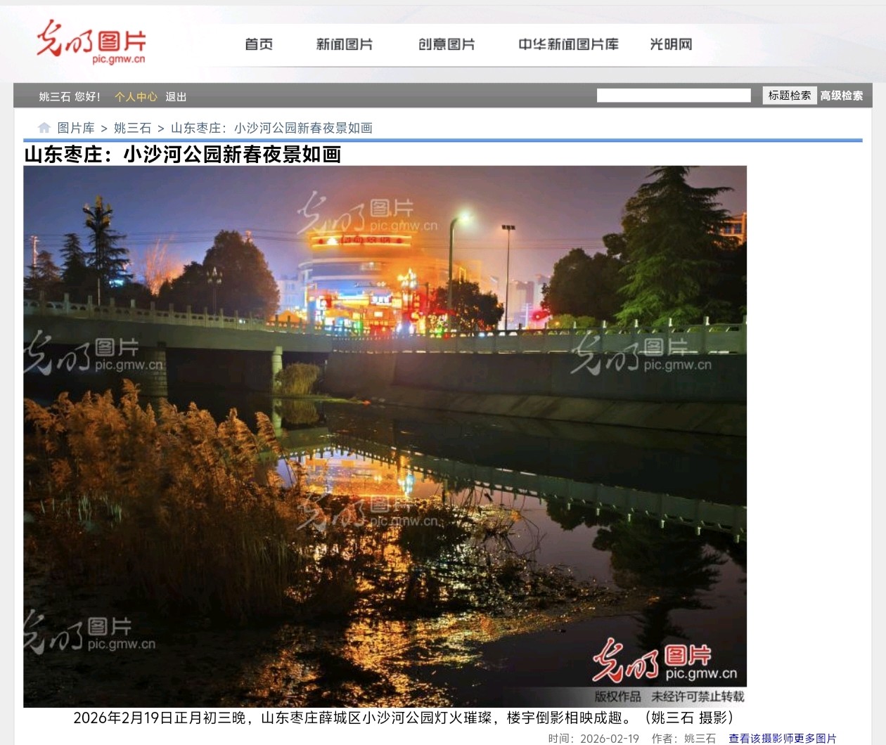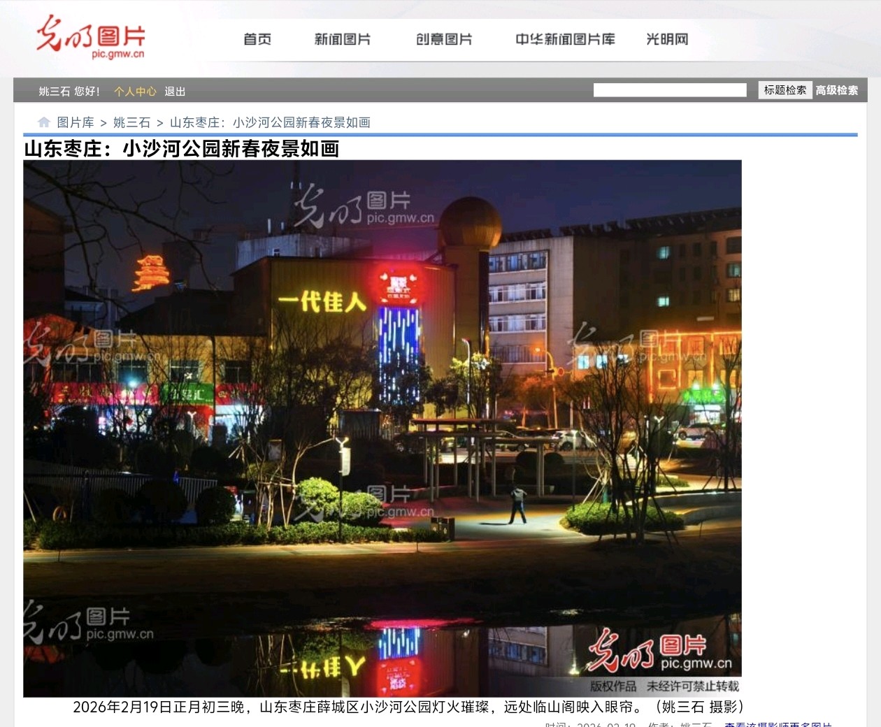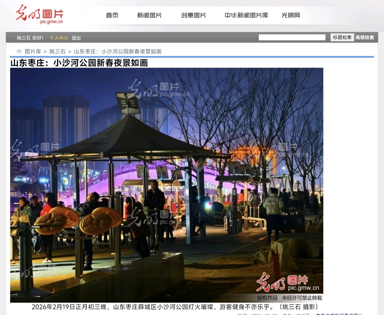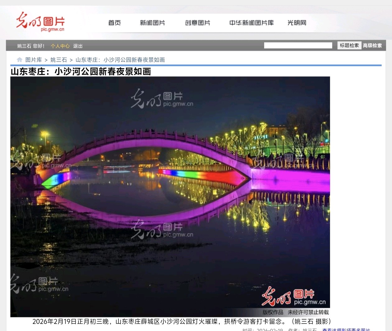 光明网发表姚三石摄影新闻《山东枣庄:小沙河公园新春夜景如画》2月20日,光明网发表光明图片签约摄影师,山东省摄影家协会会员姚三石摄影新闻作品《山东枣庄:小沙河公园新春夜景如画》(组图8幅)。山东枣庄:小沙河公园新春夜景如画 2026年2月19日正月初三晚,枣庄薛城区小沙河公园灯火璀璨。彩虹桥流光溢彩,与水面倒影相映成趣,市民漫步赏景、休闲游玩,尽享新春夜色里的祥和与惬意。(姚三石 摄影)