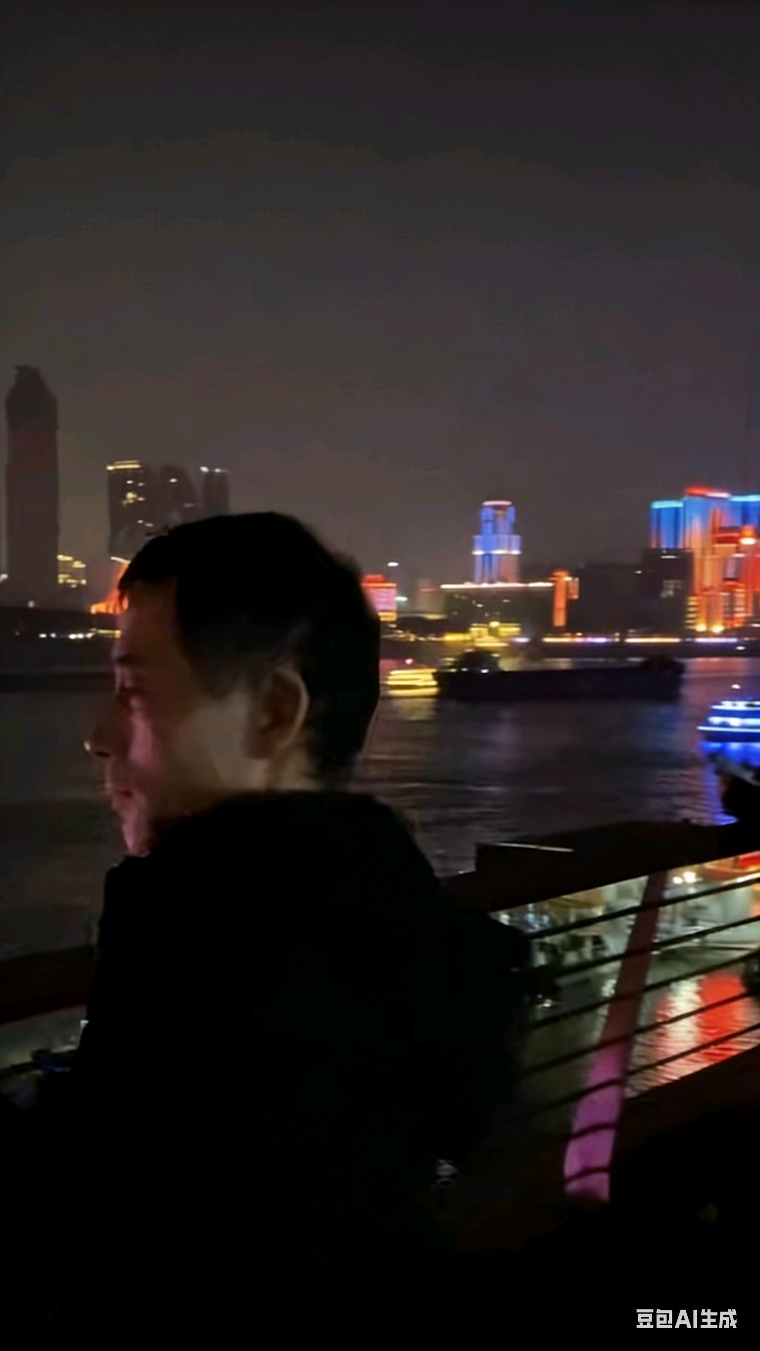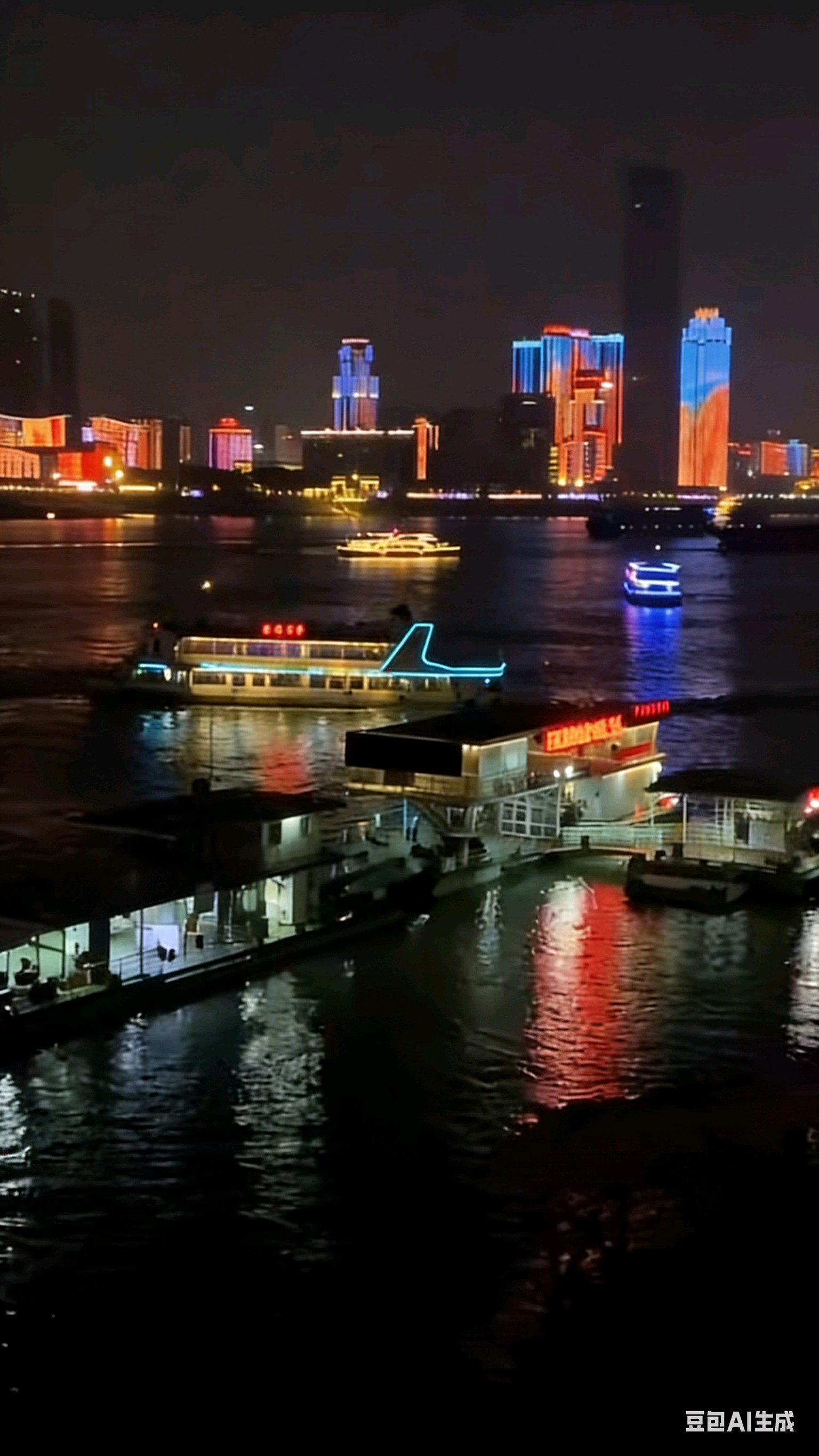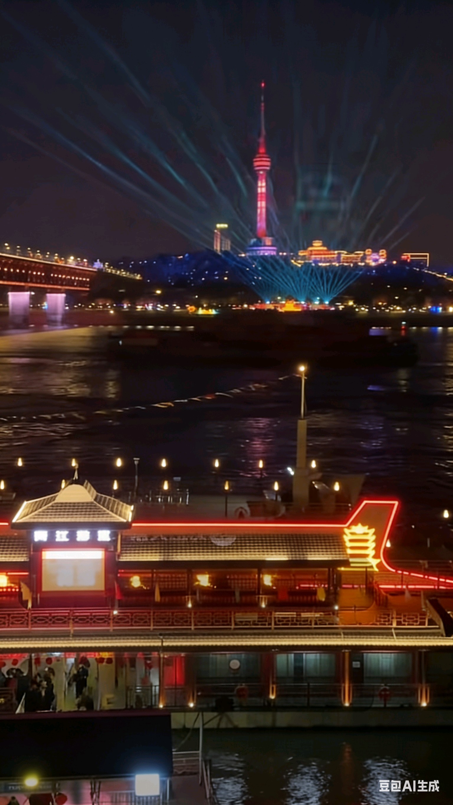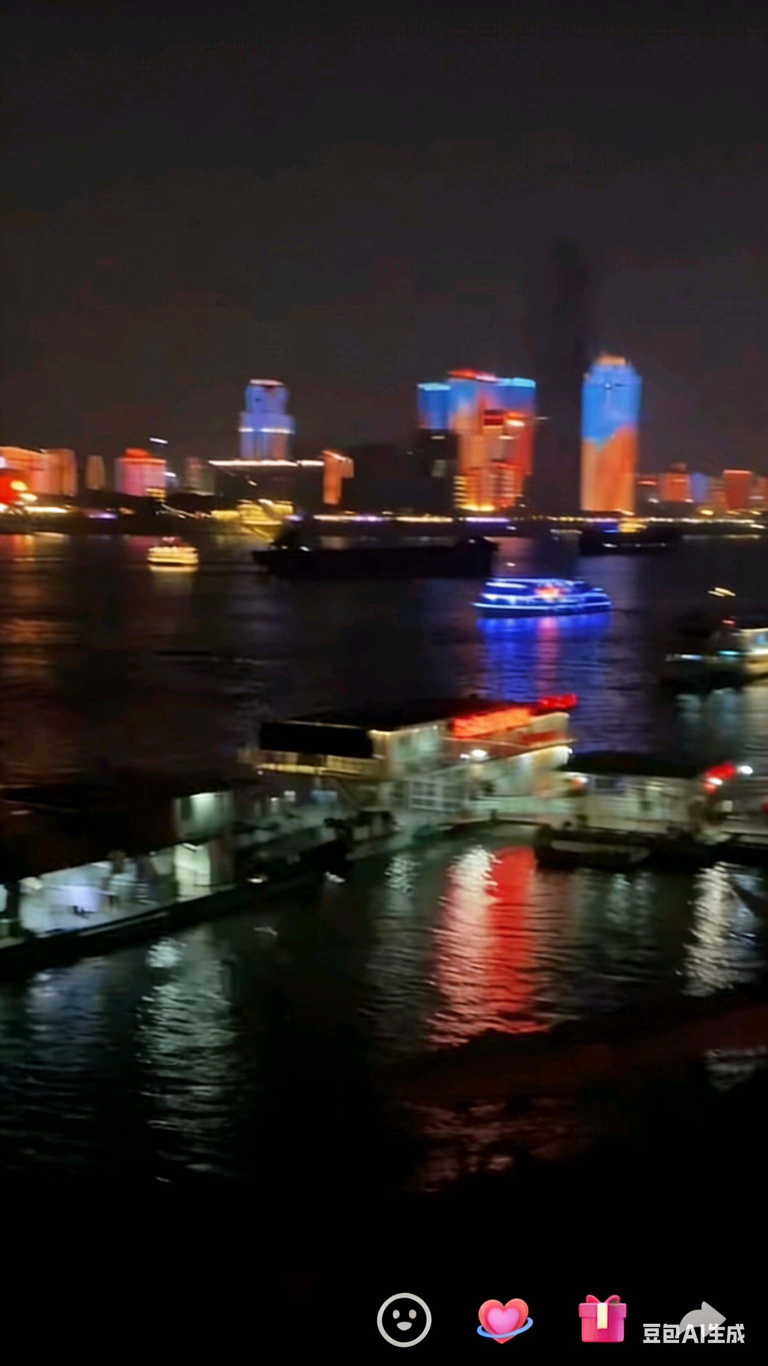 春节期间。黄浦江畔灯光璀璨,江对面的高楼五彩斑斓,江中船舶也都灯火辉煌,整个一幅五彩缤纷的珣丽画卷。
