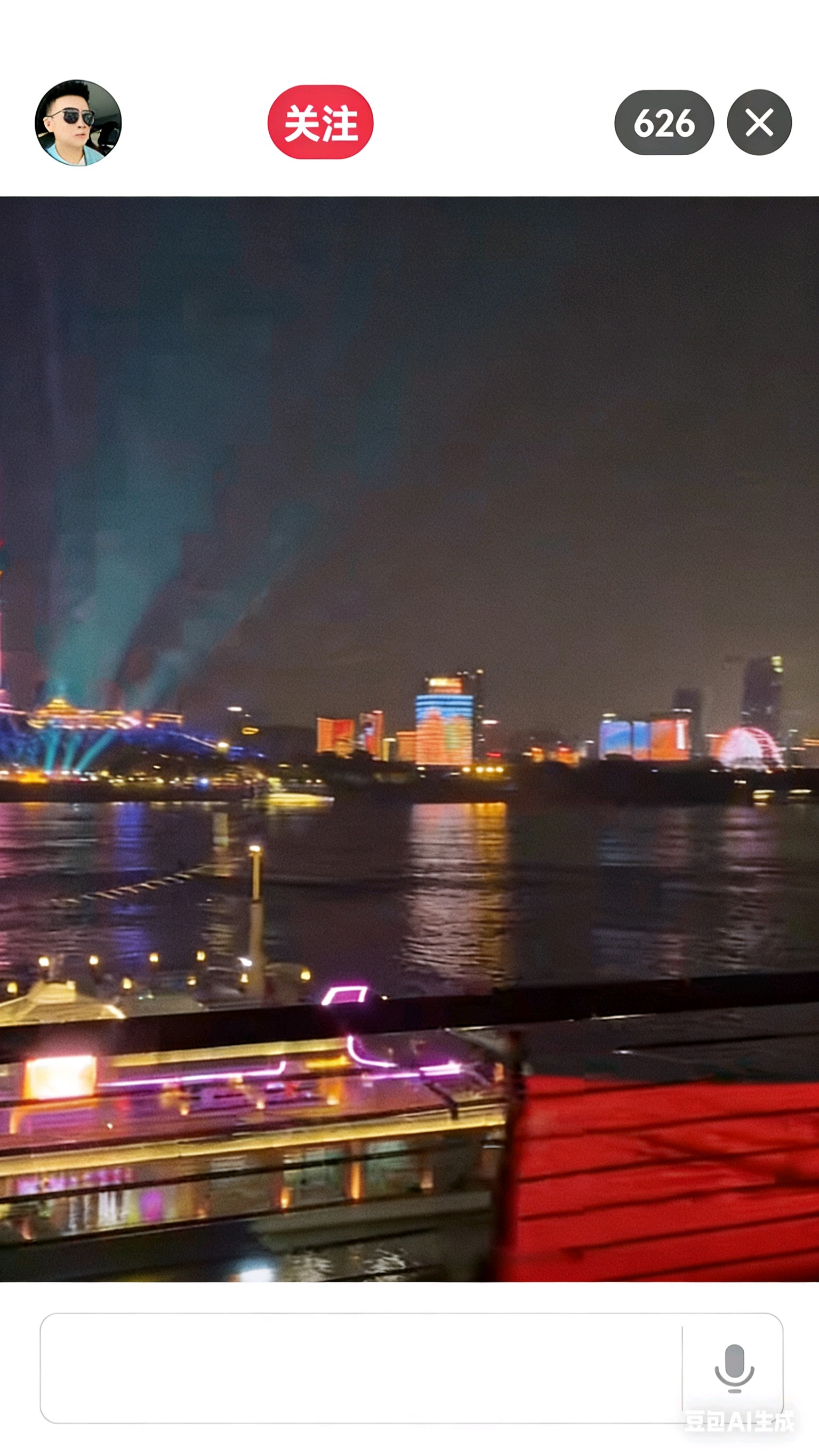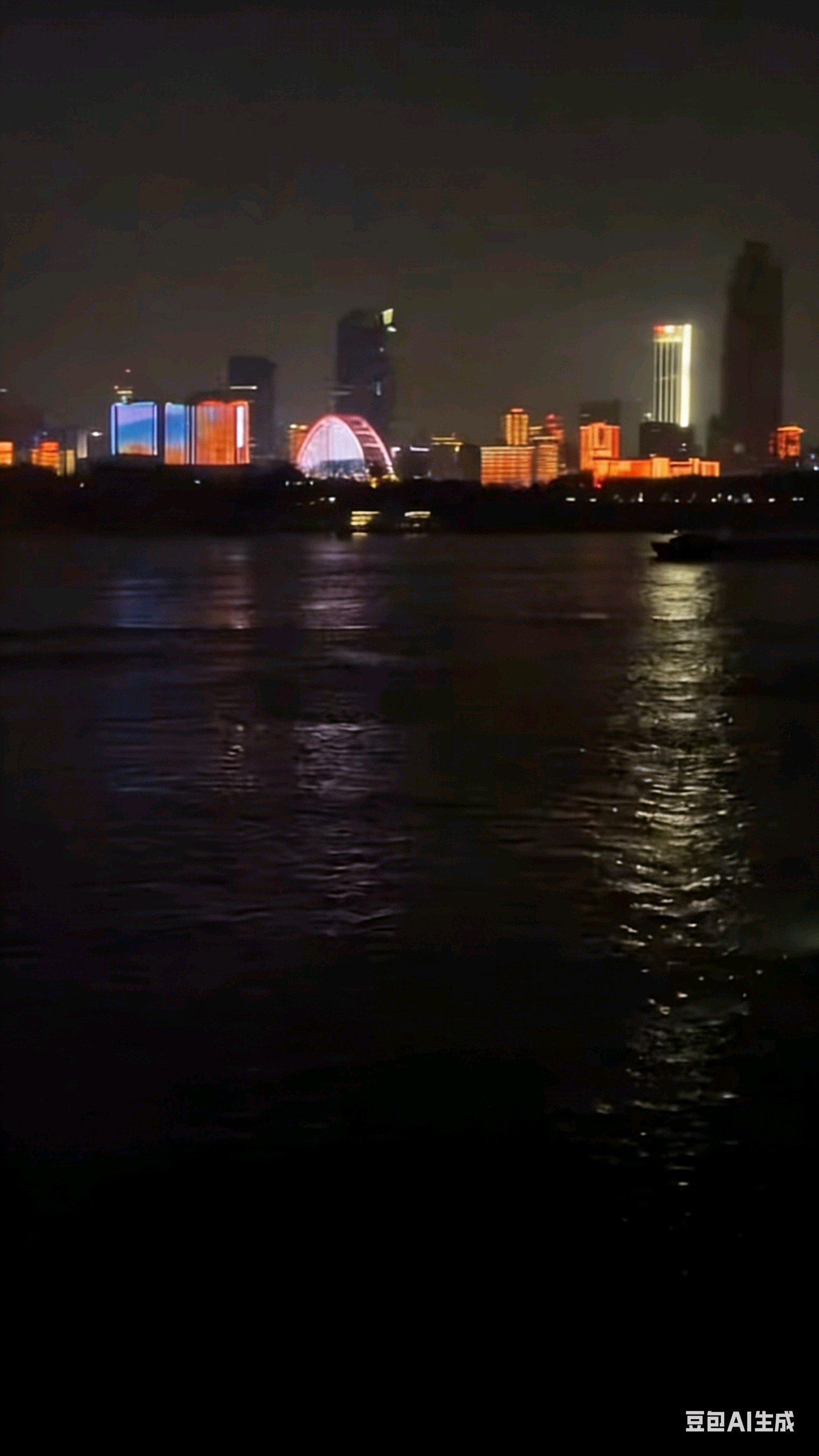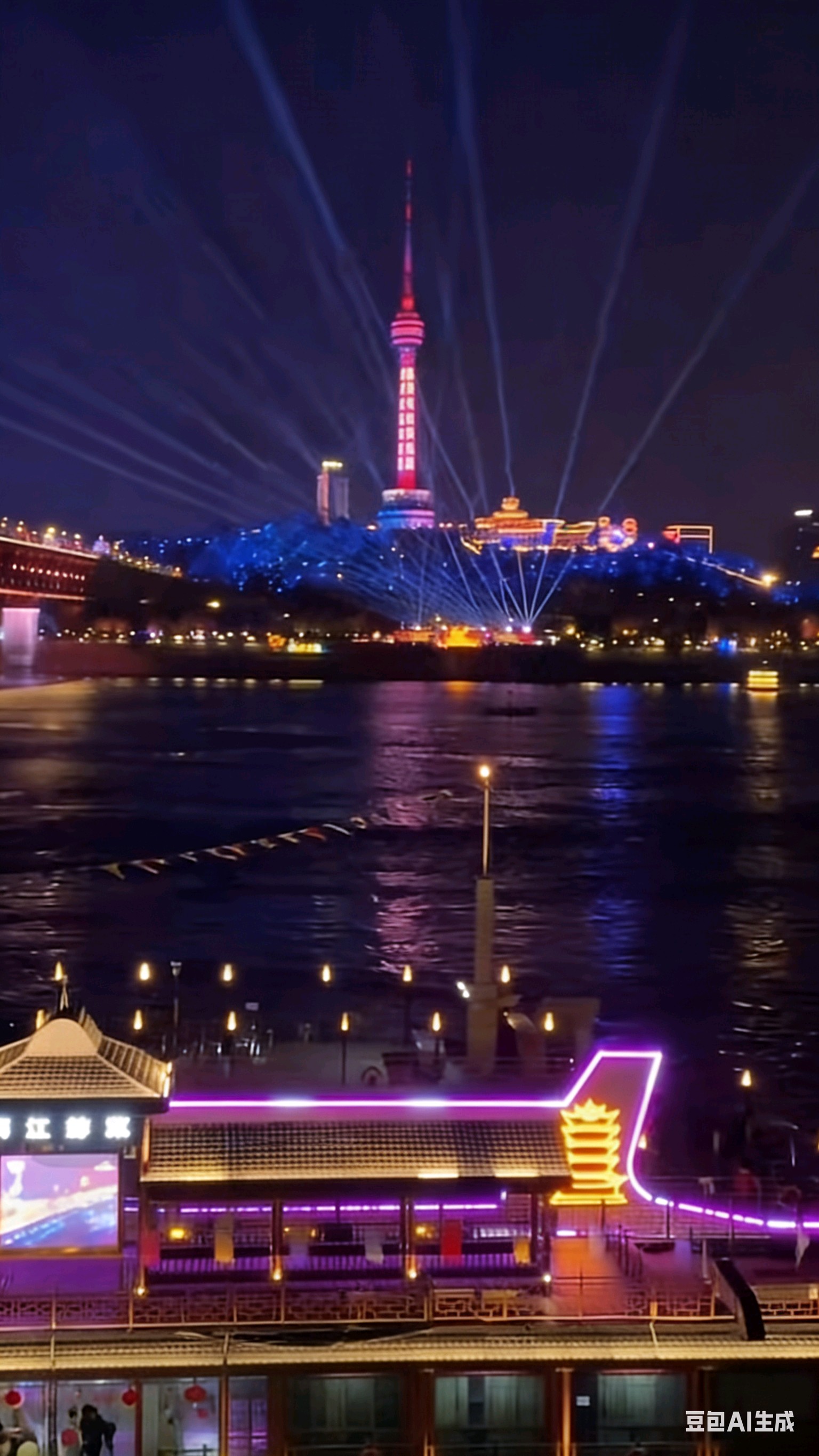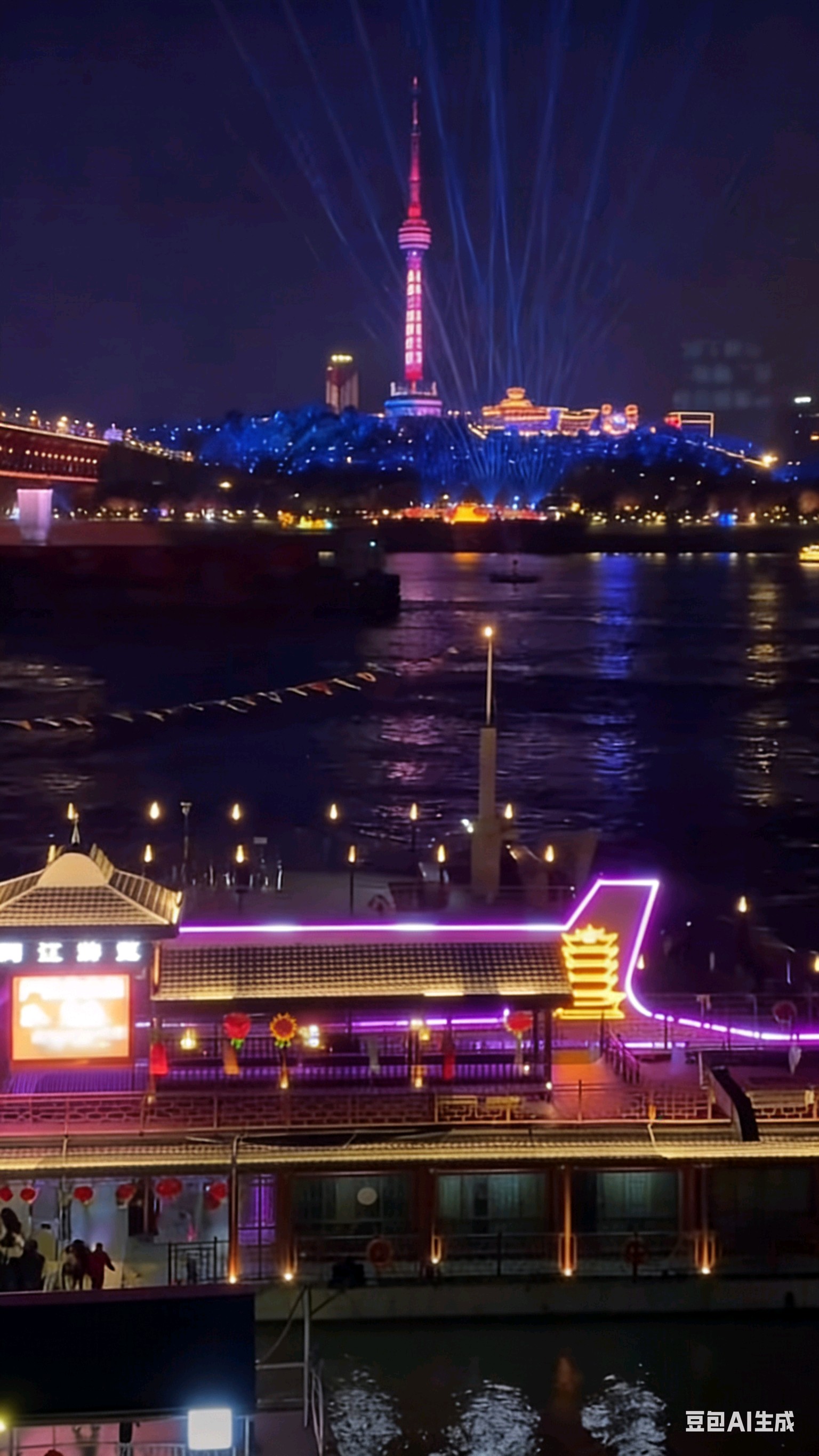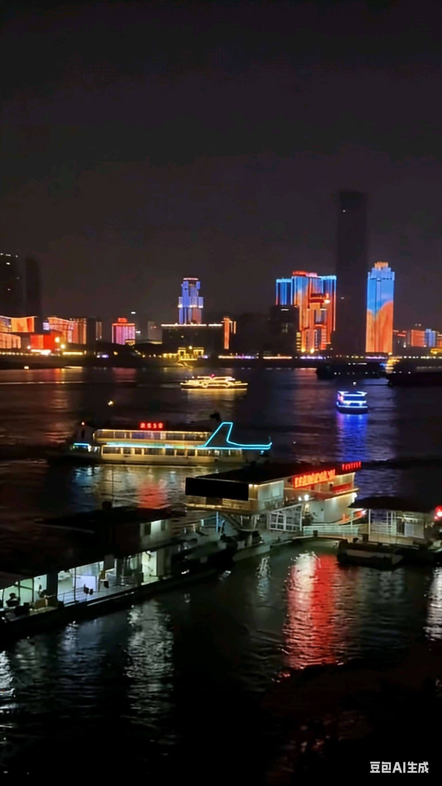 春节期间。黄浦江畔灯光璀璨,江对面的高楼五彩斑斓,江中船舶也都灯火辉煌,整个一幅五彩缤纷的珣丽画卷。