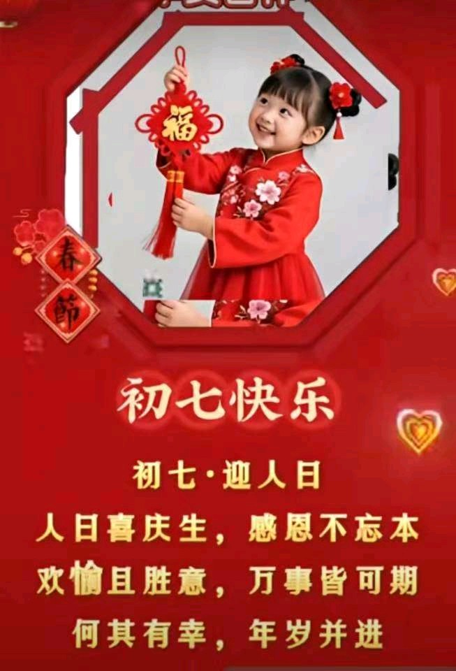 今天是大年初七,又称人日,传说是人的生日。送七喜,天喜,地喜,业喜,财喜,家喜,事喜,人喜,愿新年开门见喜,诸事皆大欢喜,正月初七,万事可期,马年好运,生生不息。