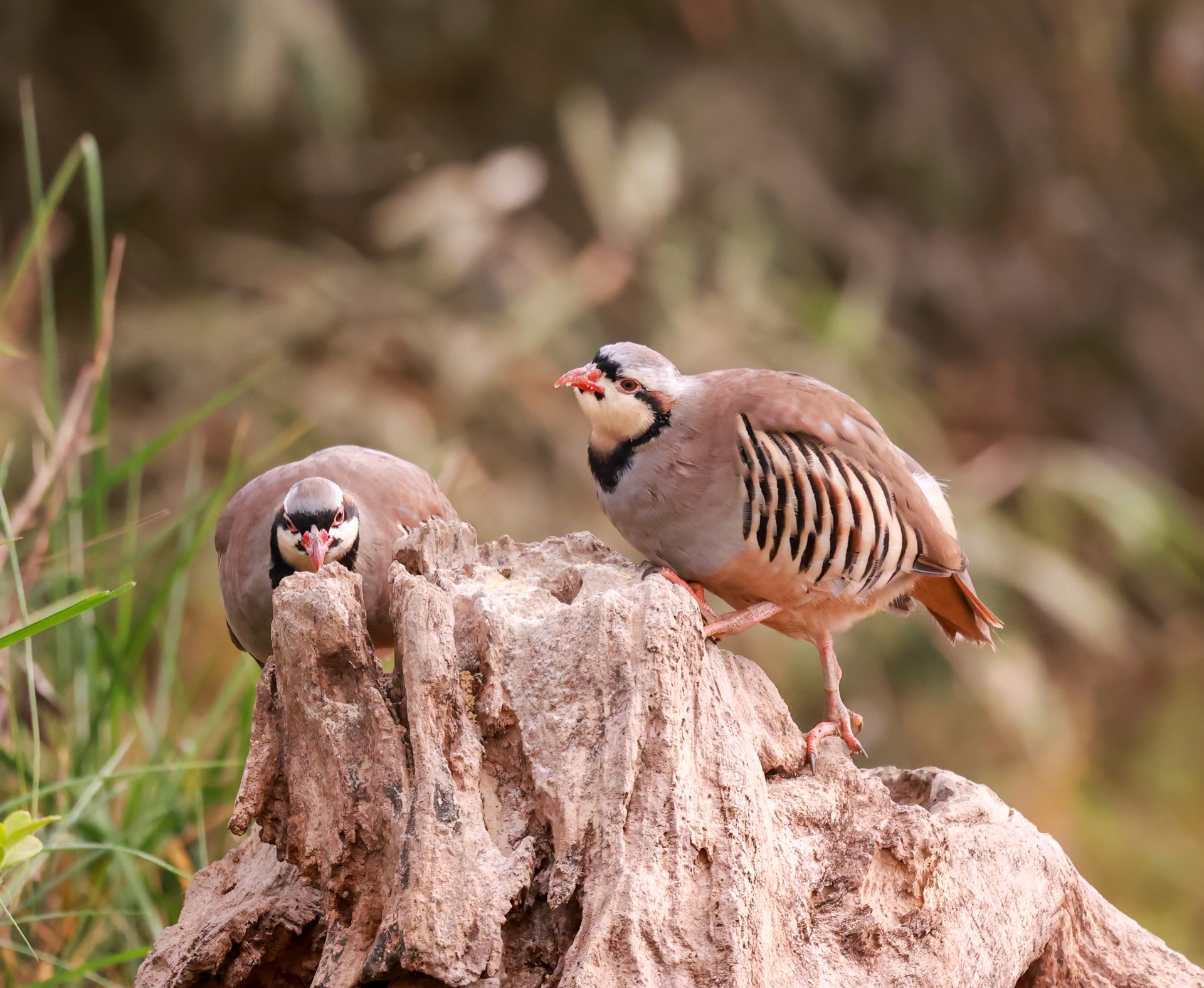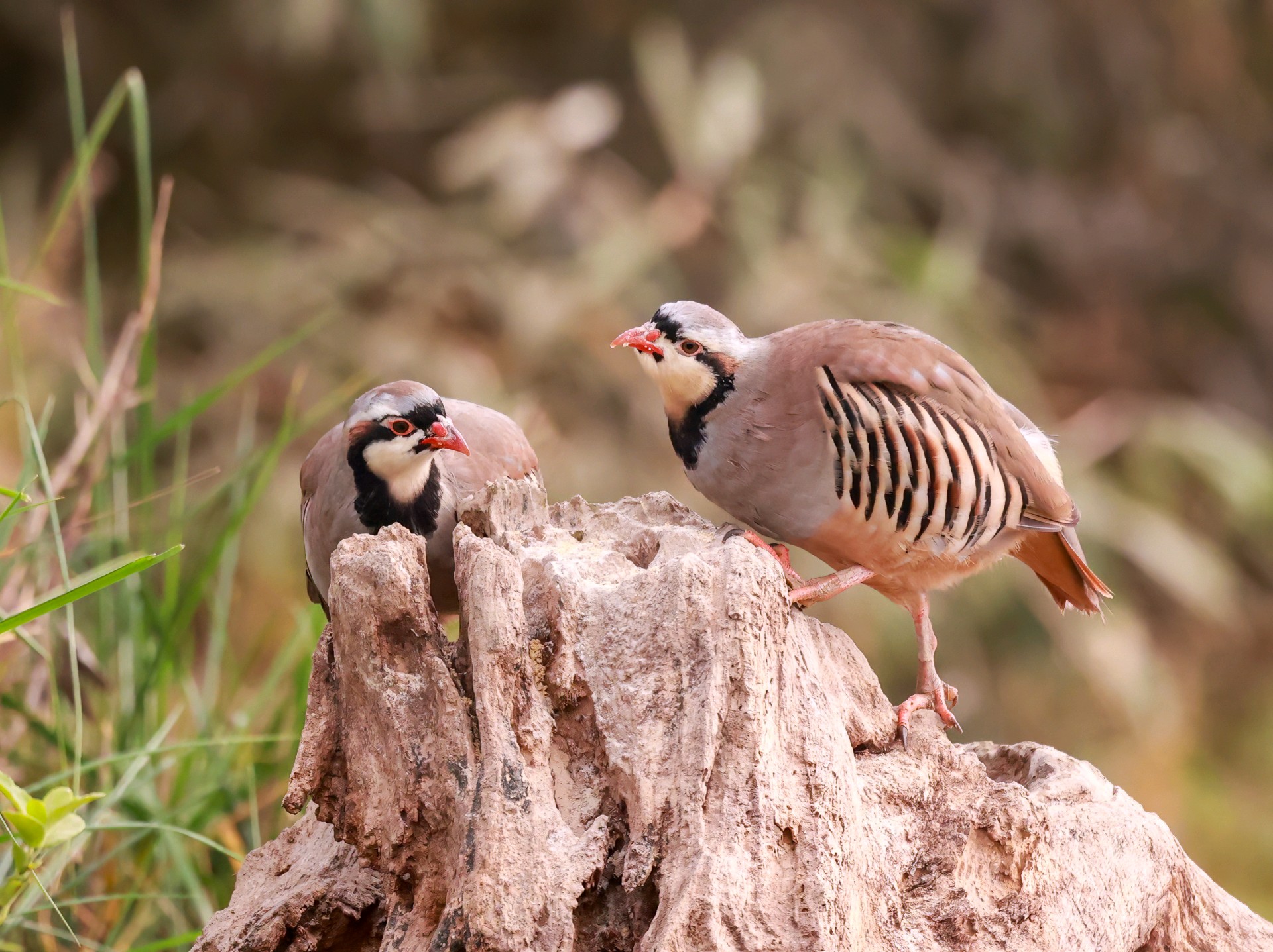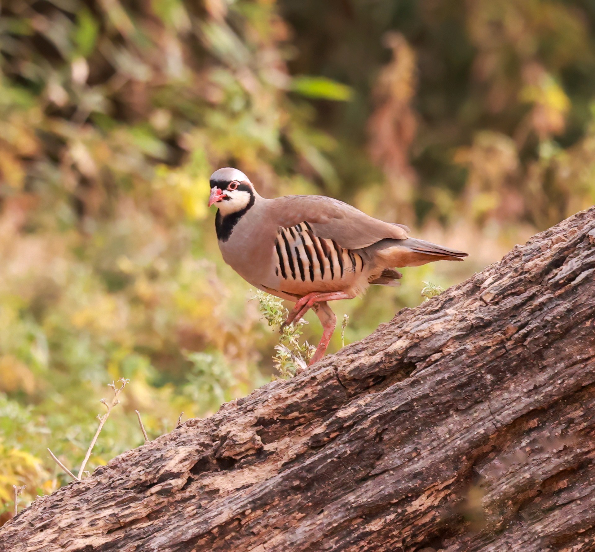 美丽可爱的小鸟石鸡欣赏它有醒目的黑色眼线,从额头穿过眼睛再向下弯到喉部,像画了漂亮的“眼影”。两胁羽毛有黑白相间的横斑,像斑马的纹路,在鸟类中堪称经典。喙和眼圈周围是鲜红色,爪子也是红色,像涂了口红,气色很好。体型敦实圆滚,看起来总是一副吃饱喝足的满足模样。石鸡特别擅长爬山奔跑,警觉时会把脖子伸直,站得笔直,样子很逗趣。