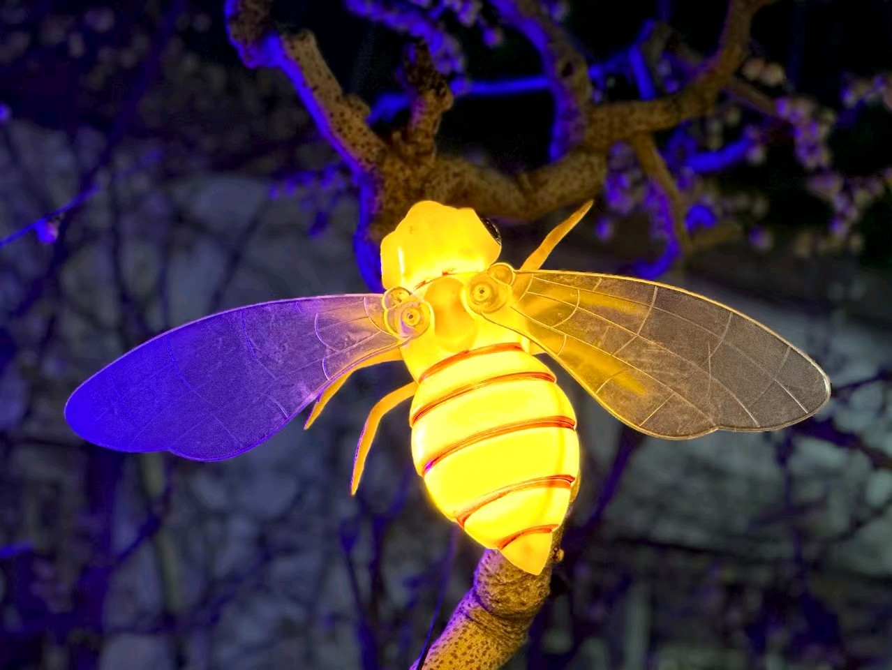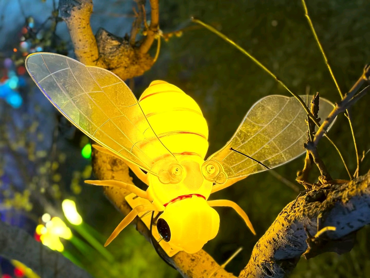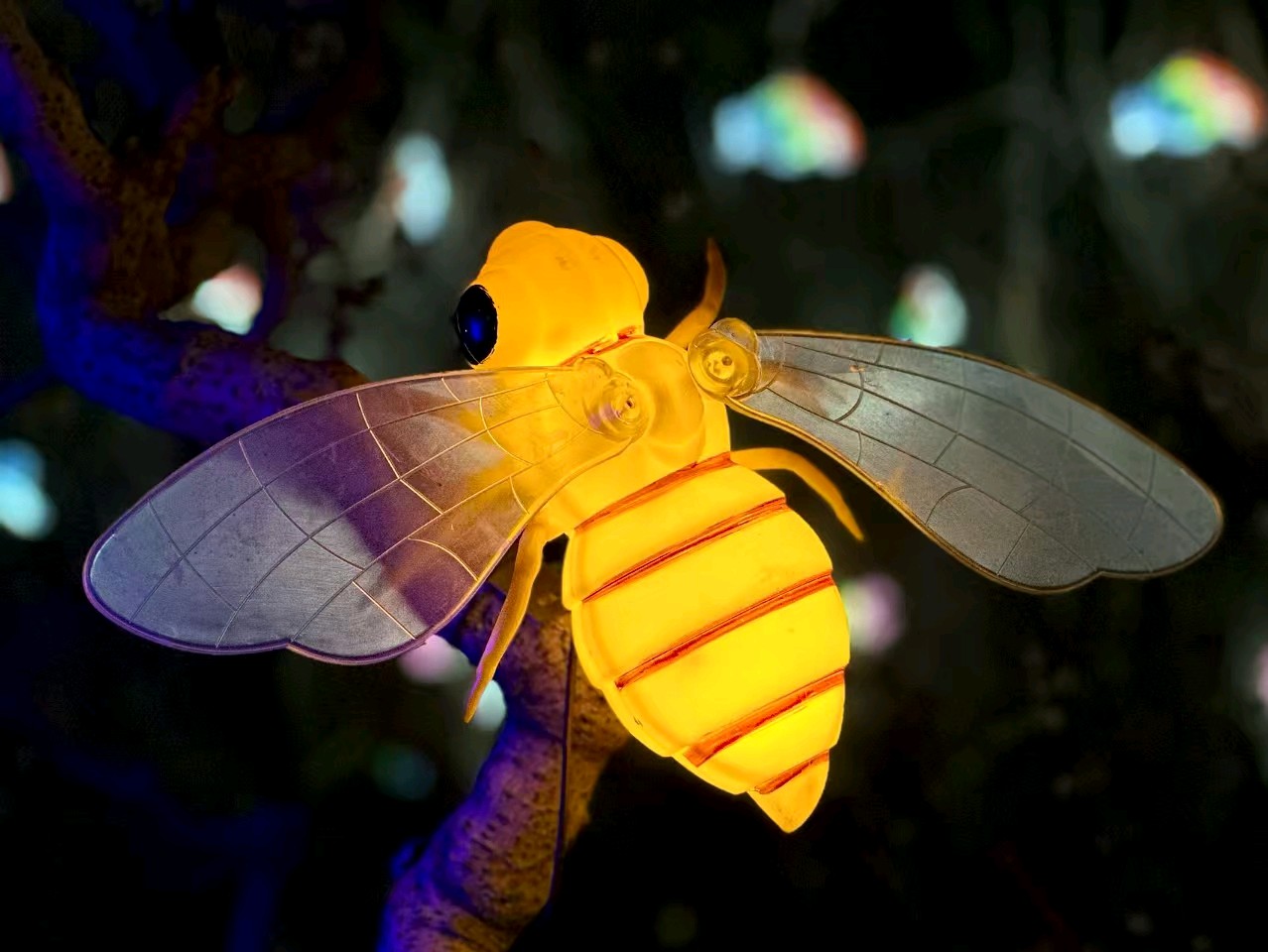 各种颜色鲜艳的的小昆虫十分有趣!发光的蜜蜂停留在树枝上,周围是五彩斑斓的灯光。它透明的翅膀和身体发出金黄色的光芒,煞是可爱!