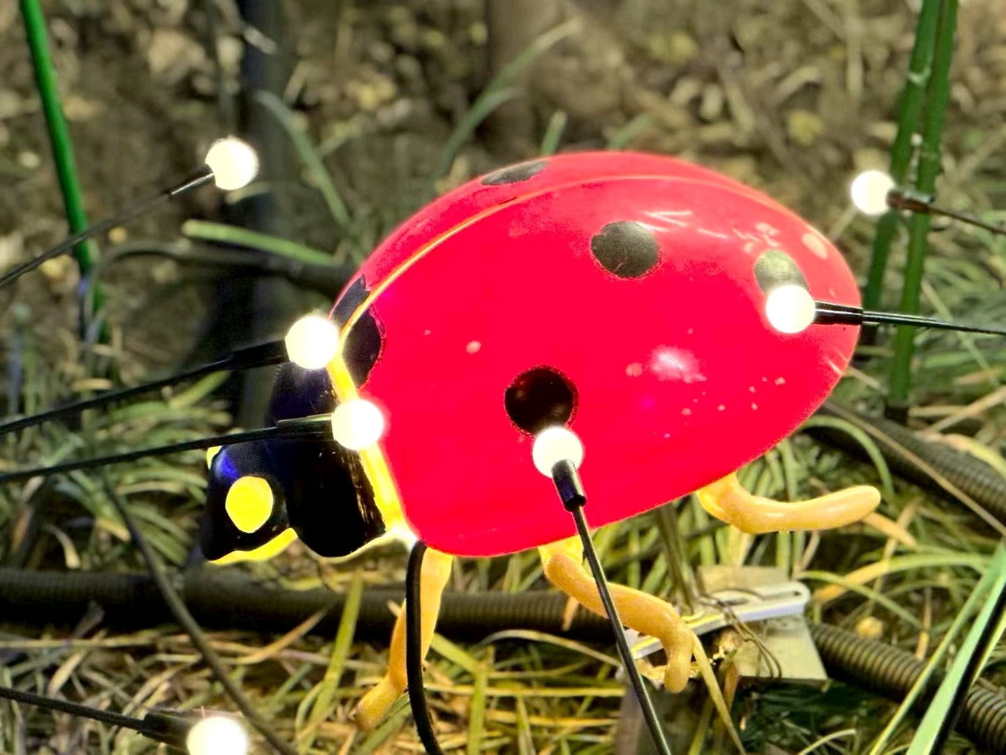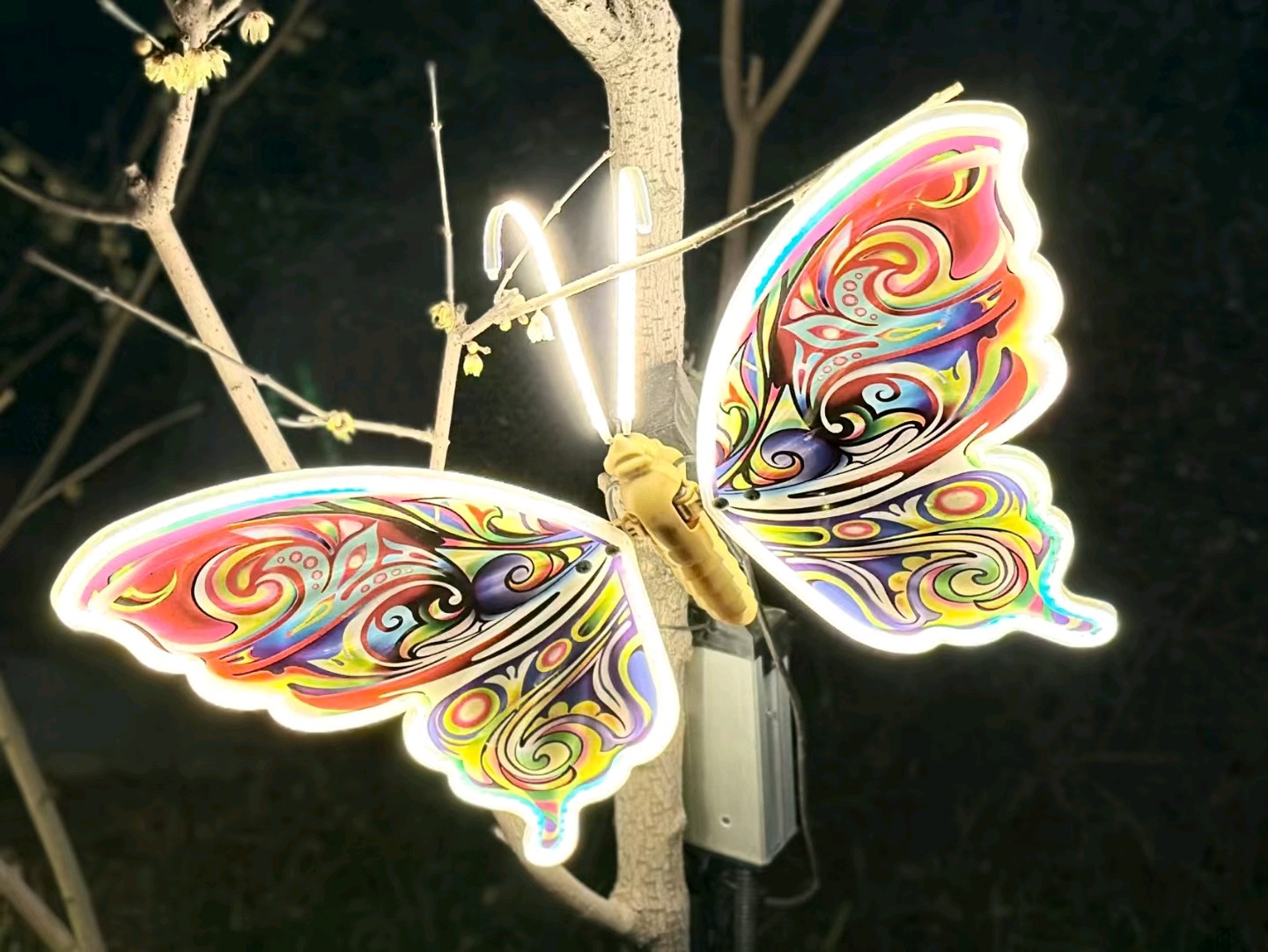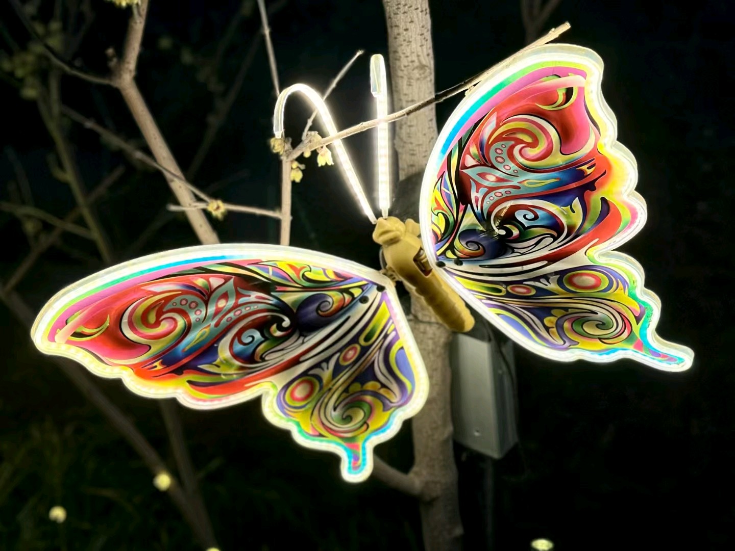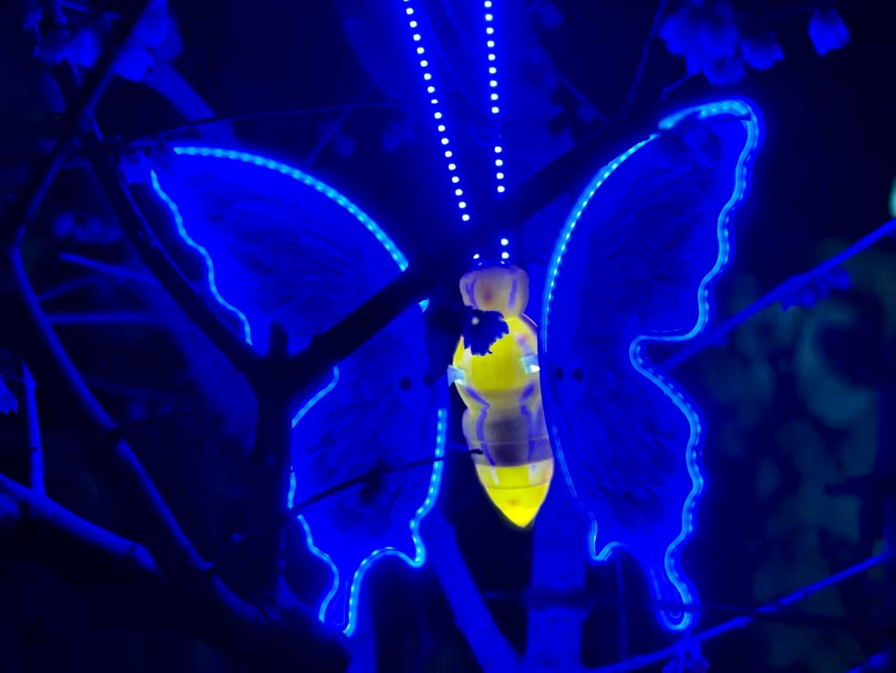各种颜色鲜艳的的小昆虫十分有趣!发光的蜜蜂停留在树枝上,周围是五彩斑斓的灯光。它透明的翅膀和身体发出金黄色的光芒,煞是可爱!
