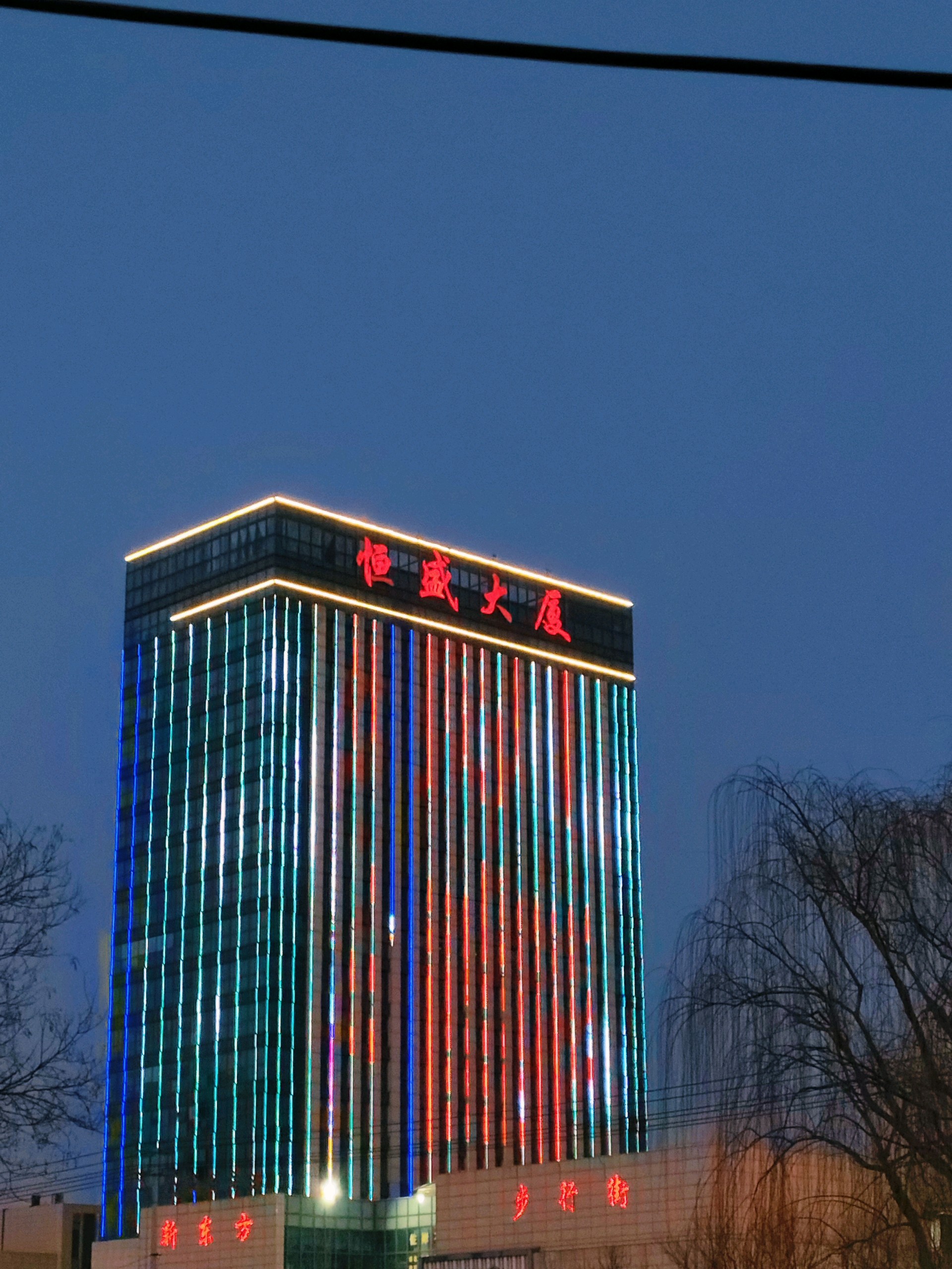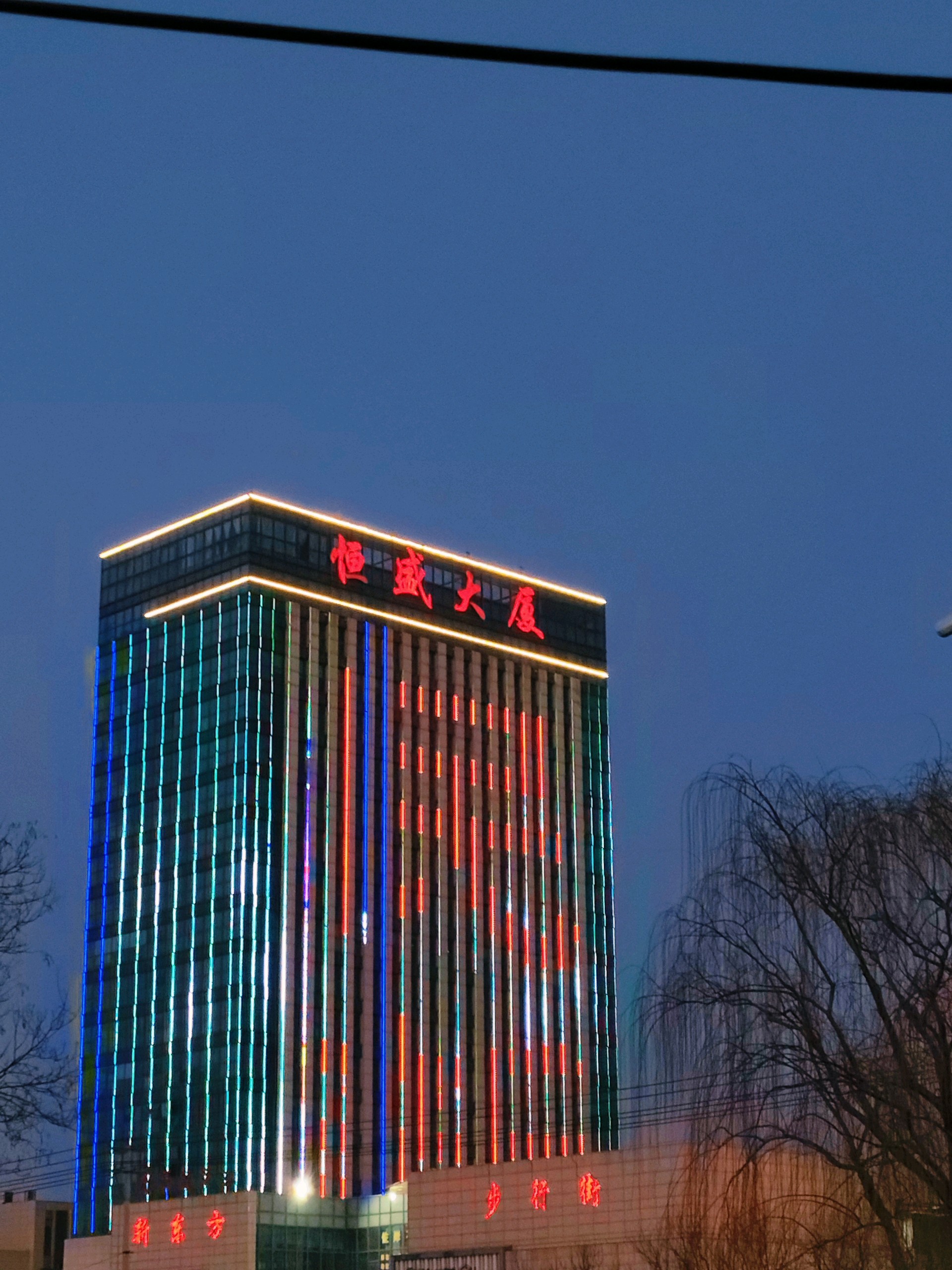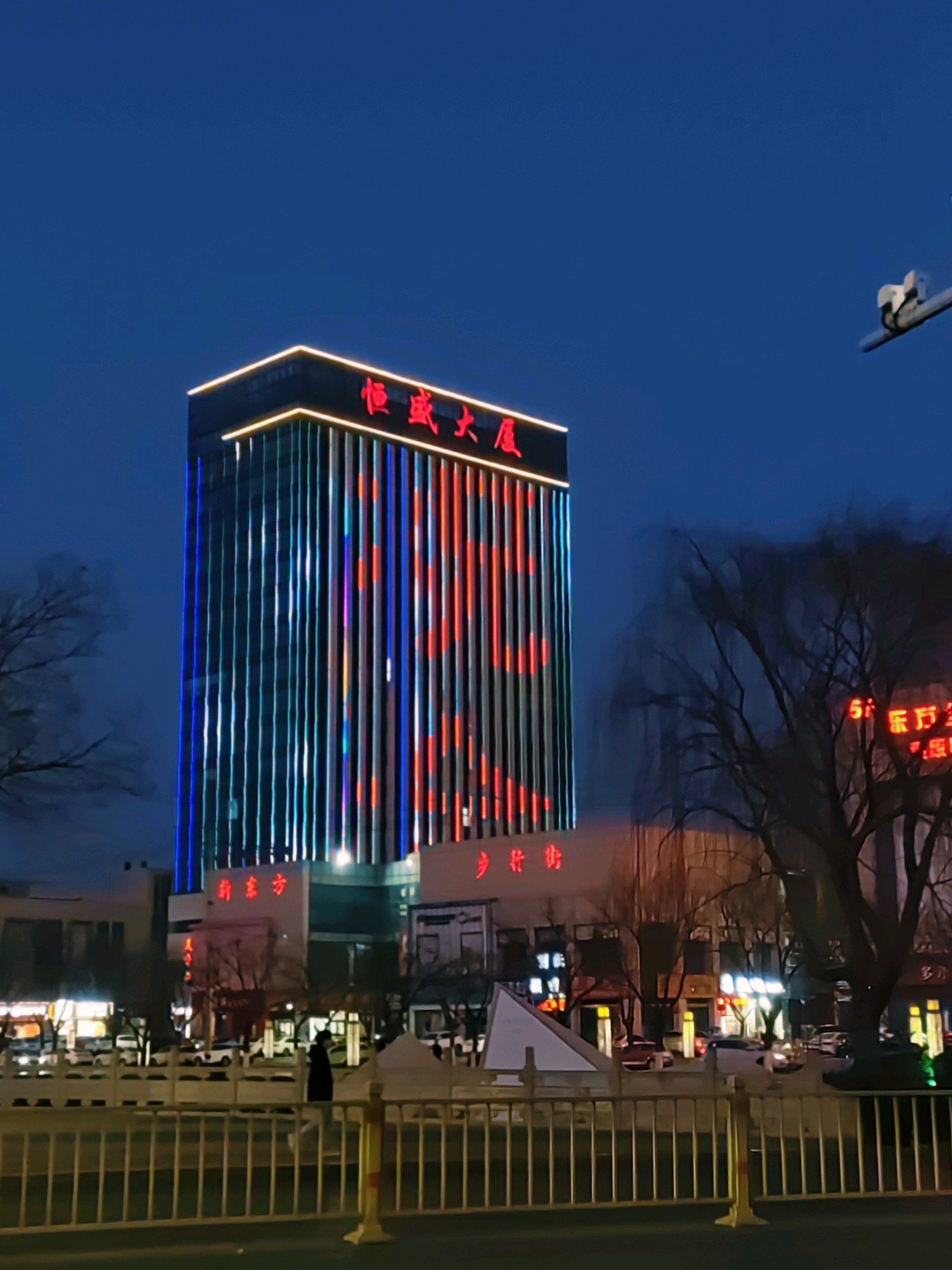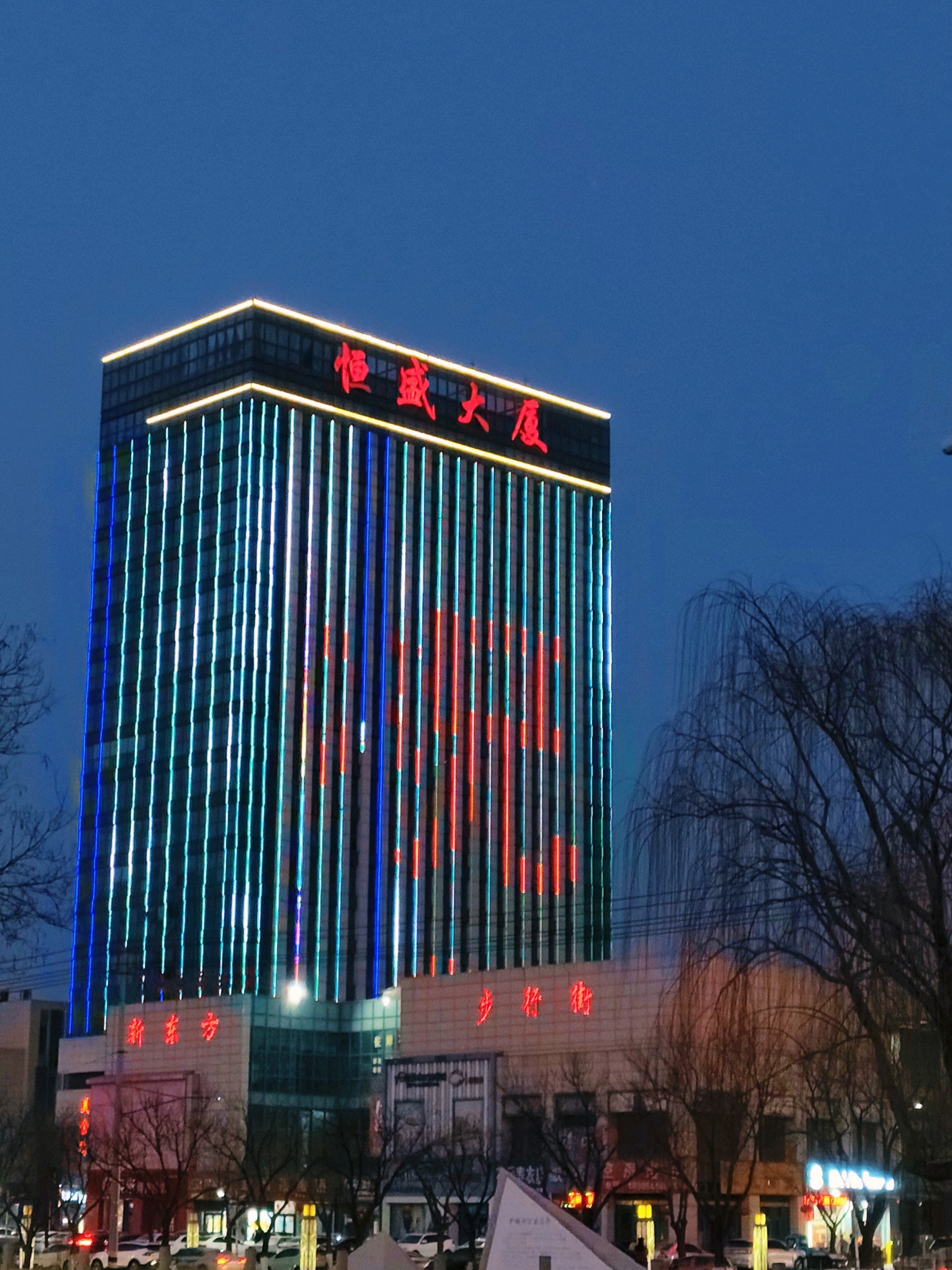 小城有这样一座建筑,它高耸入云,灯火通明,这就是恒盛大厦。每逢春节,总是轮播适时应景的祝福语。