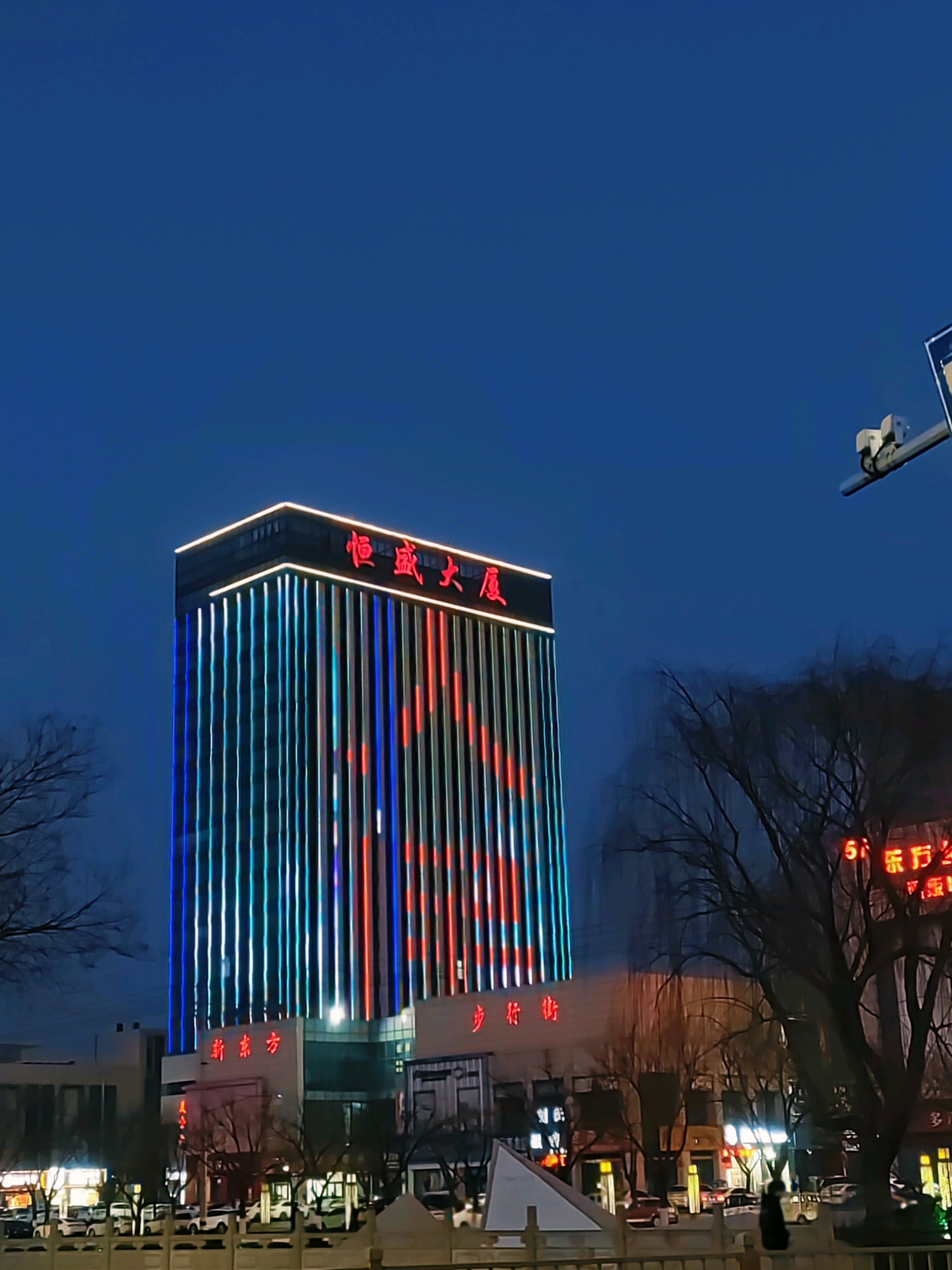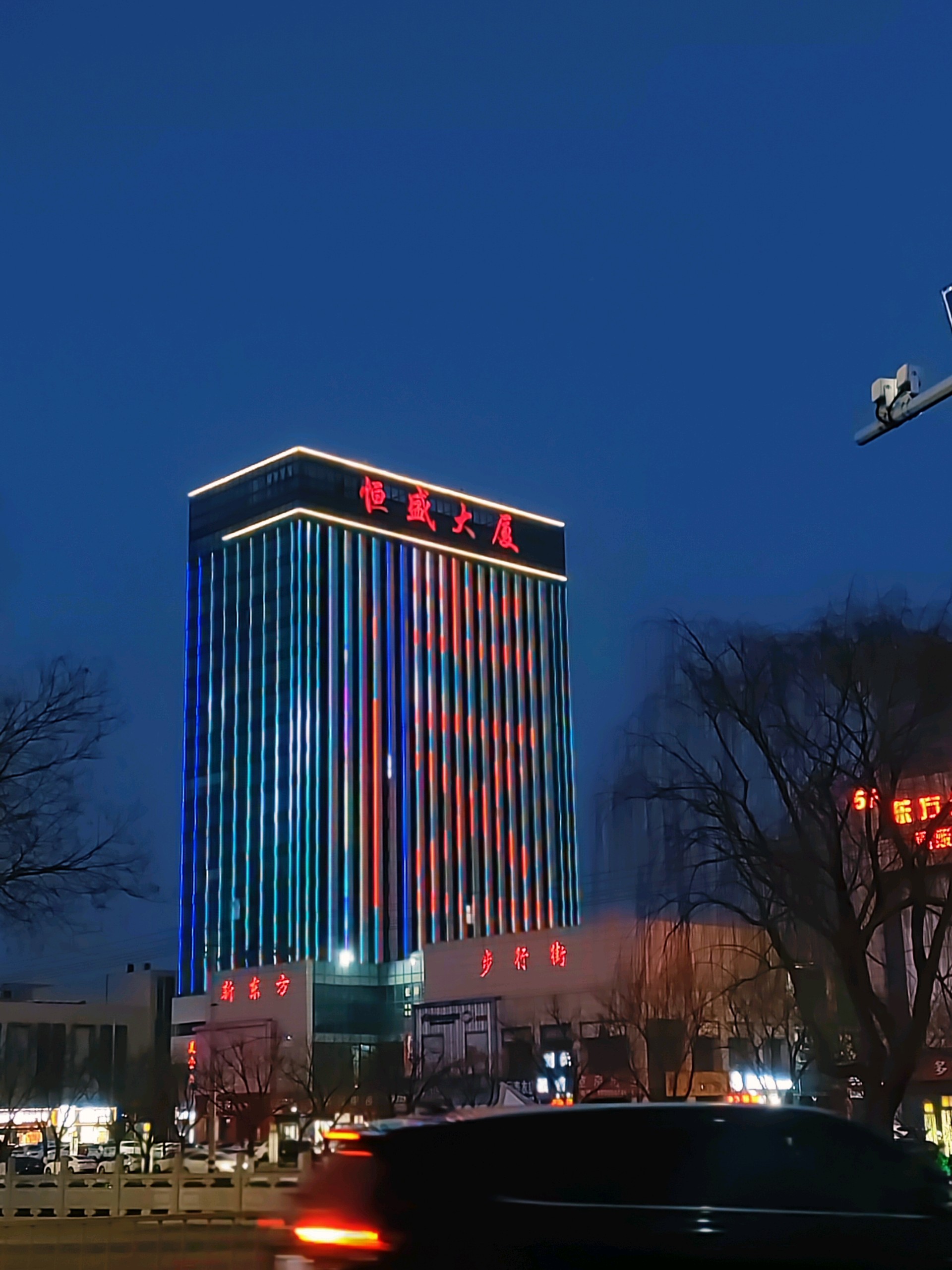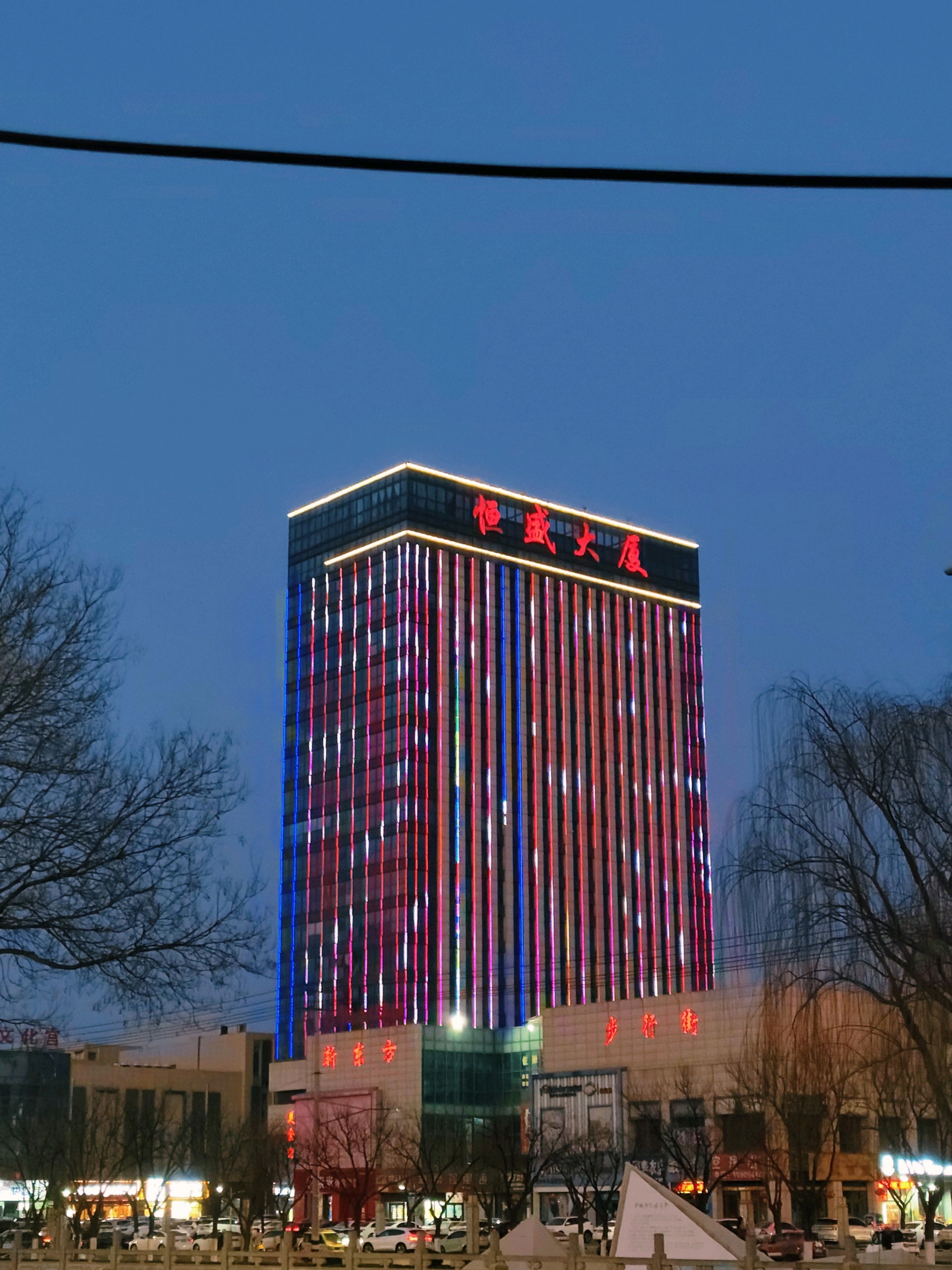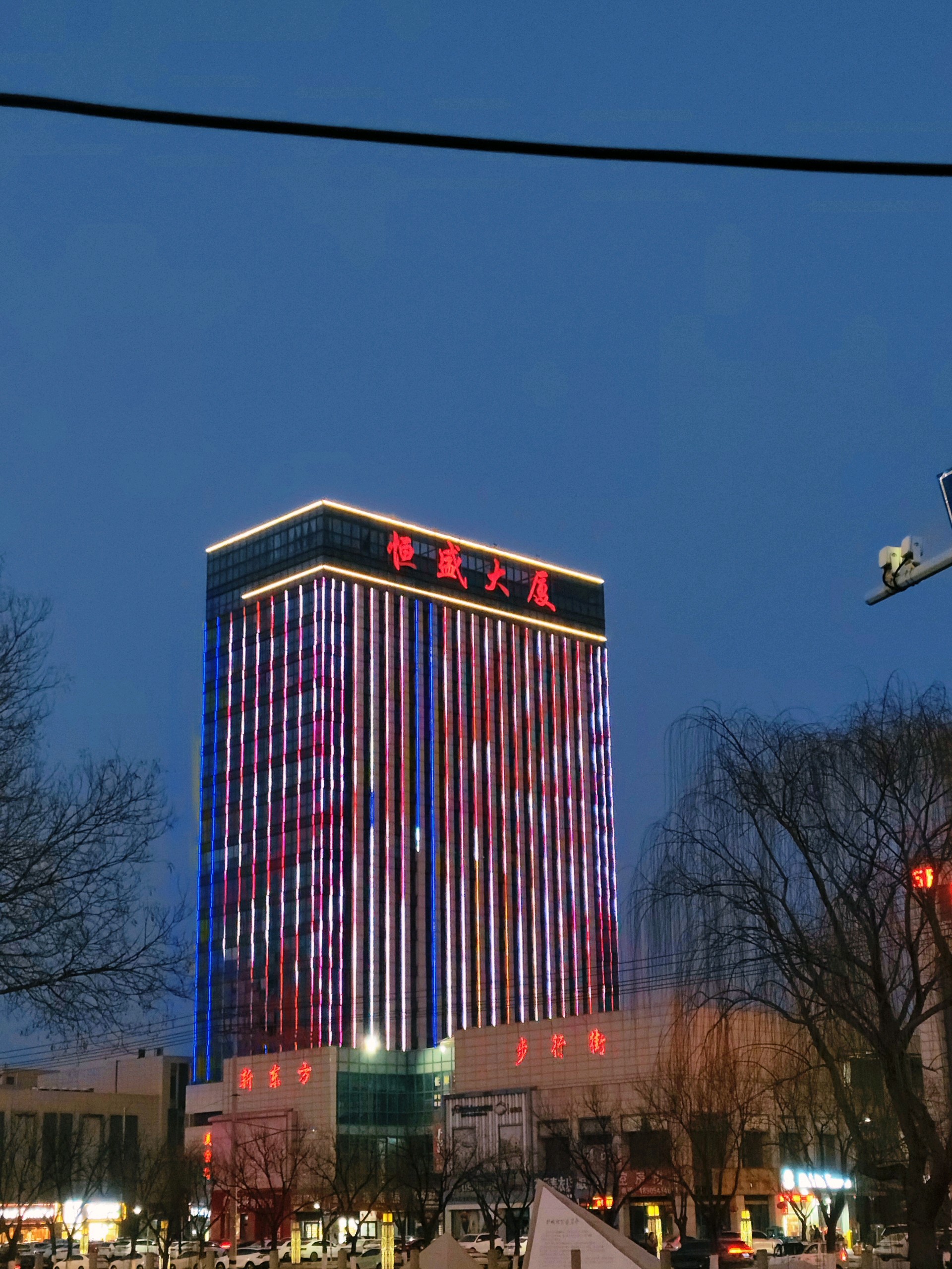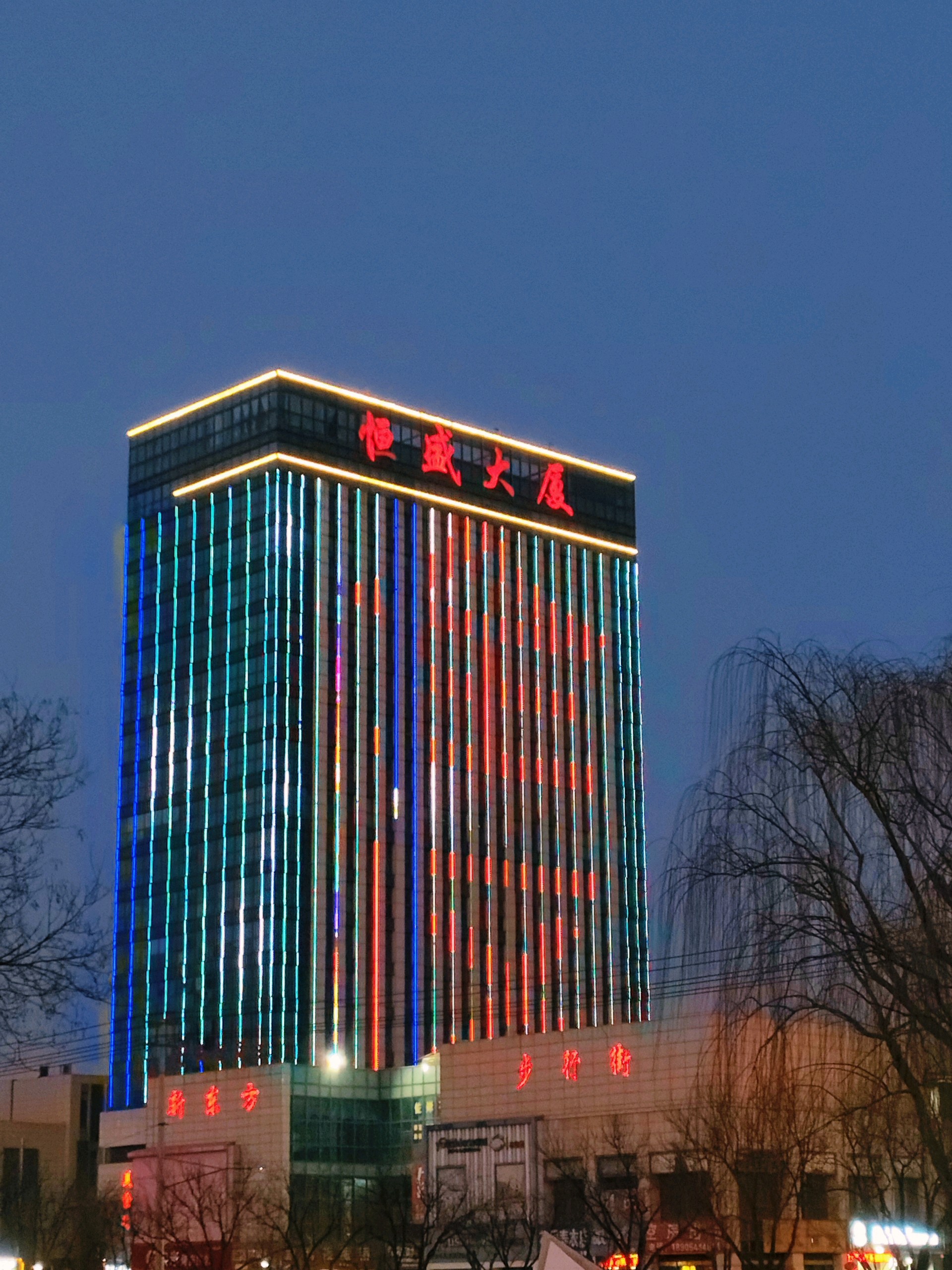 小城有这样一座建筑,它高耸入云,灯火通明,这就是恒盛大厦。每逢春节,总是轮播适时应景的祝福语。