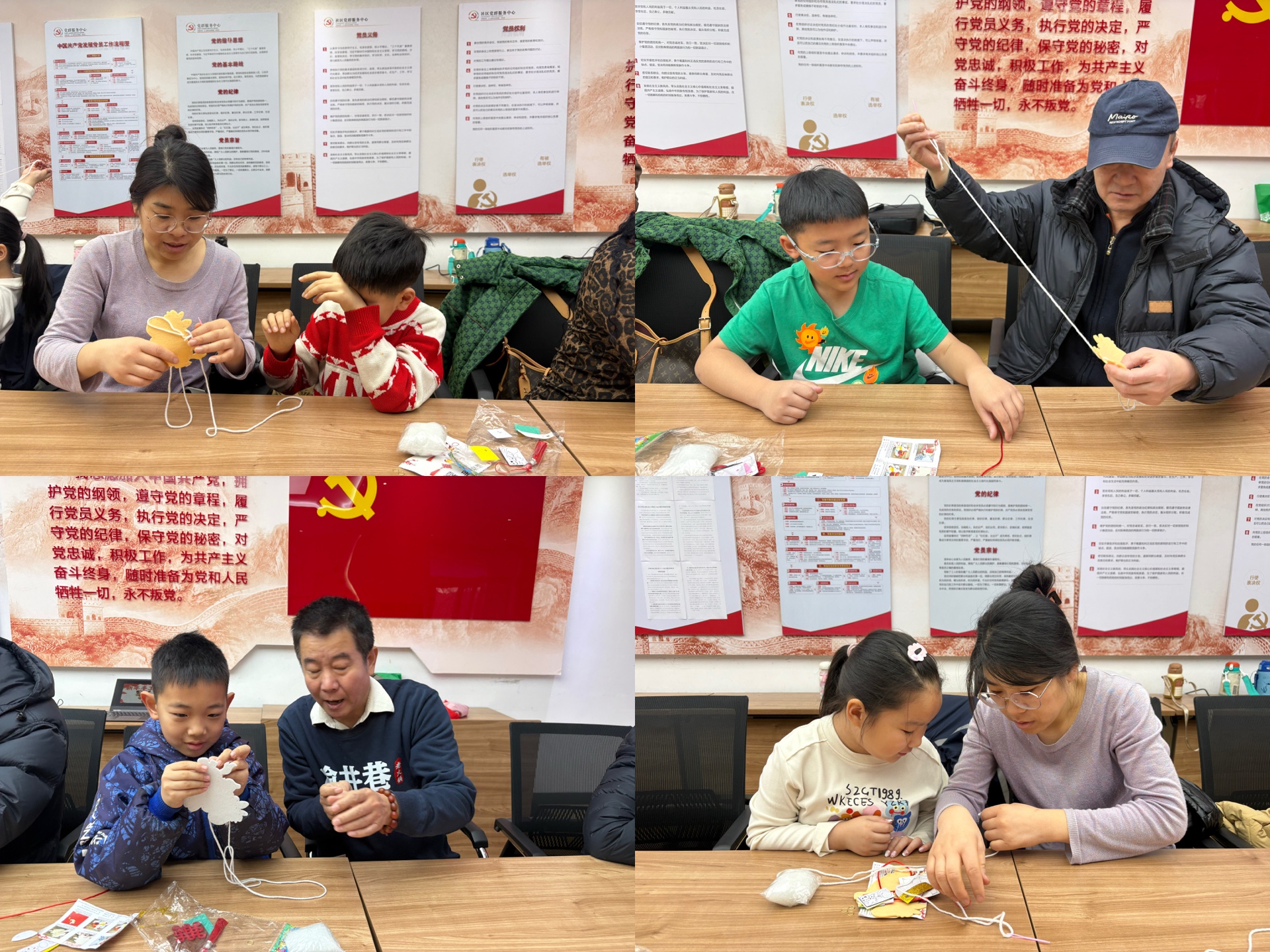 活动现场,社工总站社工与北村社工站社工分工协作,耐心讲解小马缝制步骤,手把手指导家长和孩子穿针引线、填充棉花、装饰造型。家长与孩子默契配合,一针一线勾勒小马轮廓,原本零散的材料在亲子协作中变成了一个个寓意吉祥的手工小马。活动间隙,社工还引导家庭相互交流创作心得,搭建邻里沟通桥梁,进一步融洽社区氛围。