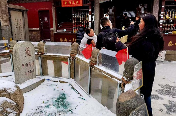 这场春雪不仅是一场视觉盛宴,也折射出人们对自然瞬间的重新发现与迷恋。 它让泰山在初春时节展现出“老友忽然穿了婚纱”般的陌生惊艳,将雄浑与柔美、永恒与短暂奇妙地融合在一起。置身于这银装素裹的峻峭景色之中,能让人在自然的静谧与壮美前放缓脚步,品味生命返璞归真的意境。