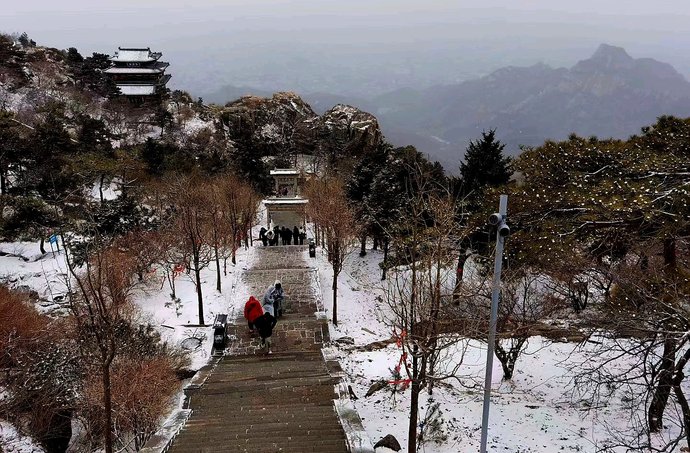这场春雪不同于冬日的凛冽,它带着春日的温润,如柳絮般轻盈飘落,将千年石阶染成银白画卷。