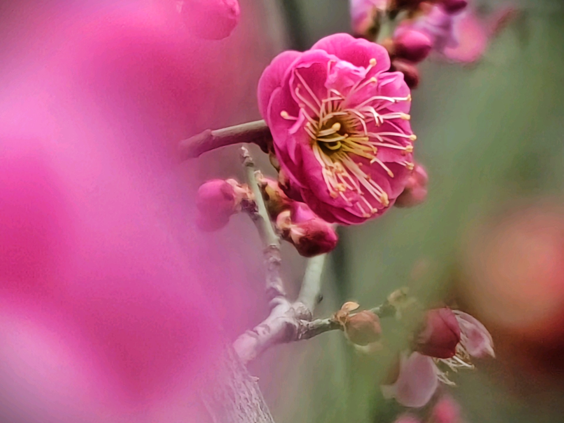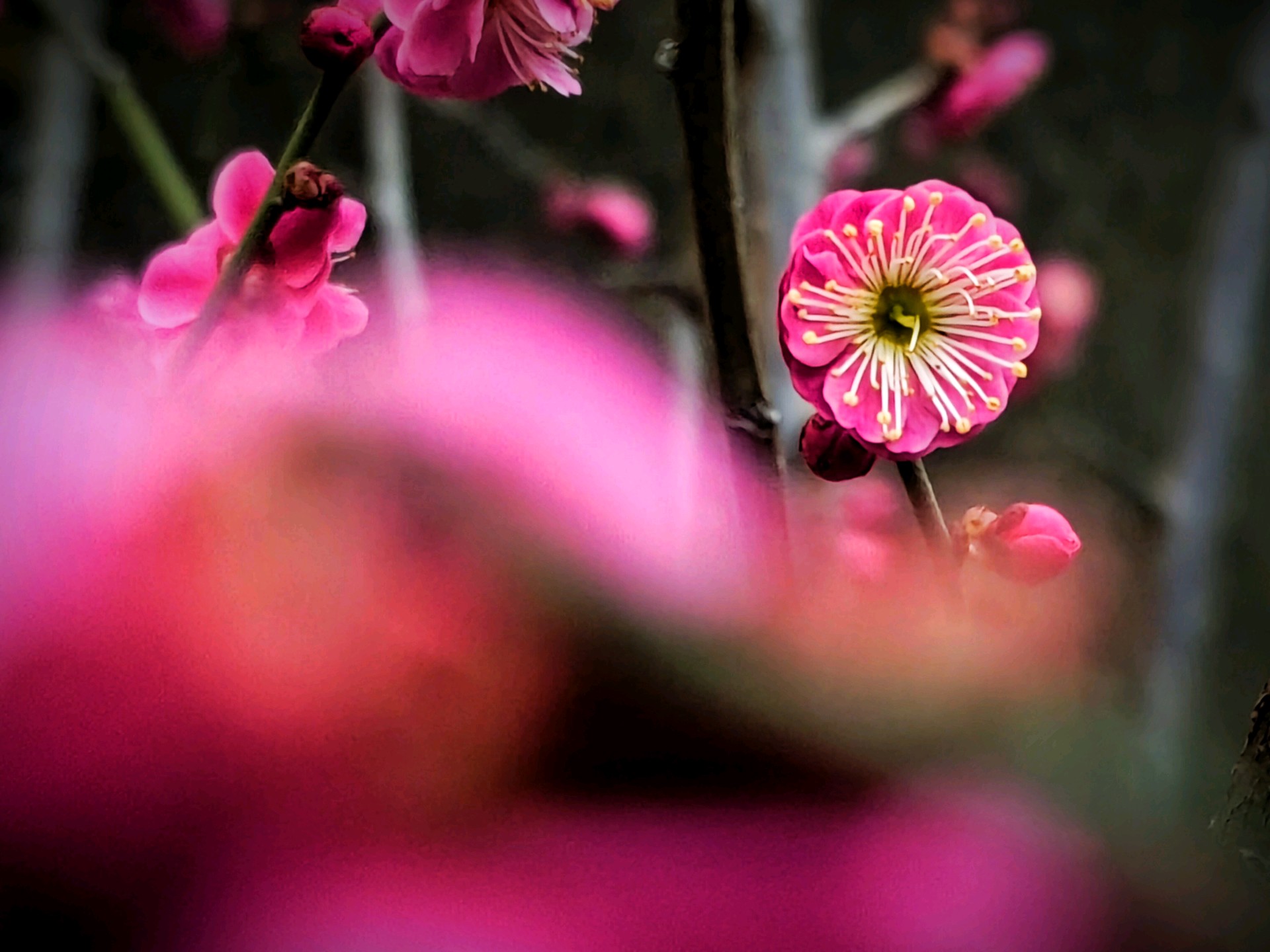 看呐,宫粉梅红得像火,好似烈焰在枝头熊熊燃烧,十分惹人注目。满树的花朵形态各异,那些舒展着花瓣的,大大方方地展露着自身的美丽;而小巧的花骨朵,透着一股俏皮可爱劲儿。