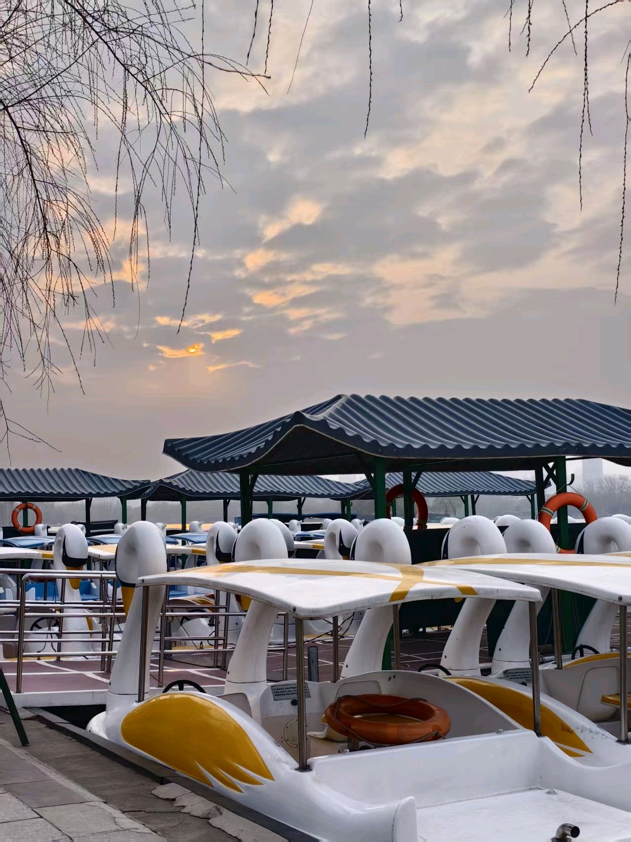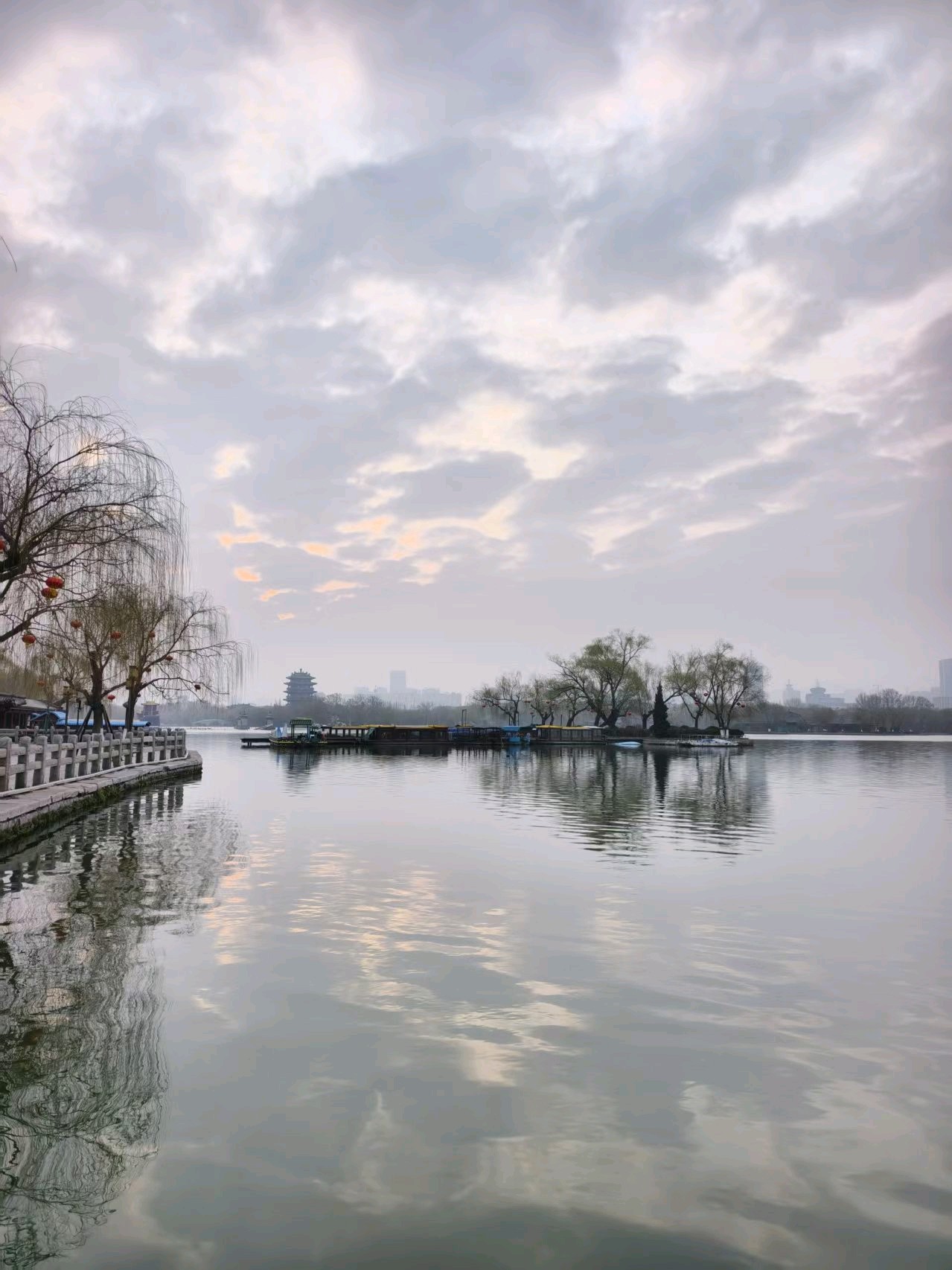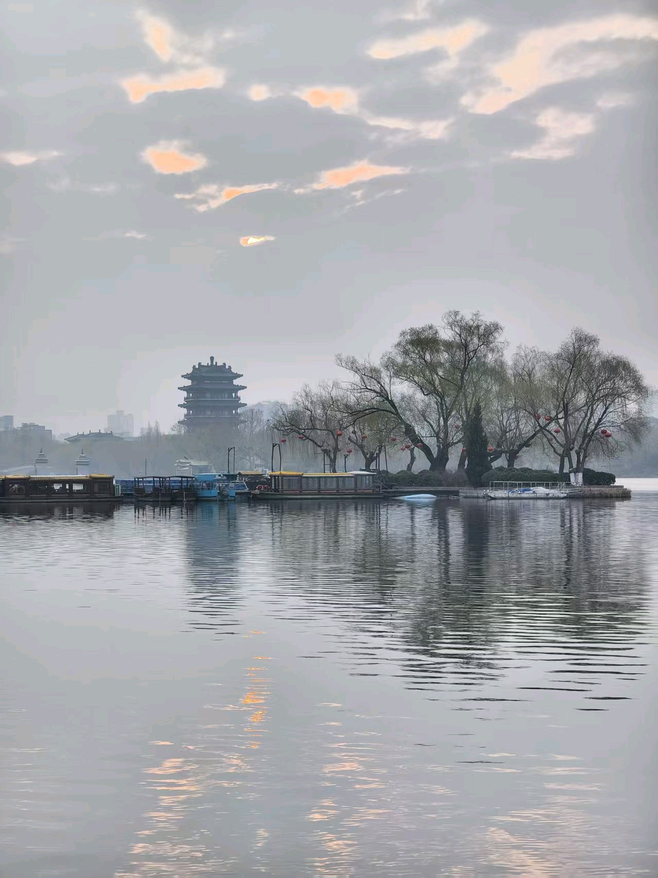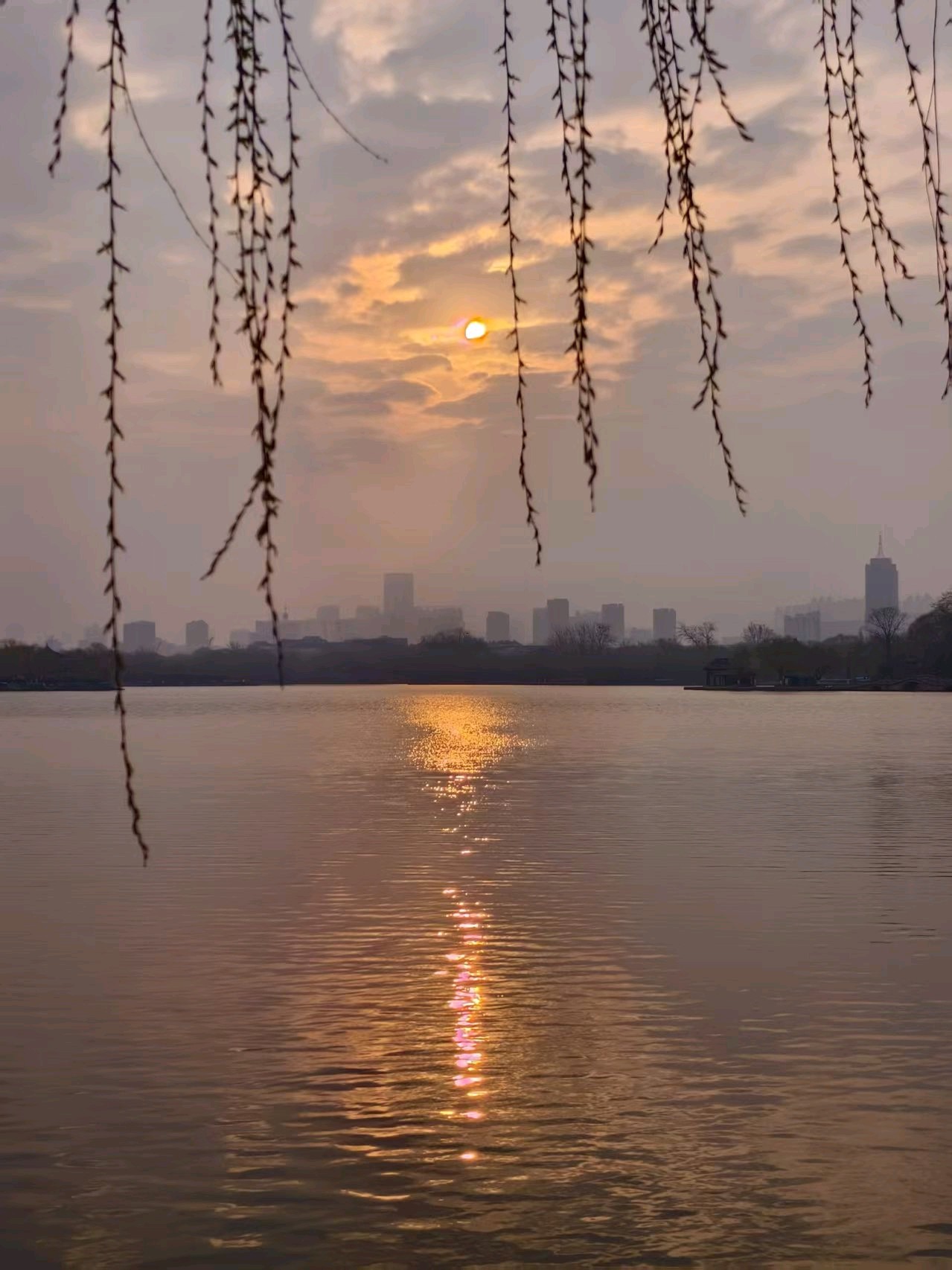 湖畔柳垂吐新绿,云卷云舒,日出东方,金光灿灿,放眼望去,如同油画一般的美丽。令人流连忘返。