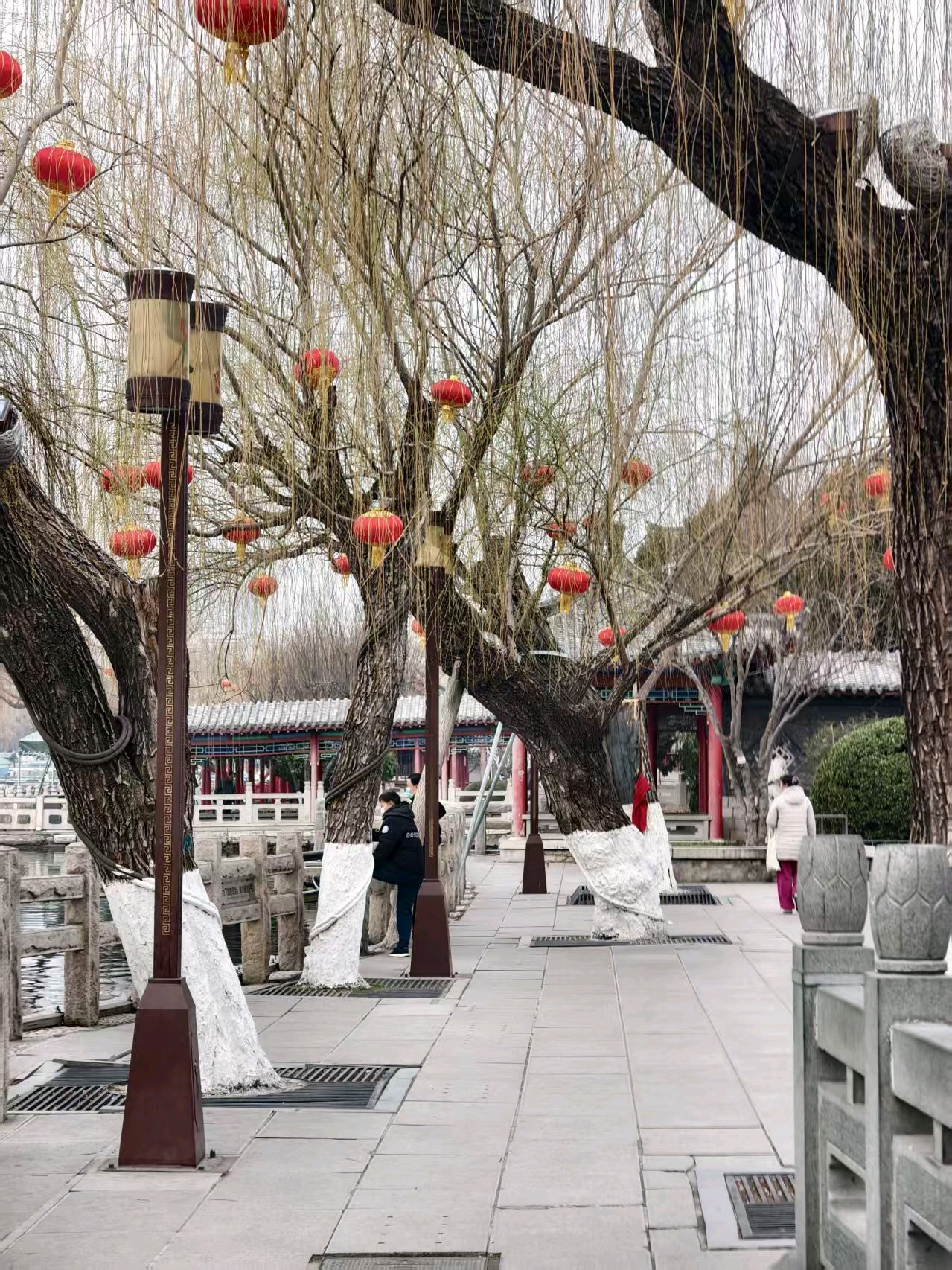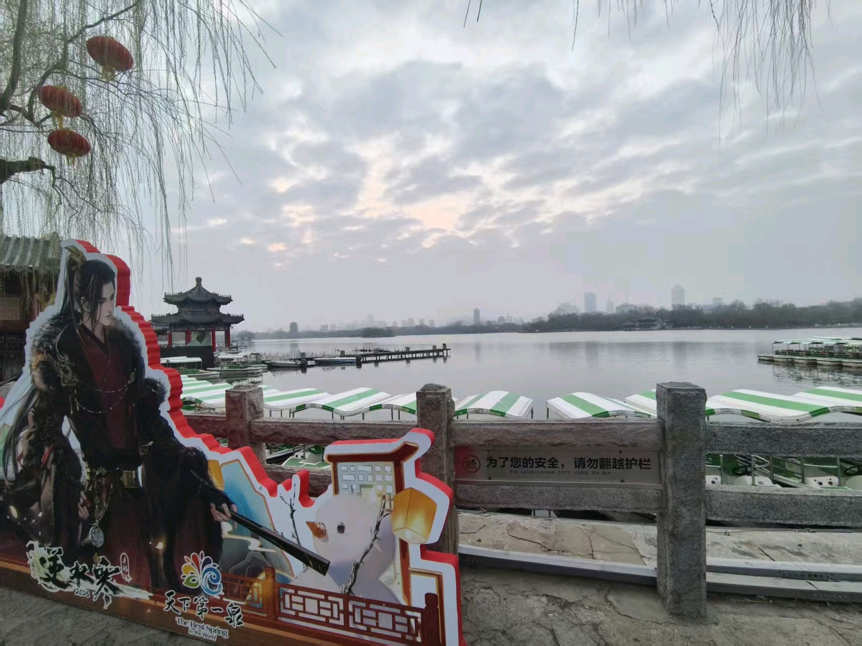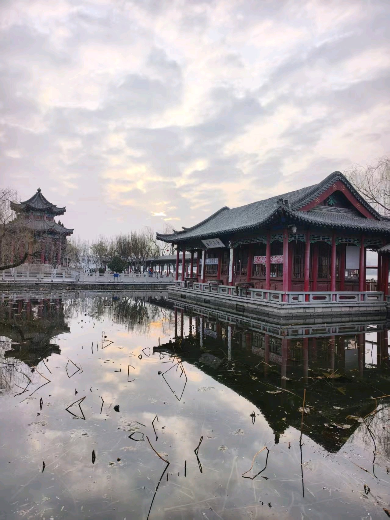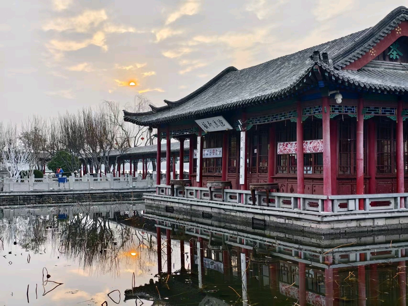 湖畔柳垂吐新绿,云卷云舒,日出东方,金光灿灿,放眼望去,如同油画一般的美丽。令人流连忘返。